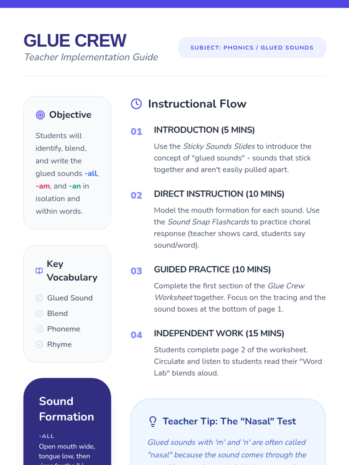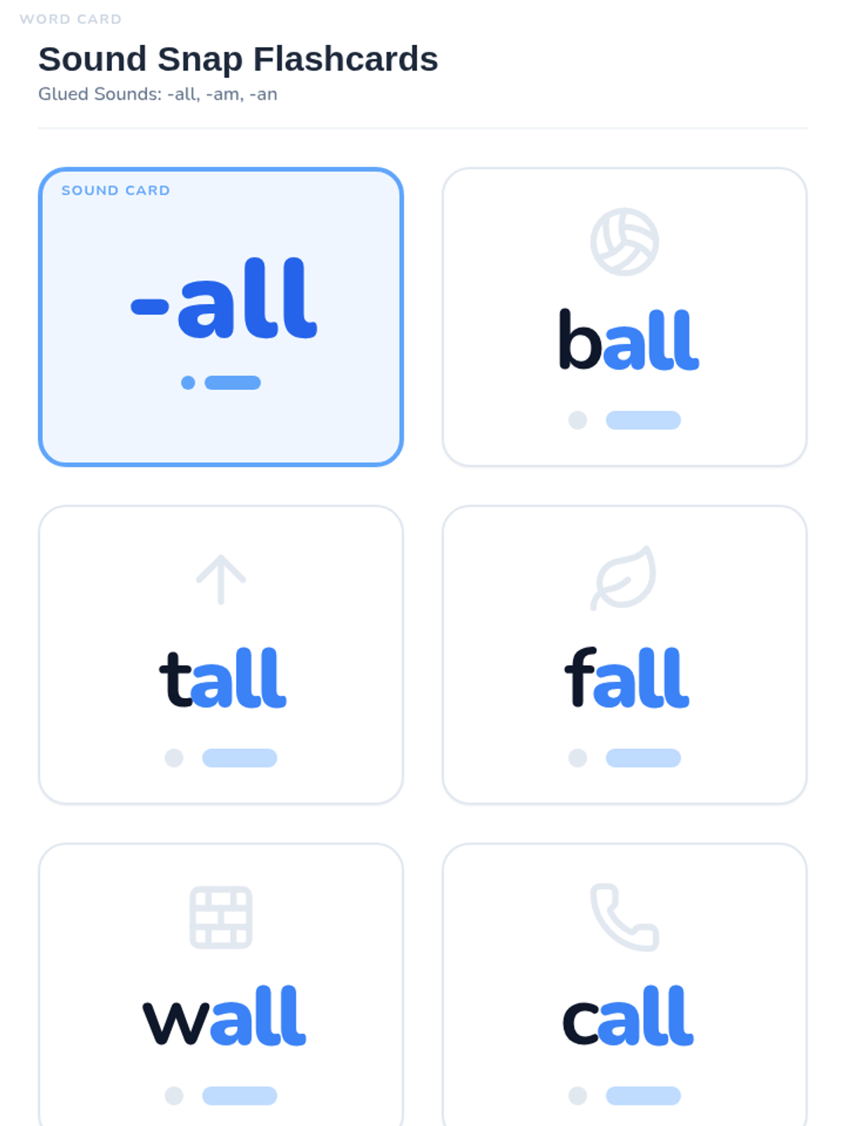 A foundational phonics lesson focusing on the glued sounds -all, -am, and -an through visual aids, tracing practice, and blending activities.