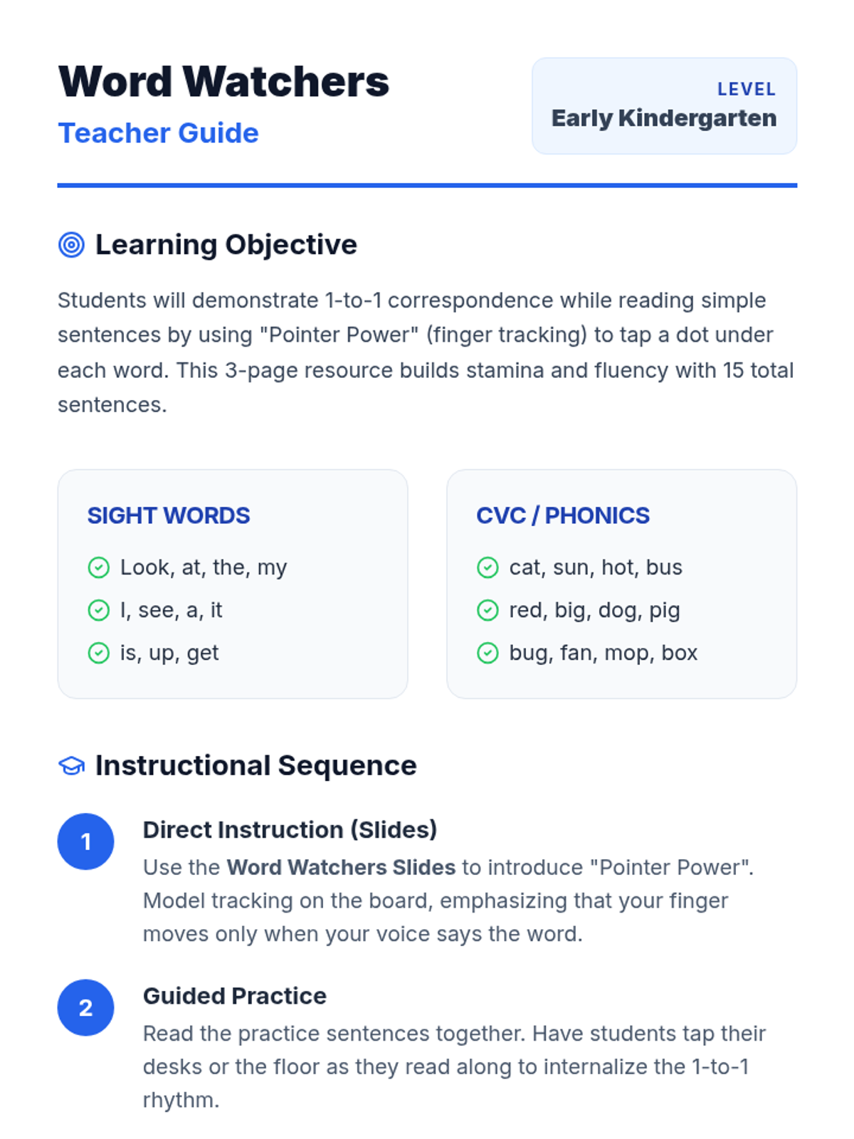 A foundational lesson for early kindergarten readers focusing on word-by-word tracking, sight word recognition, and simple CVC words through visual cues and tracking dots.