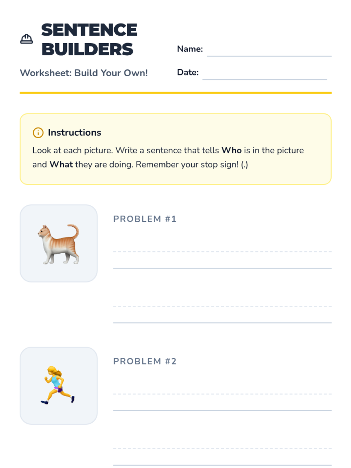 An introductory lesson on building simple sentences using the 'Who + Doing What' formula. Students will use visual prompts to construct their own sentences with a focus on capitalization and ending punctuation.