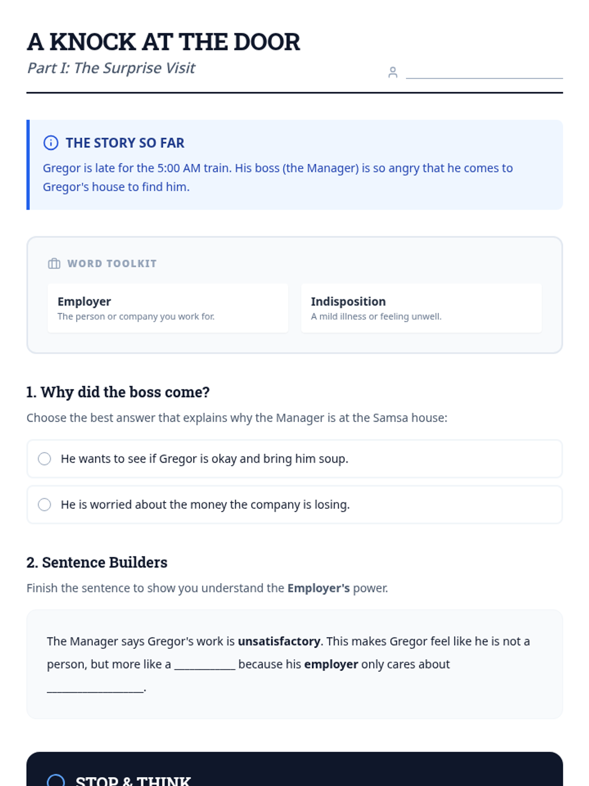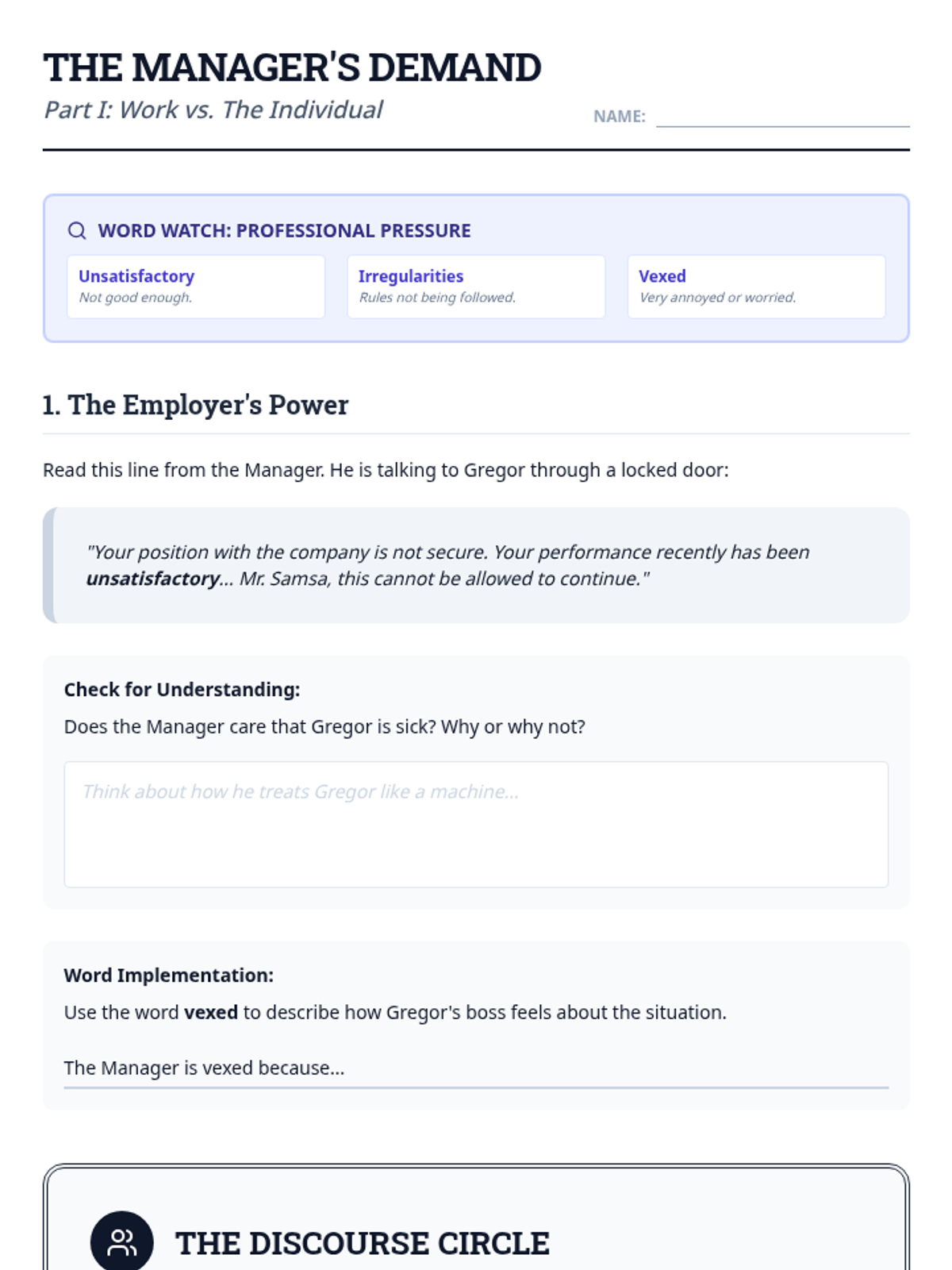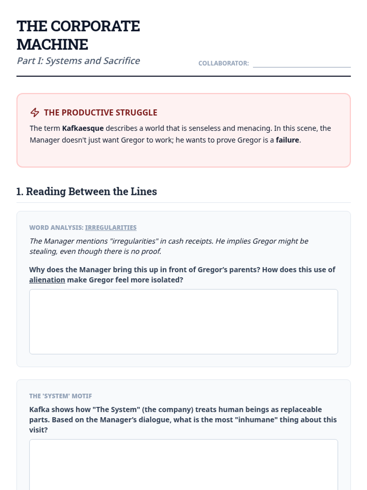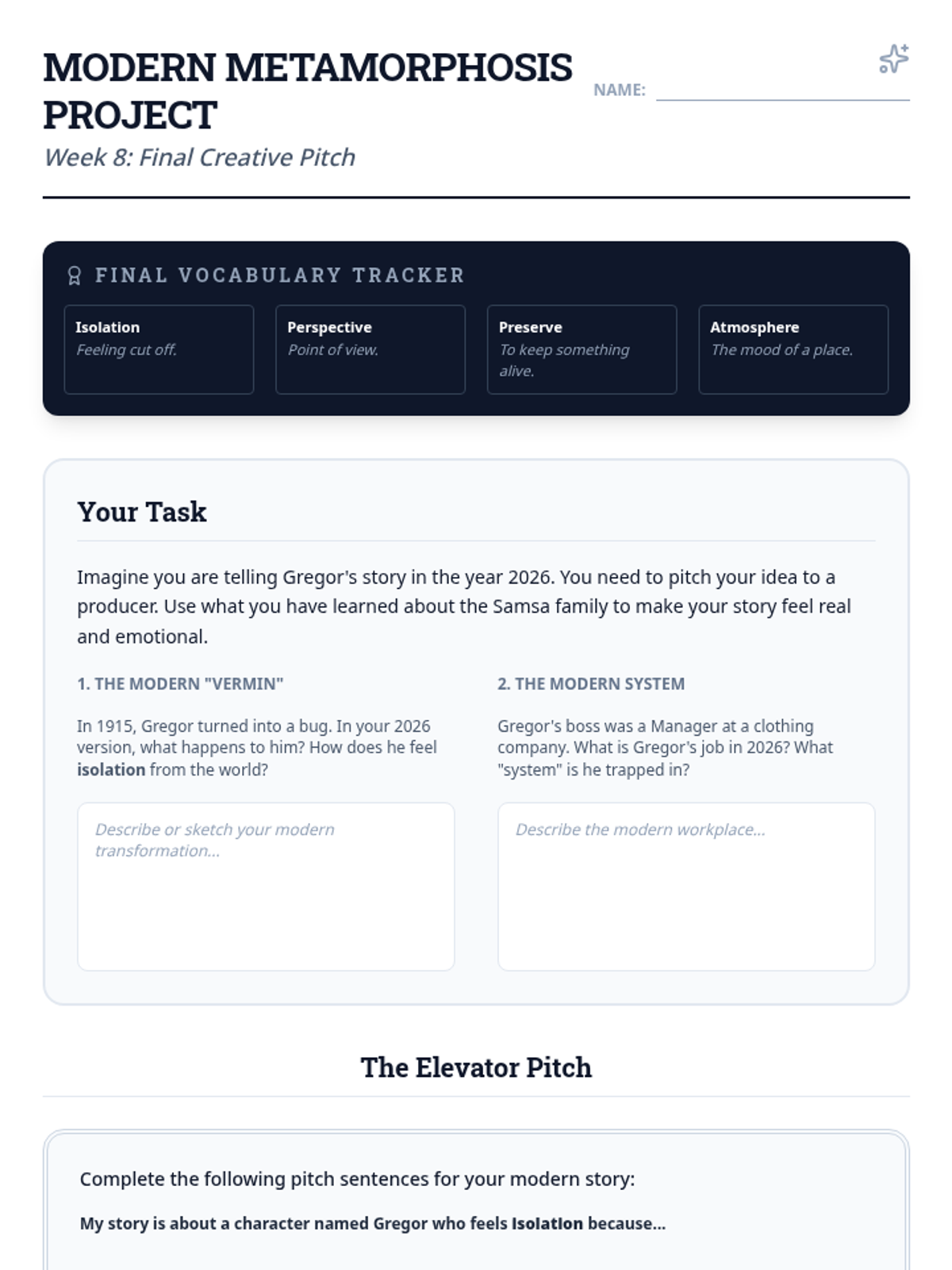 Students investigate the concept of 'Kafkaesque' and explore the life of Franz Kafka. Focus on vocabulary acquisition and the emotional landscape of isolation.