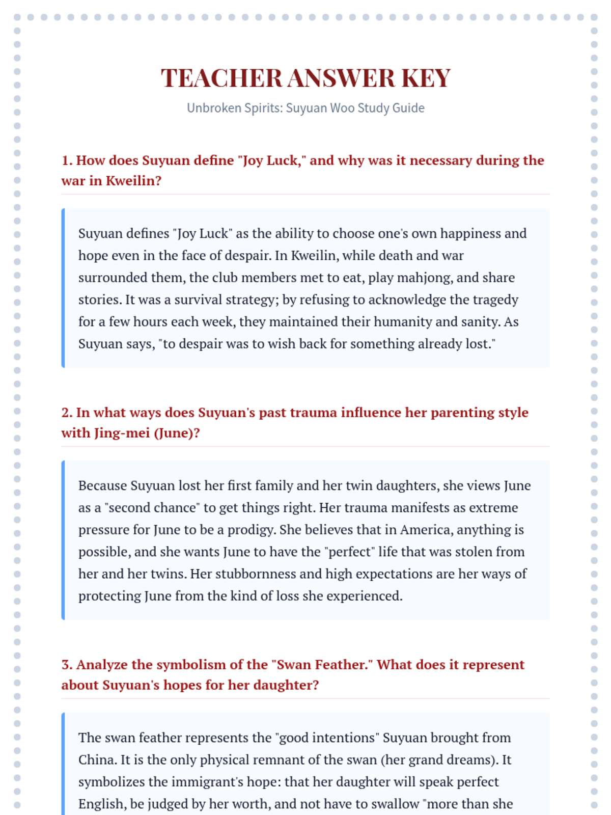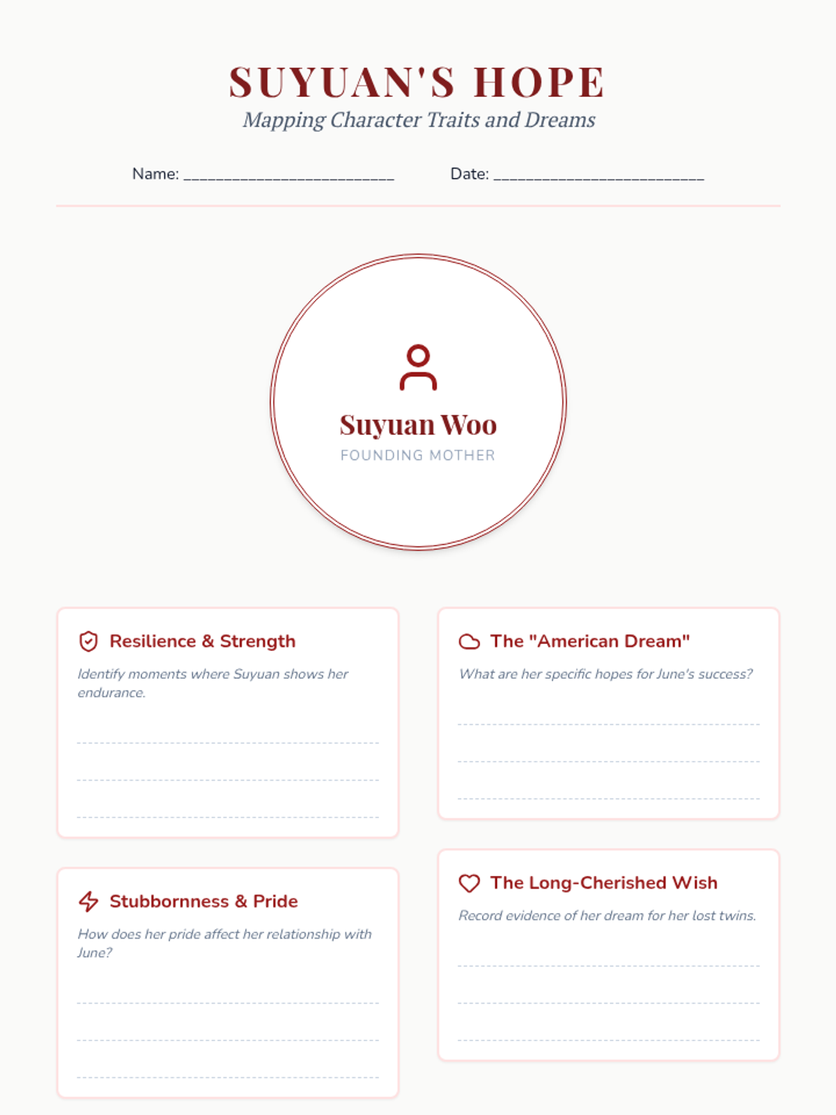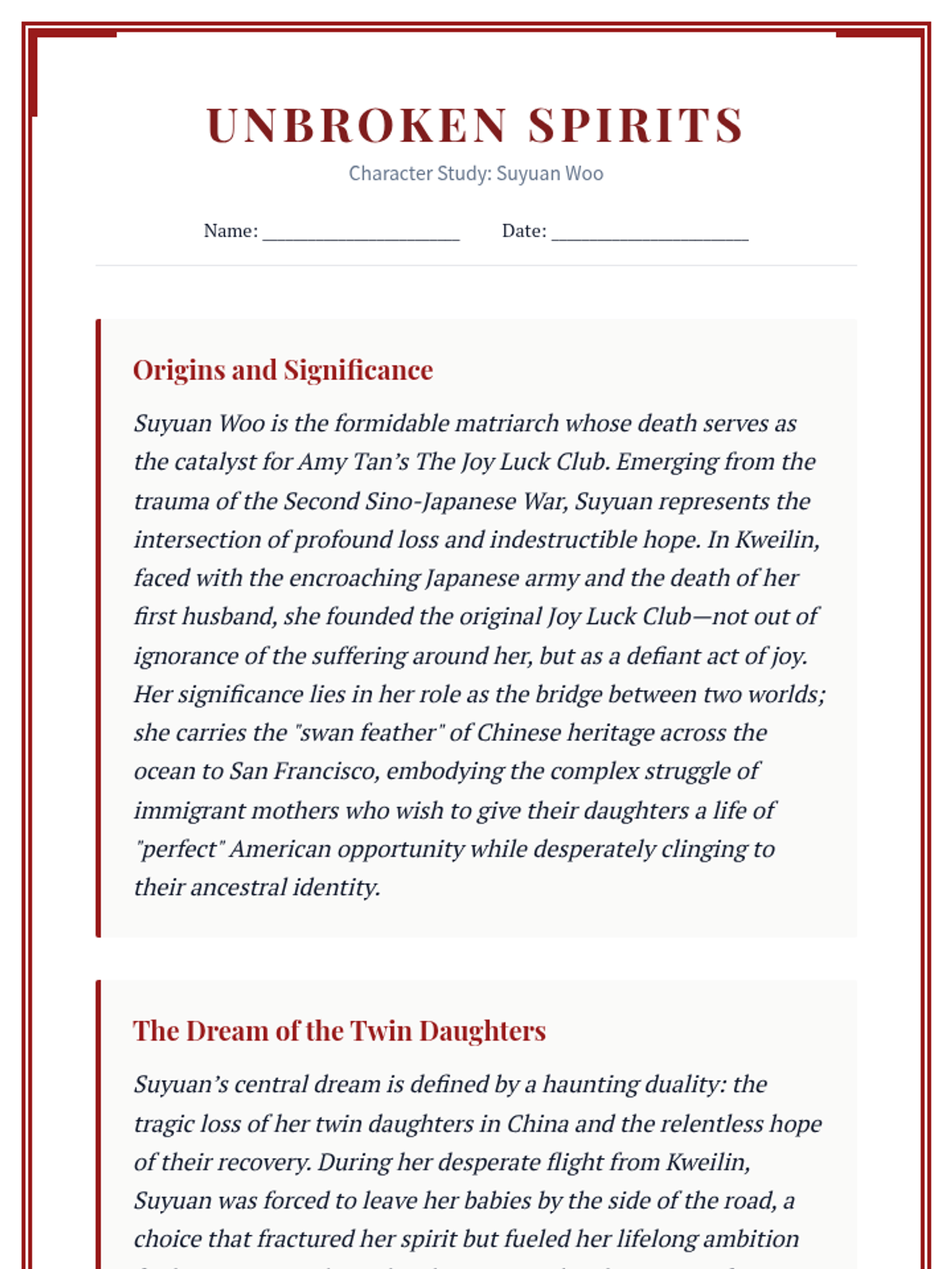 A deep dive into the life, legacy, and dreams of Suyuan Woo, the founding mother of the Joy Luck Club. Students will explore her resilience in war-torn China and her enduring hope for her daughters.