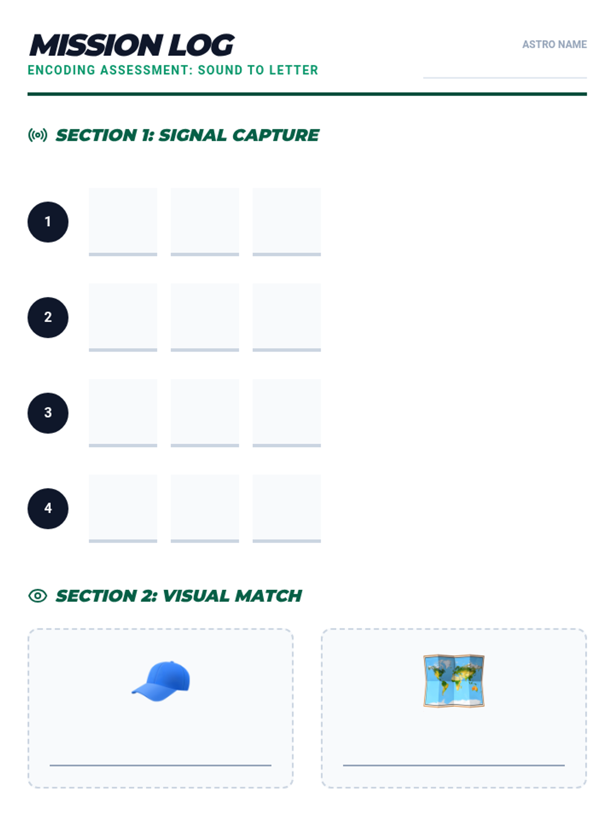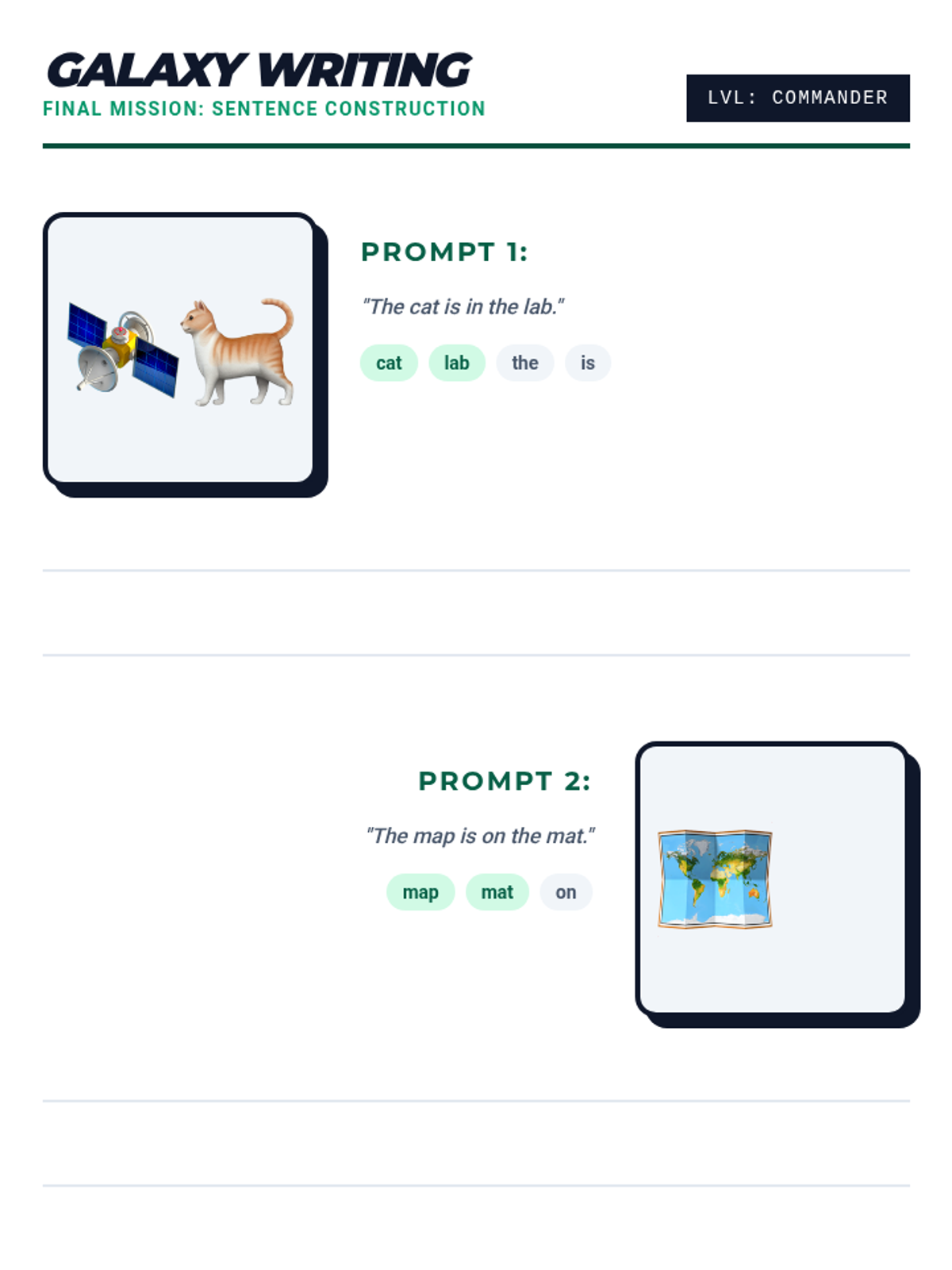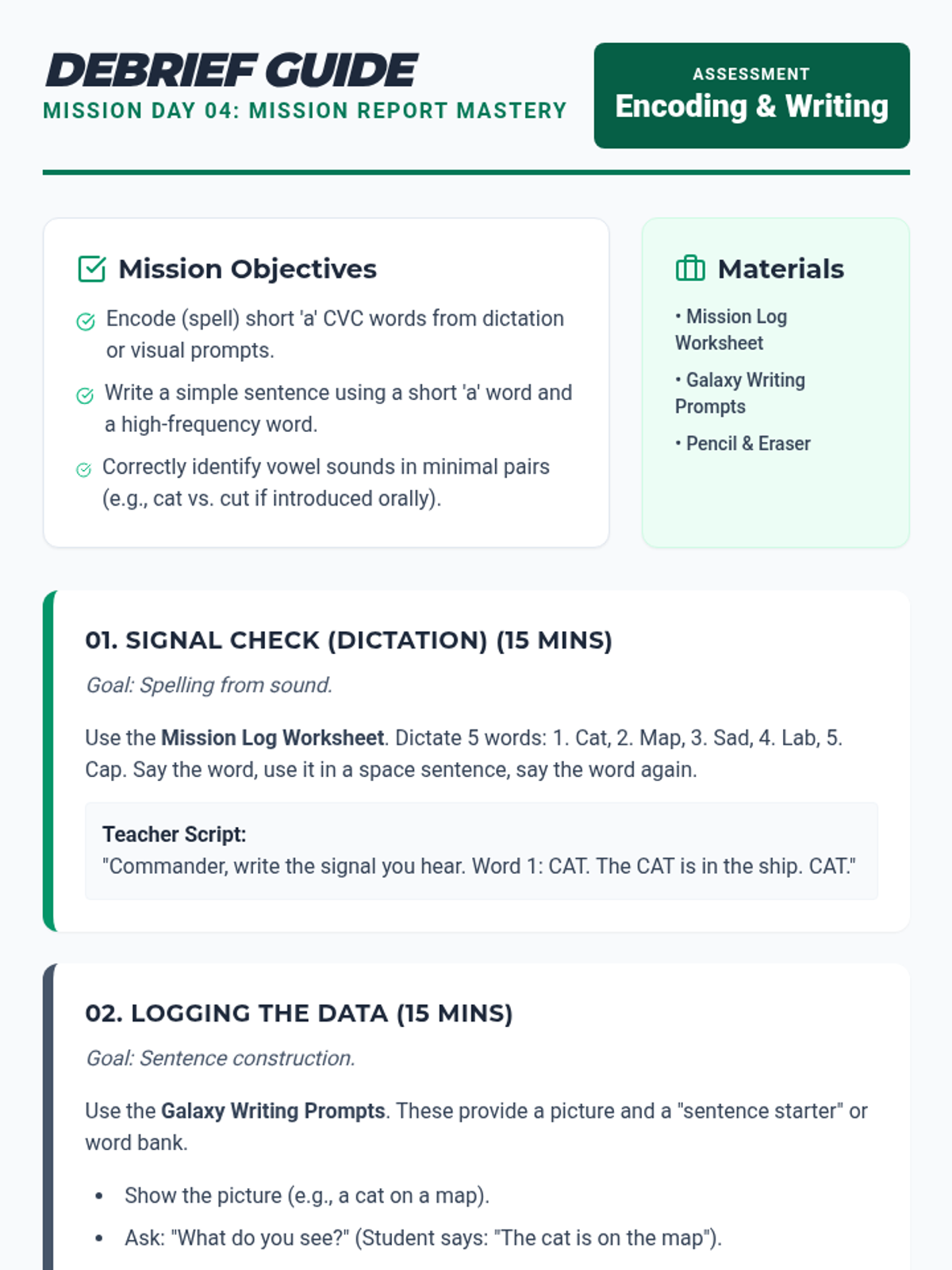 Finalizes the mission with interactive writing prompts and a comprehensive worksheet to assess encoding and sentence construction skills.