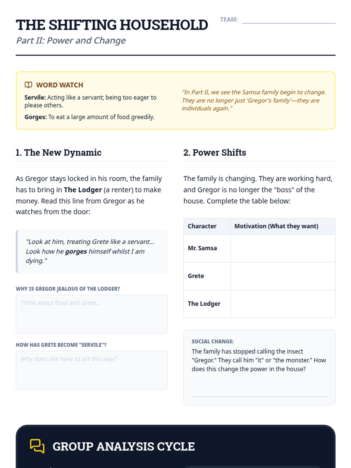 Introduction to the Samsa Family Case File. Students track character traits and initial reactions in Part I, focusing on how relationships begin to shift.