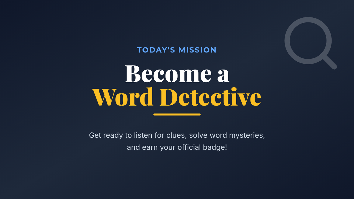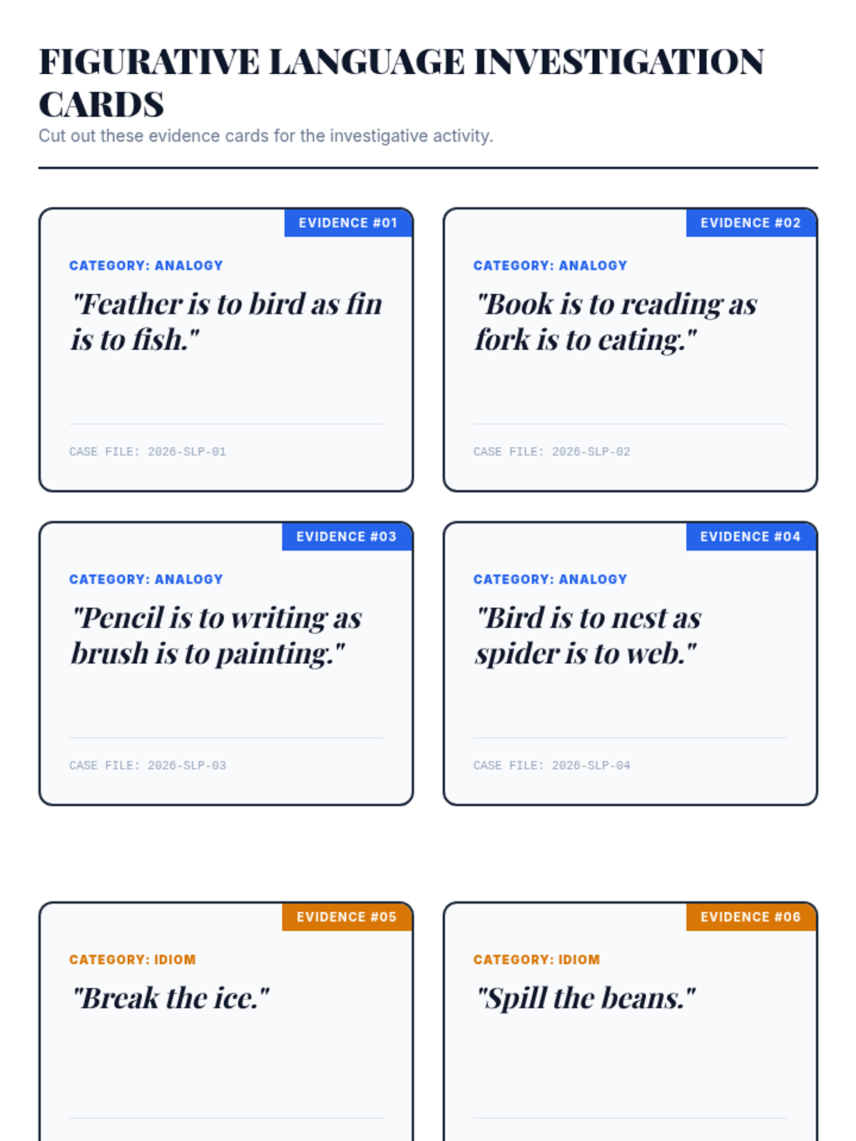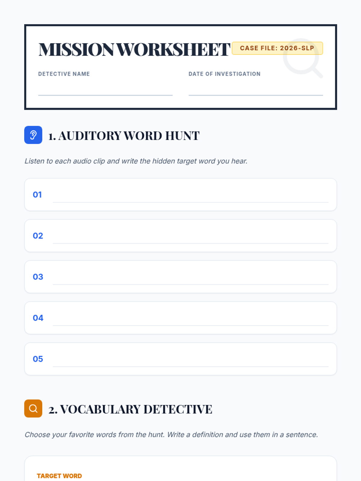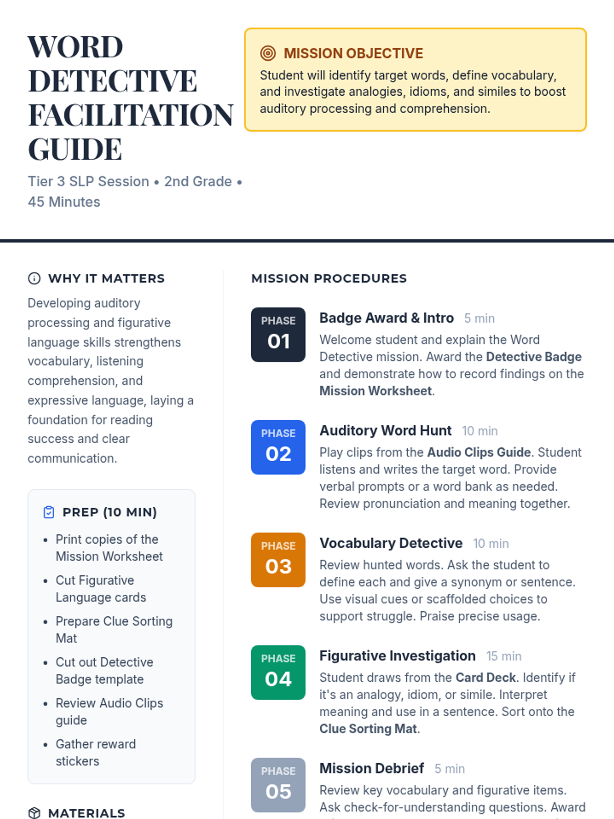 A specialized 45-minute Tier 3 SLP session focusing on auditory processing, figurative language, and vocabulary through a fun detective-themed mission. Students identify target words from audio clips and investigate analogies, idioms, and similes.