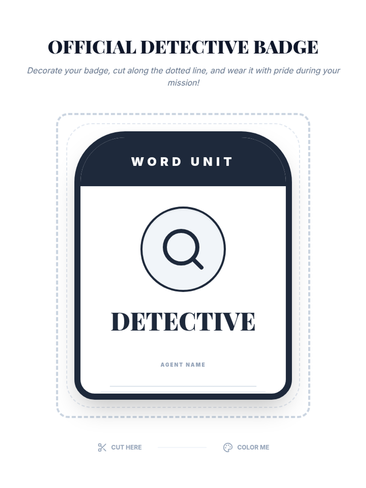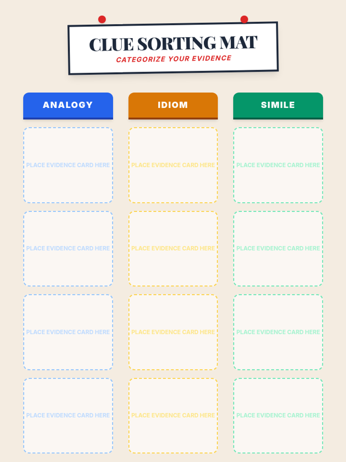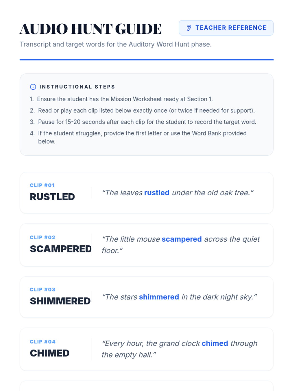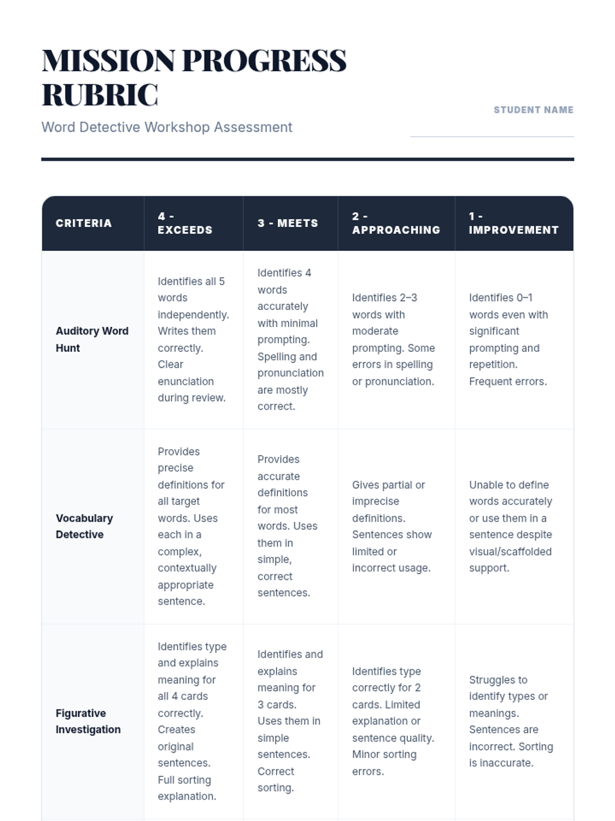 A specialized 45-minute Tier 3 SLP session focusing on auditory processing, figurative language, and vocabulary through a fun detective-themed mission. Students identify target words from audio clips and investigate analogies, idioms, and similes.