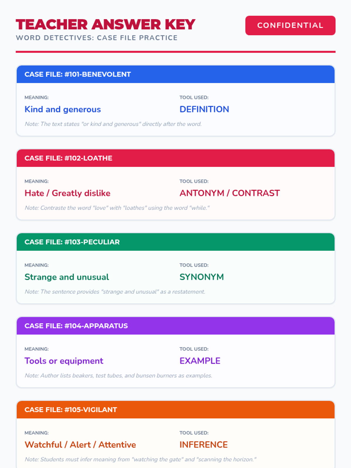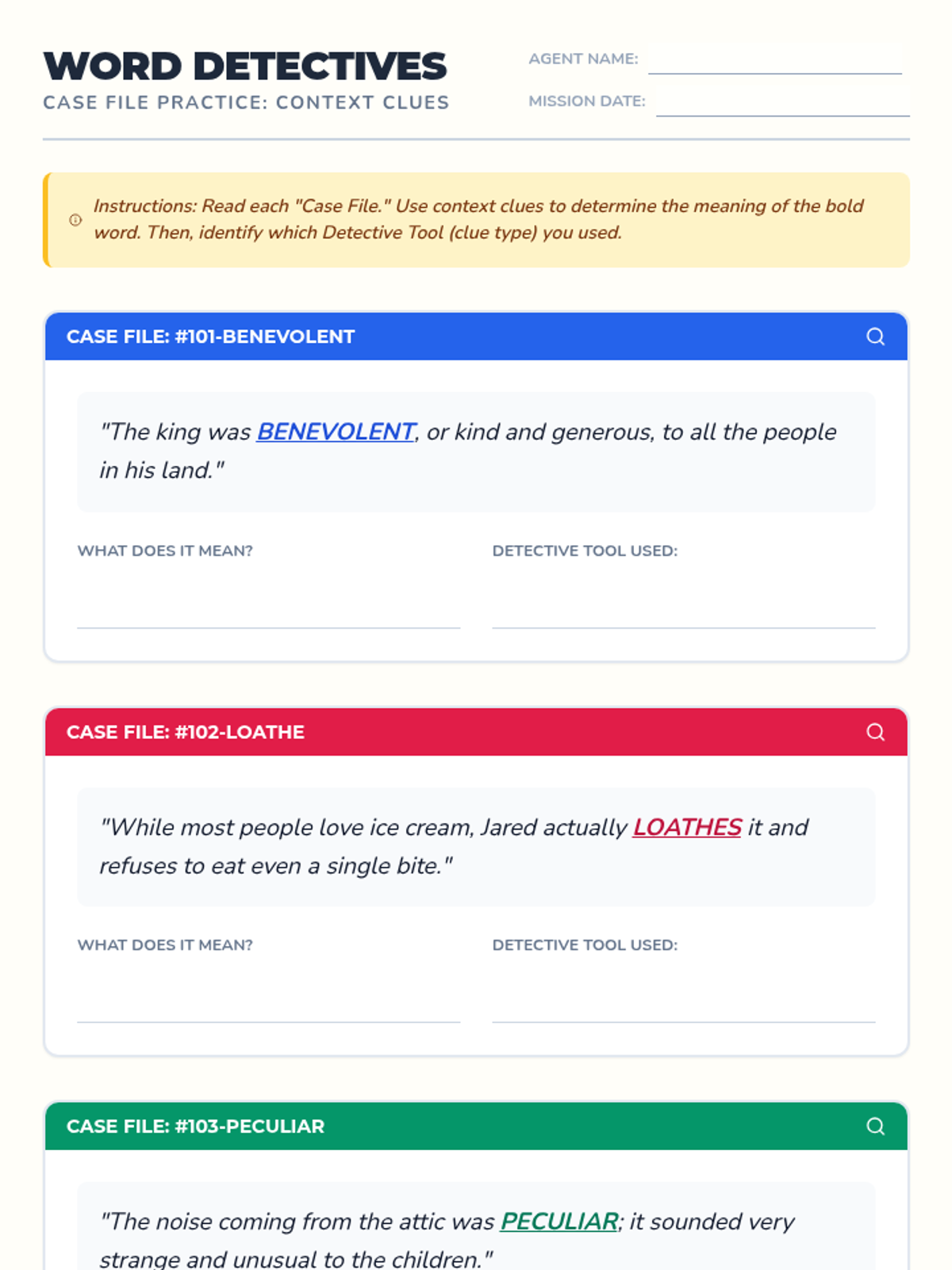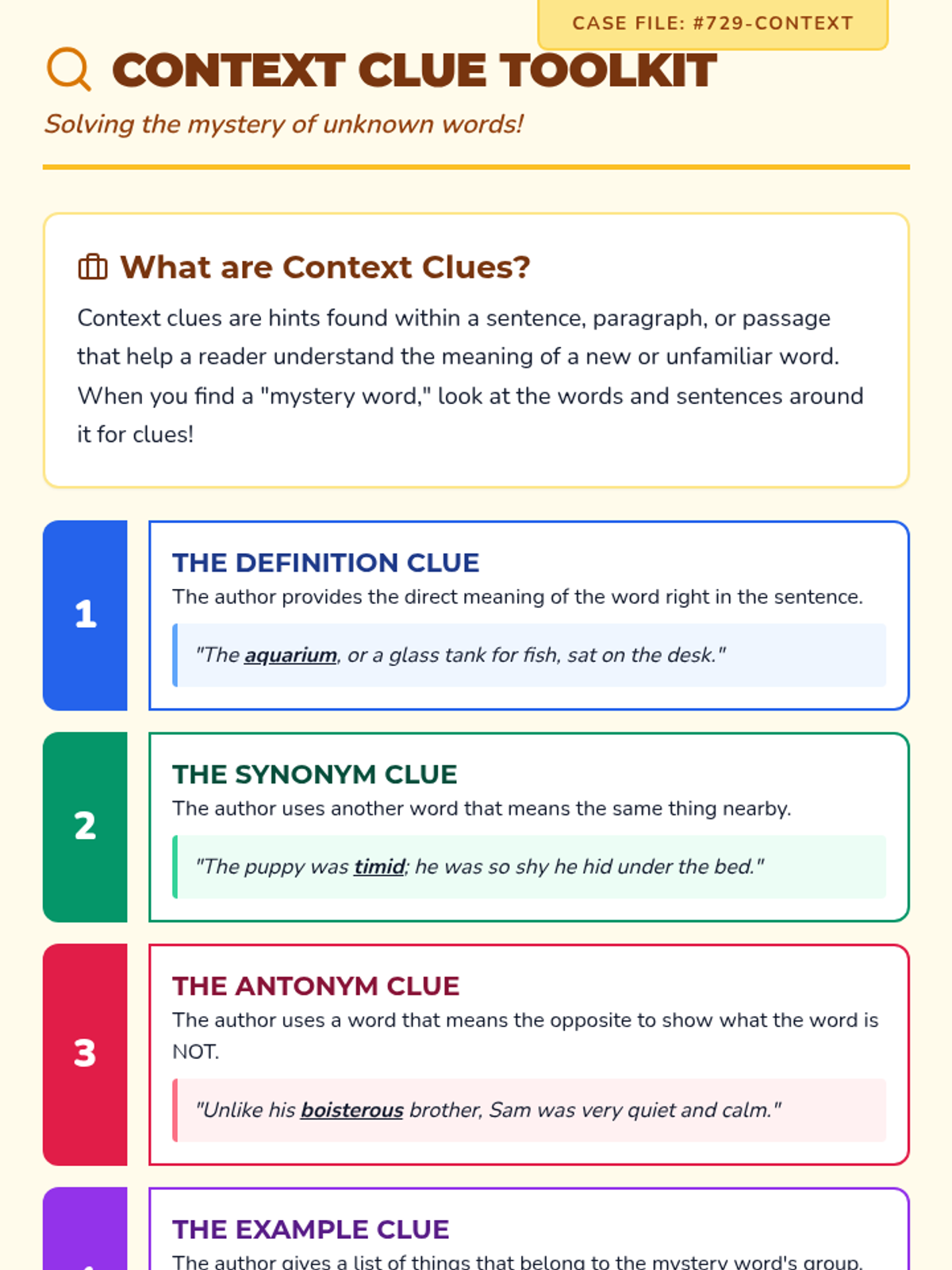 A comprehensive lesson on using context clues to unlock the meaning of unfamiliar words, featuring detective-themed strategies and practice.