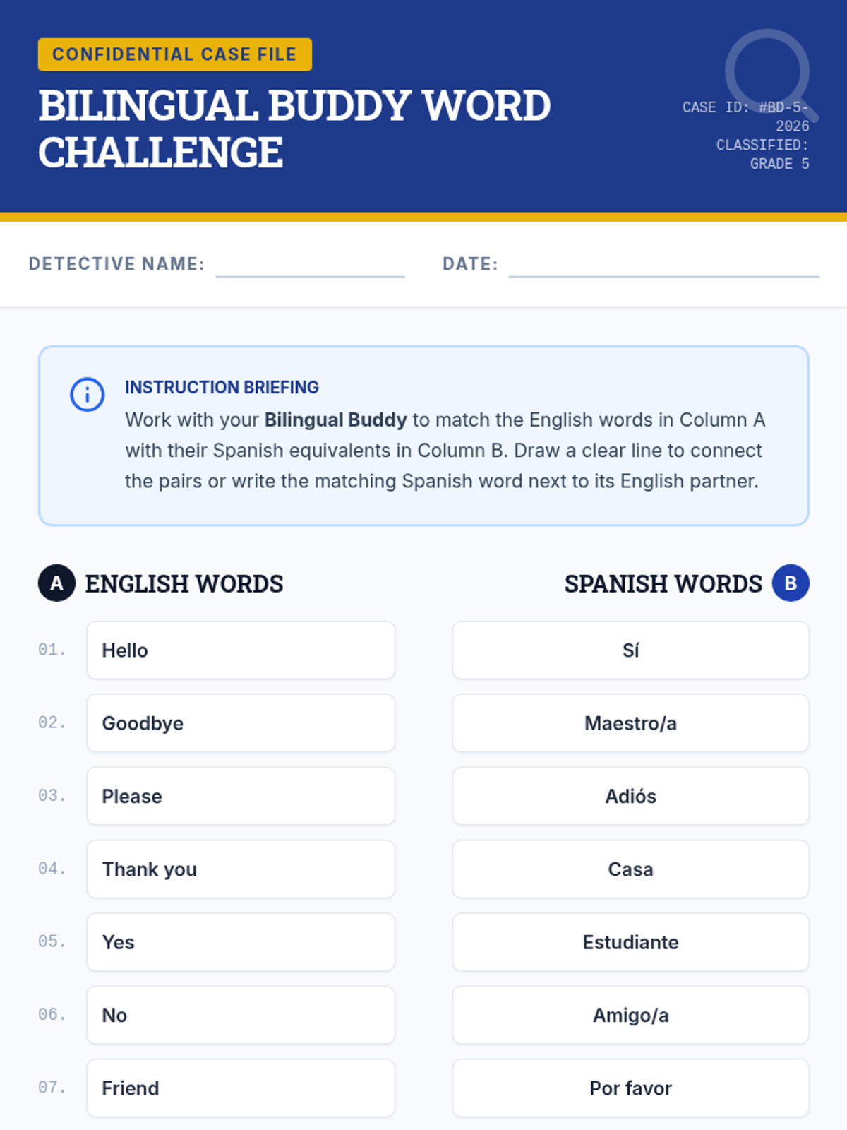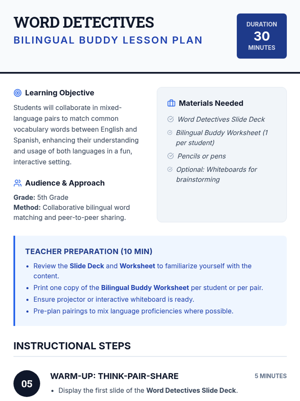 A 30-minute collaborative lesson where 5th-grade students work in mixed-language pairs to solve bilingual word puzzles and bridge English and Spanish vocabulary.
