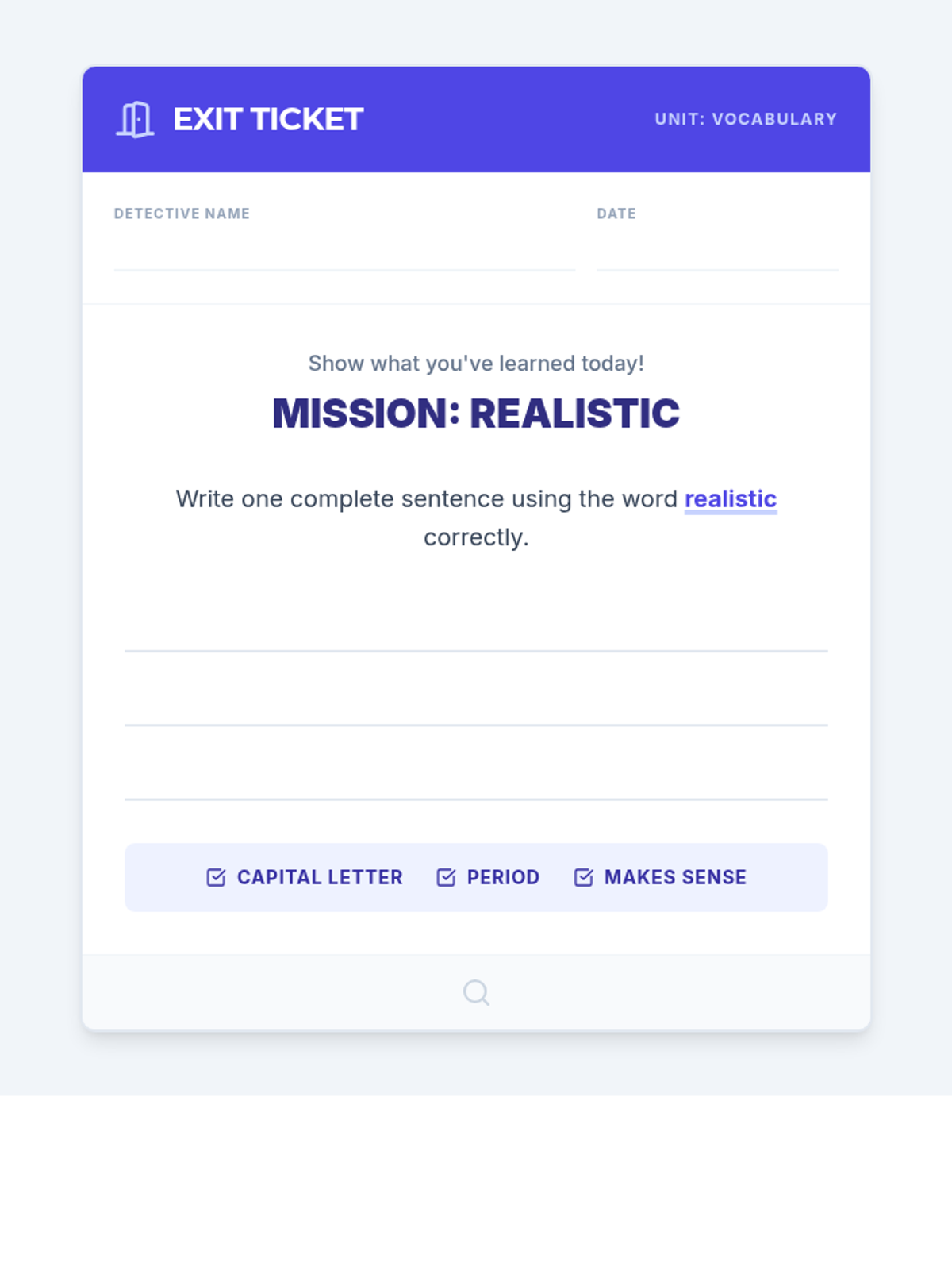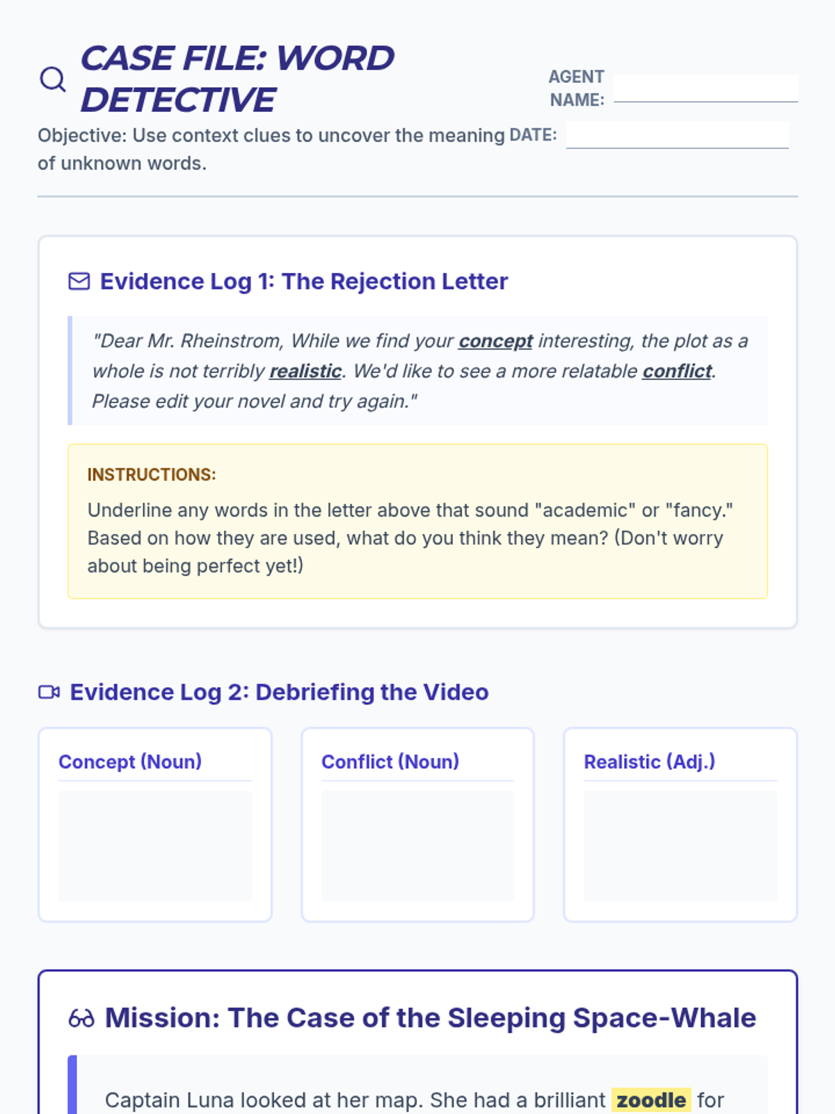 A 4th-grade vocabulary lesson focusing on using context clues to define 'concept', 'conflict', and 'realistic' through a detective-themed investigation of a rejection letter and a short story with nonsense words.