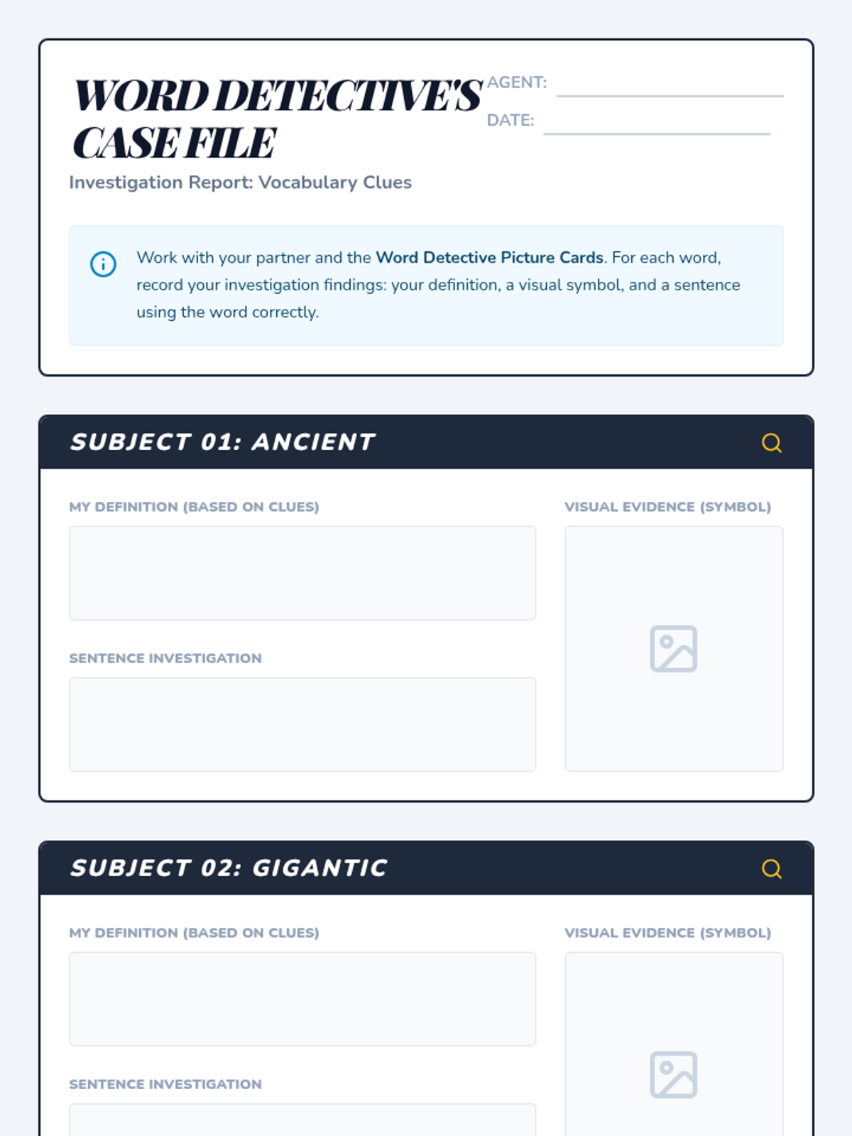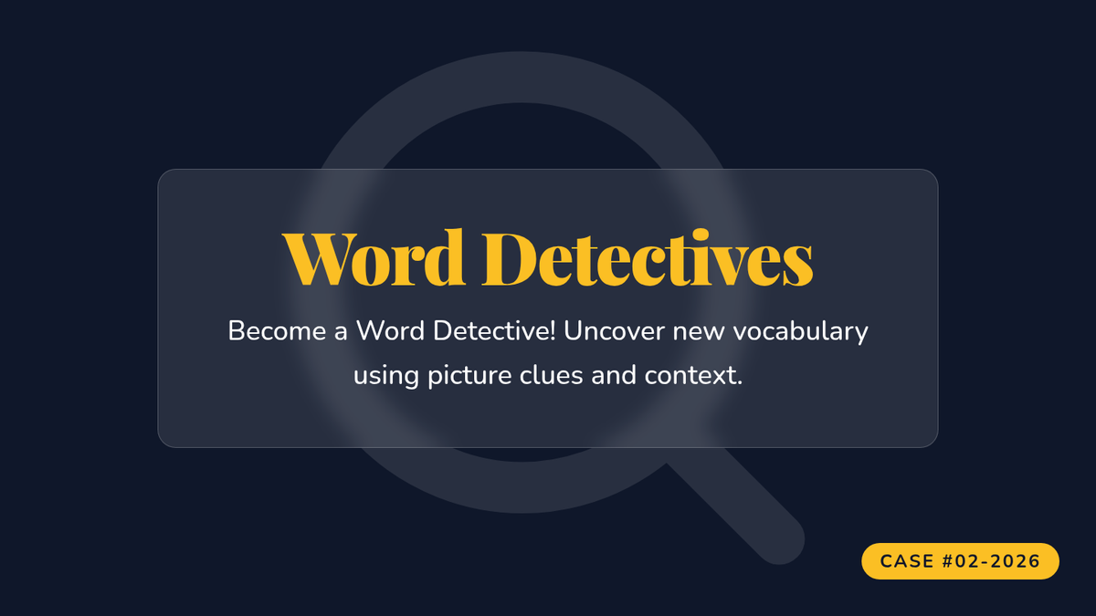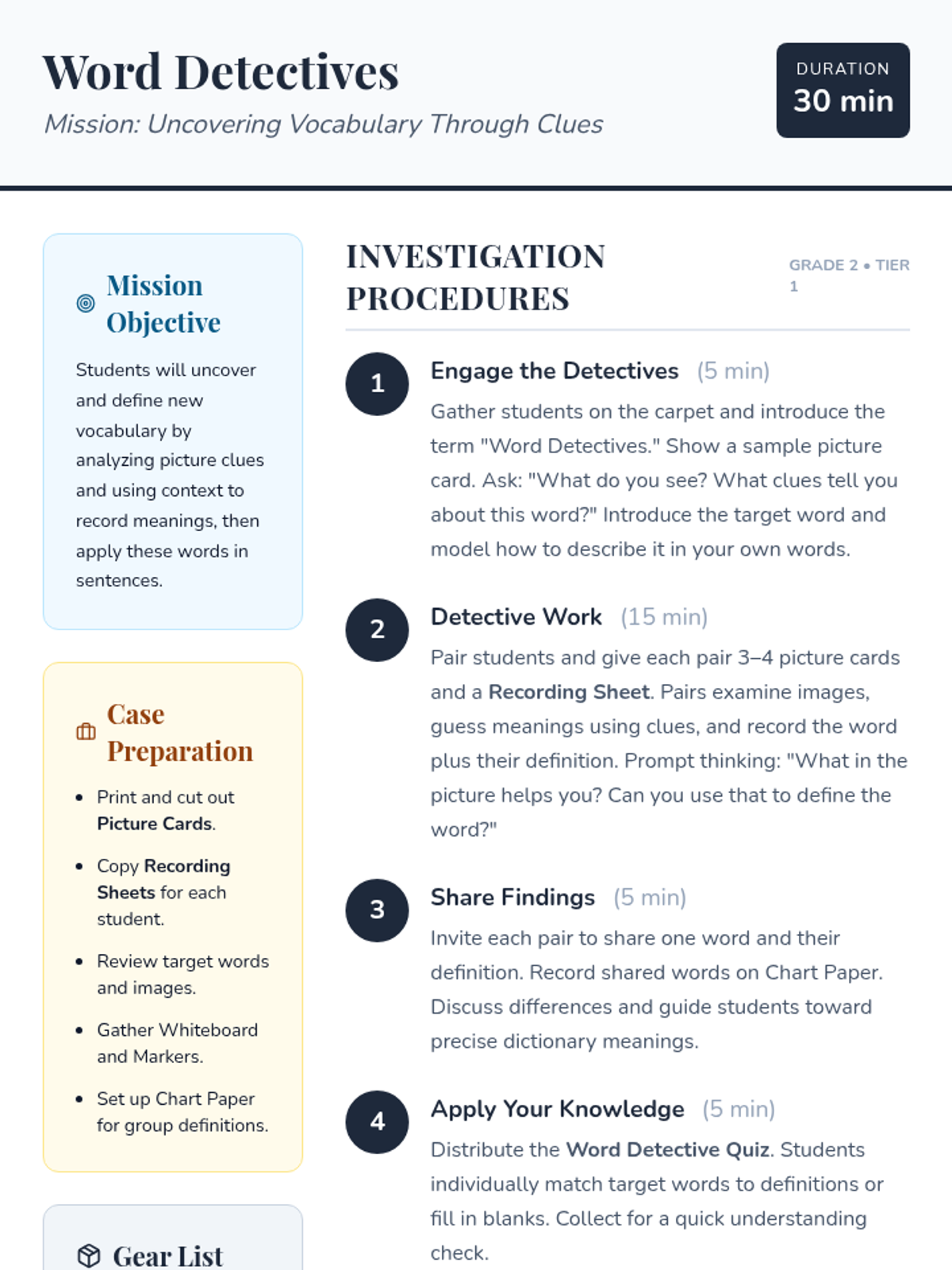 A 30-minute Tier 1 vocabulary lesson where 2nd graders become 'Word Detectives' to uncover word meanings using picture clues and collaborative investigation.