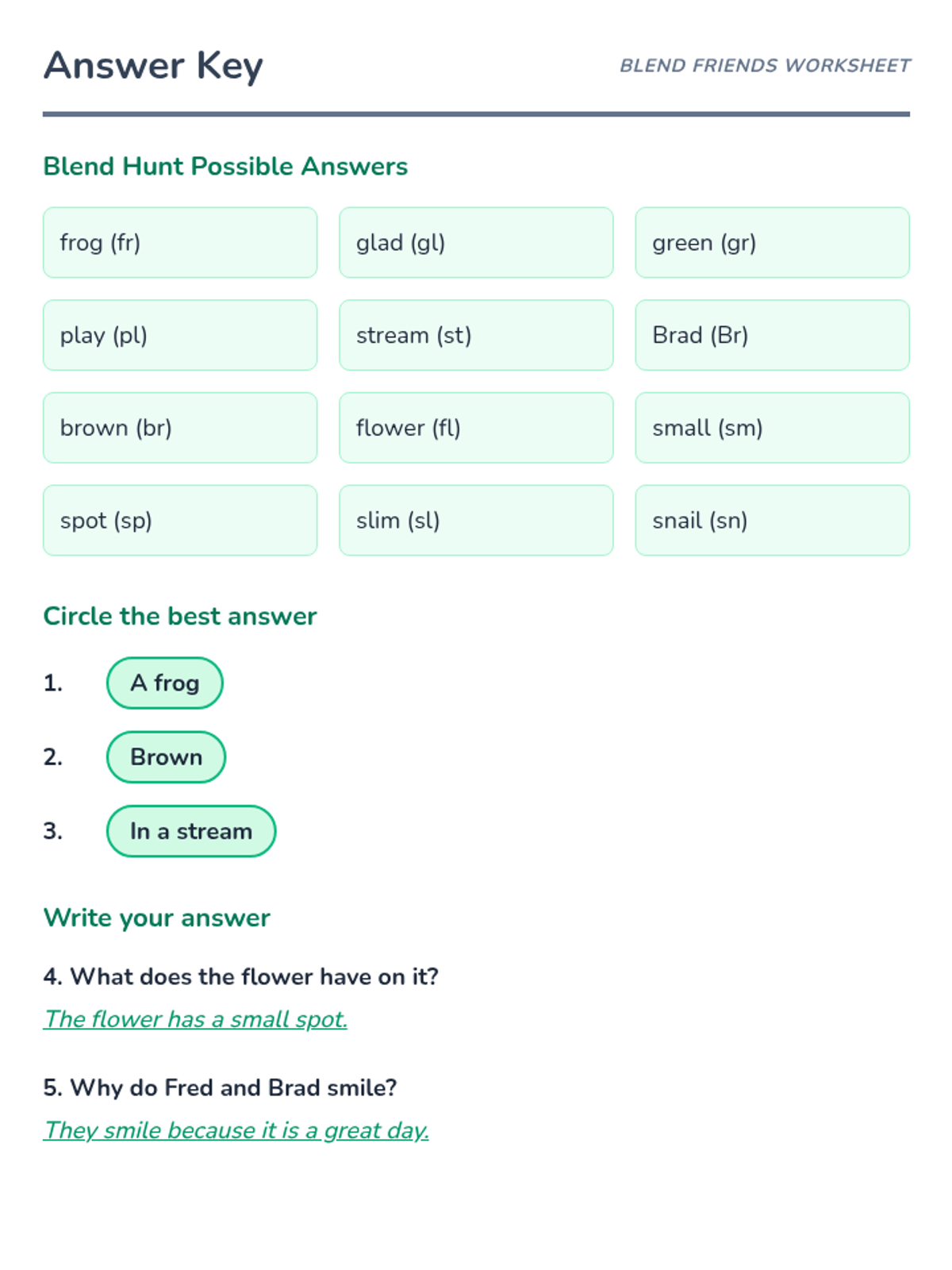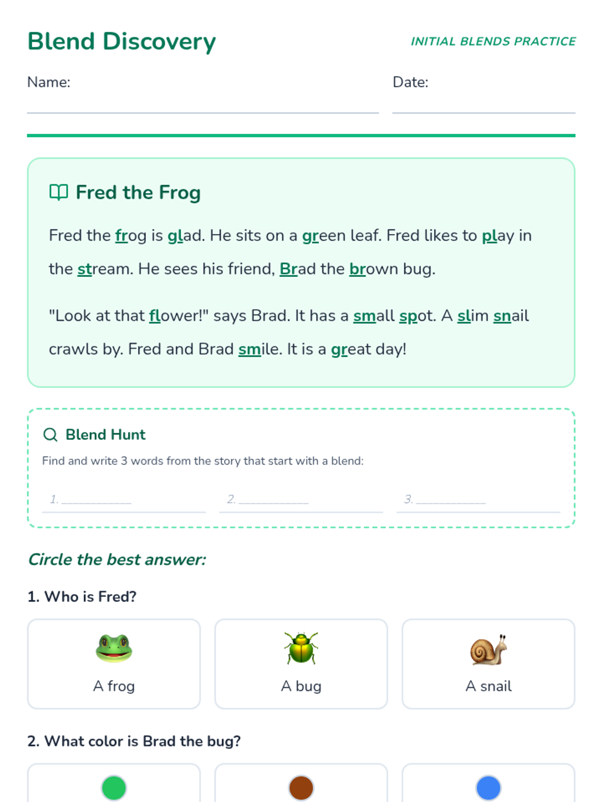 A reading comprehension lesson focusing on identifying and decoding common initial consonant blends through a garden-themed story.
