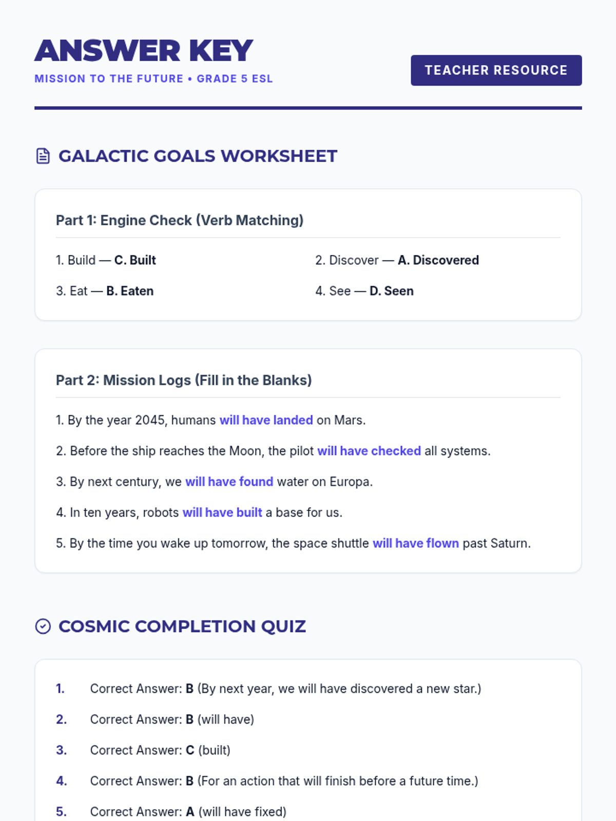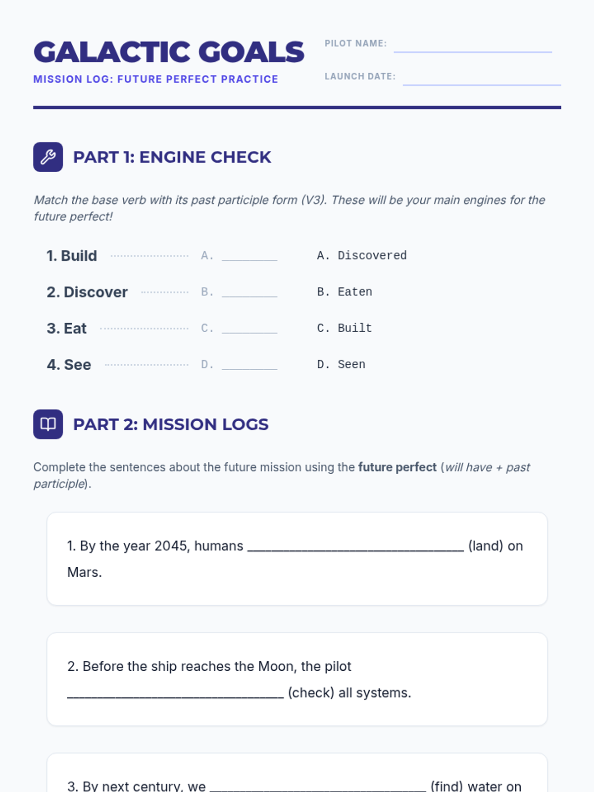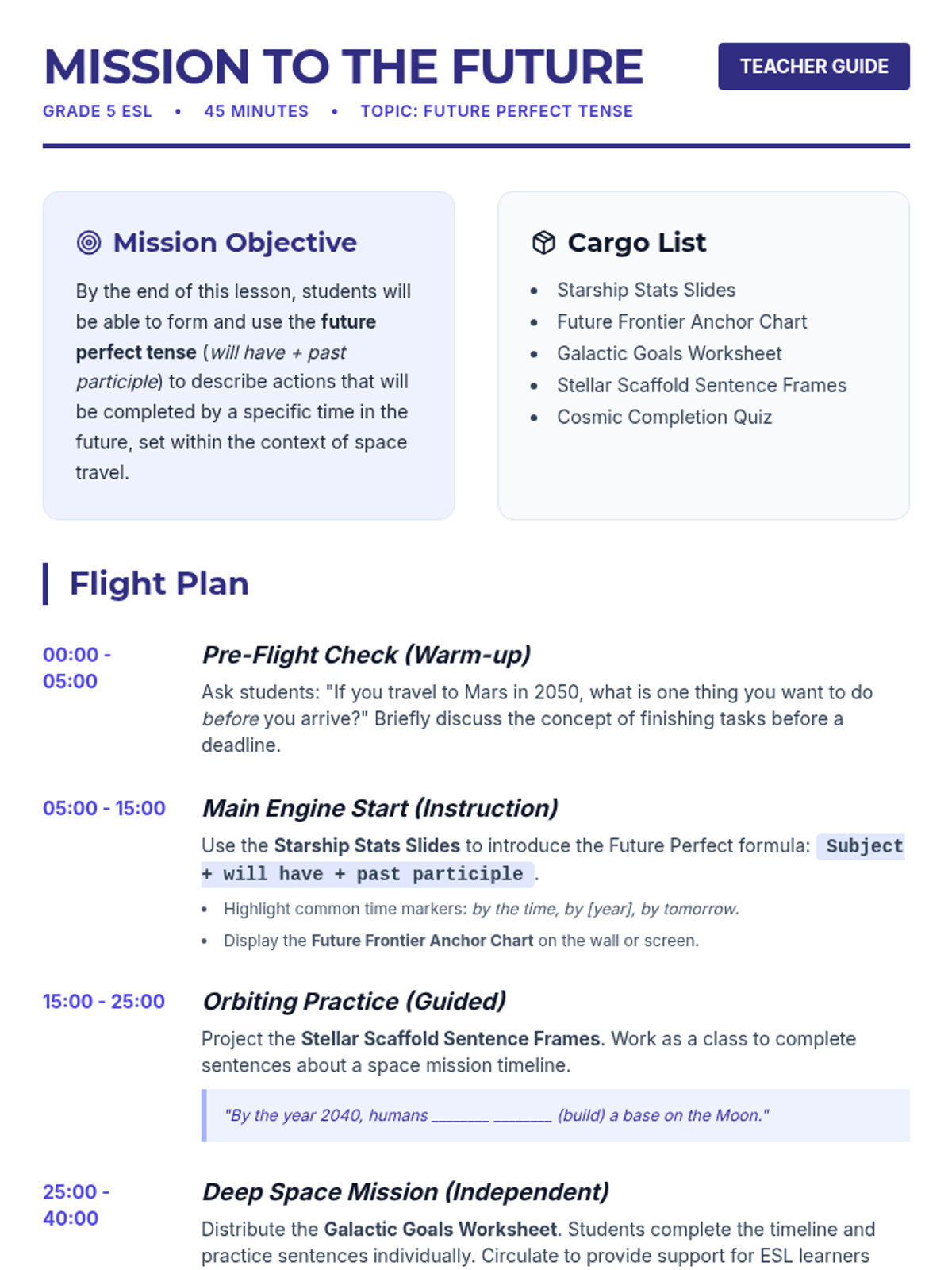A 45-minute ESL lesson for Grade 5 students focused on the future perfect tense through the lens of space exploration and interstellar travel. Students will learn to form and use the future perfect to describe completed actions in the future.