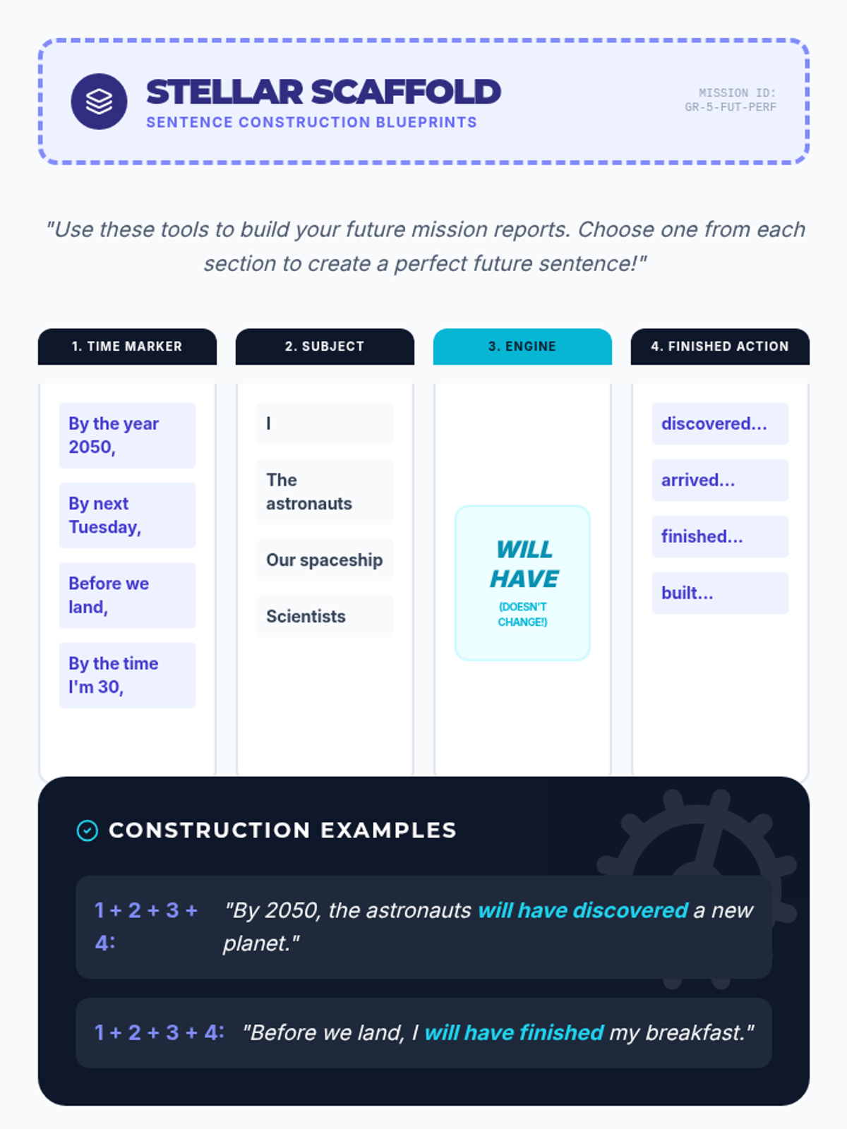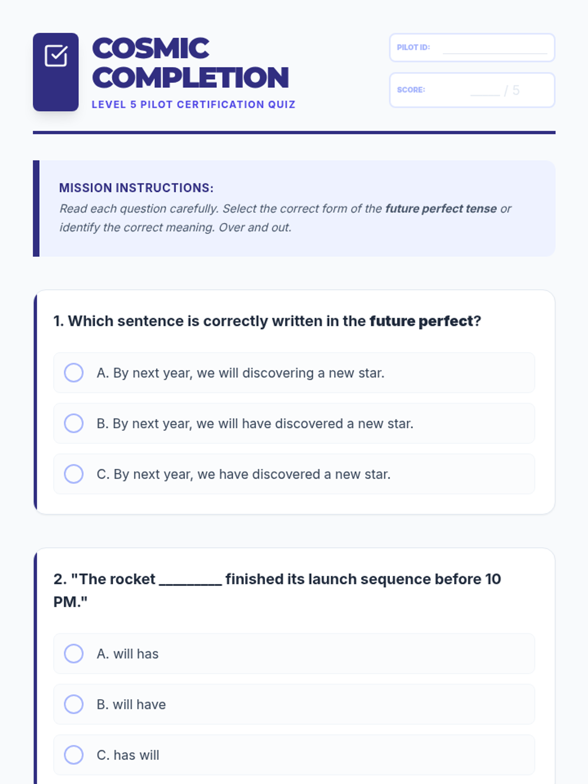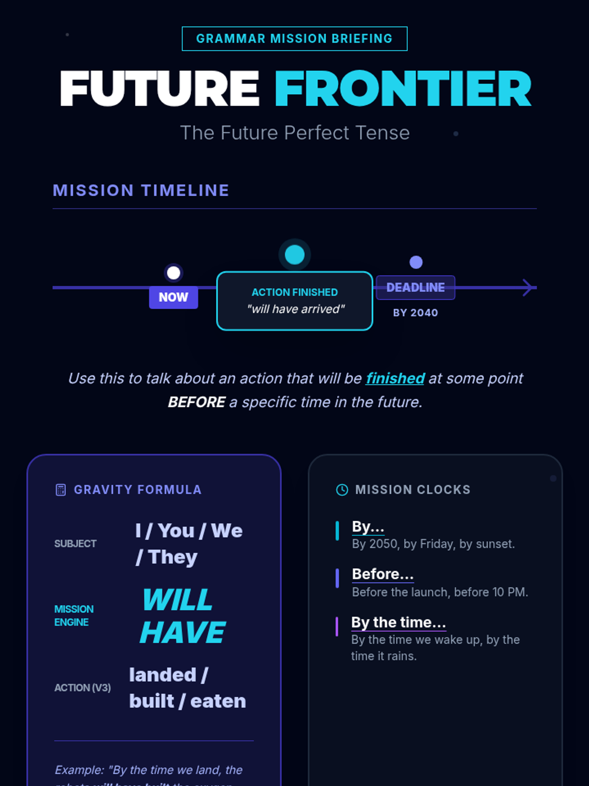 A 45-minute ESL lesson for Grade 5 students focused on the future perfect tense through the lens of space exploration and interstellar travel. Students will learn to form and use the future perfect to describe completed actions in the future.