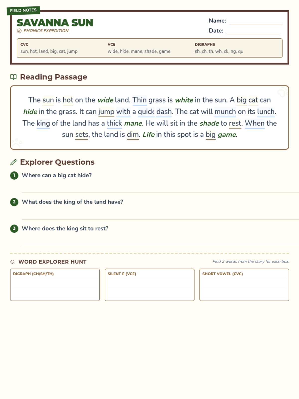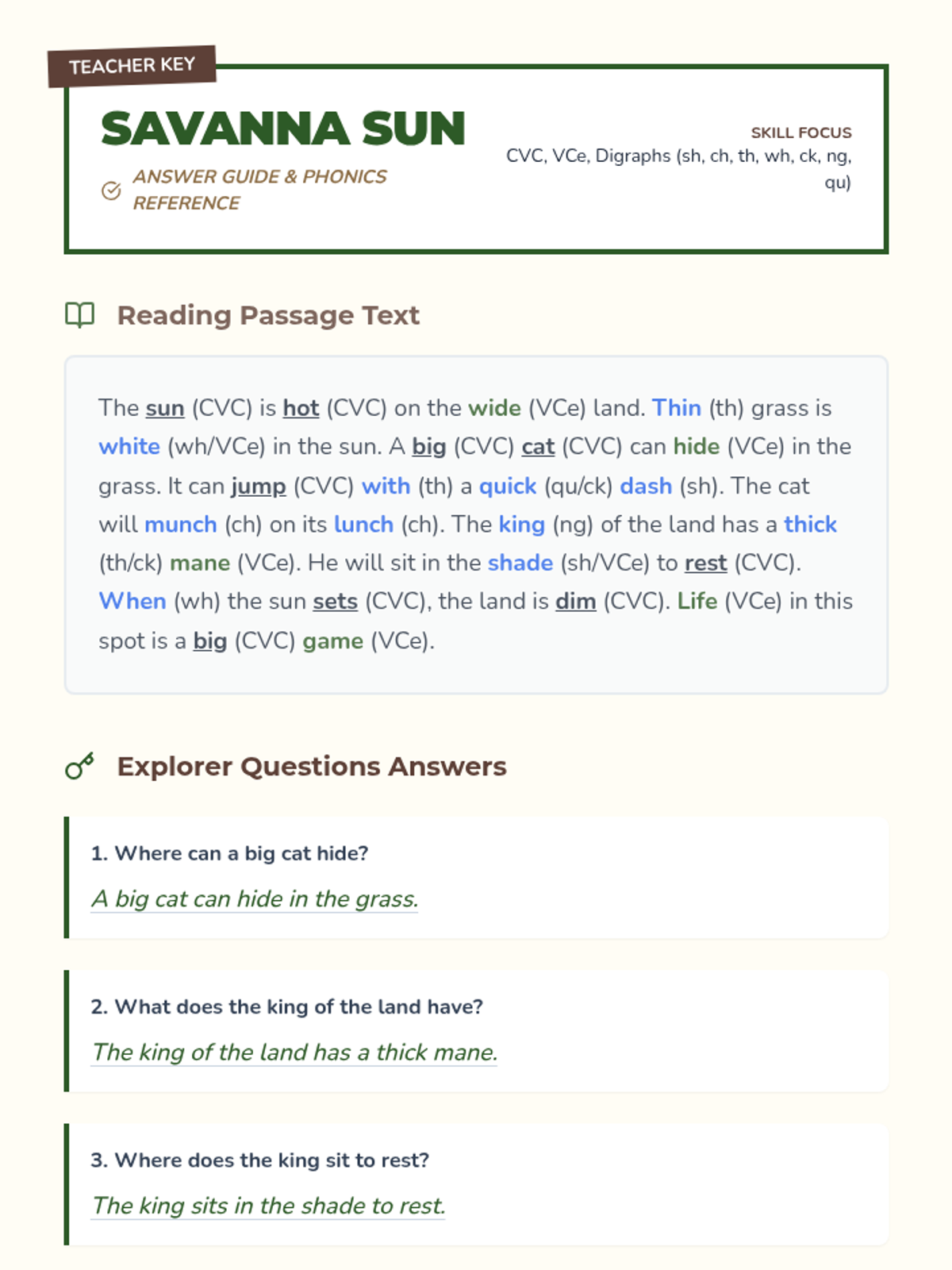 A phonics-focused lesson exploring the African savanna using CVC, VCe, and consonant digraphs through a decodable reading passage and comprehension check.