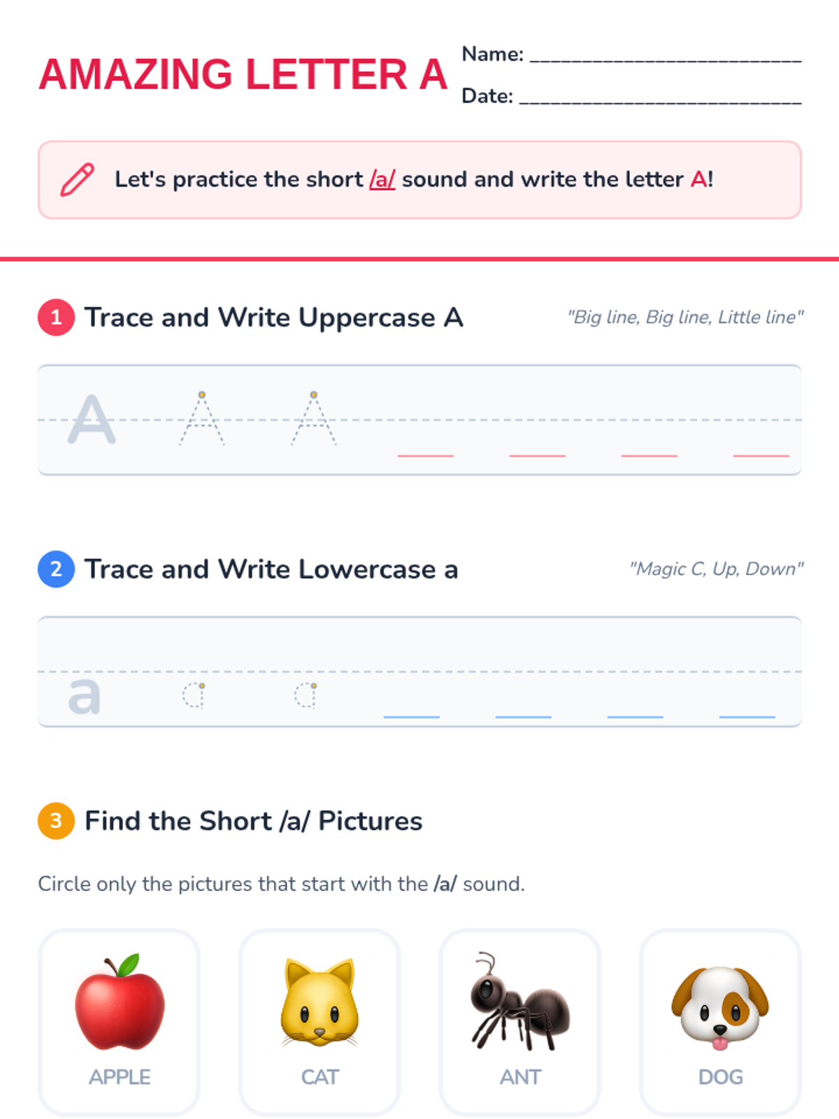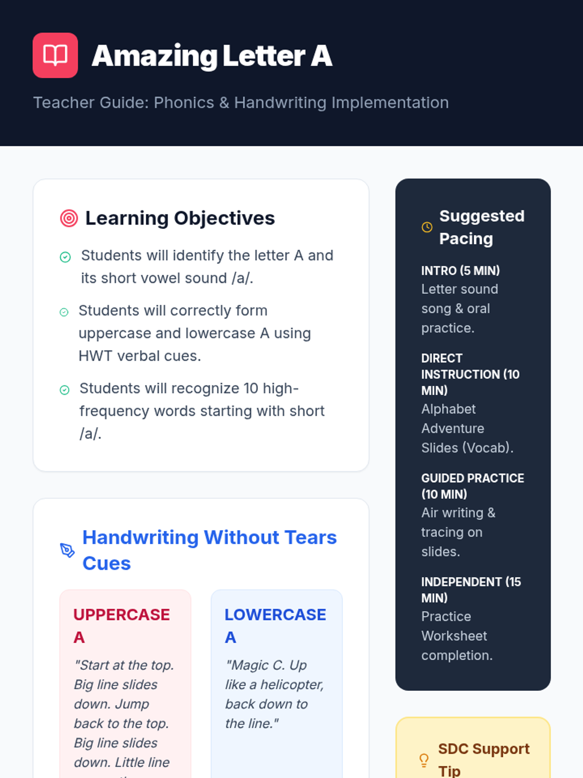 A foundational lesson for Kindergarten SDC students focusing on the letter A, its short sound, and its formation using Handwriting Without Tears principles.