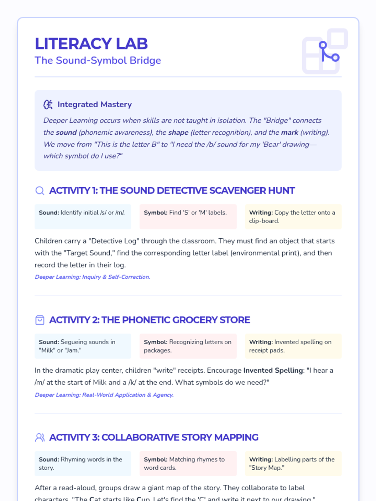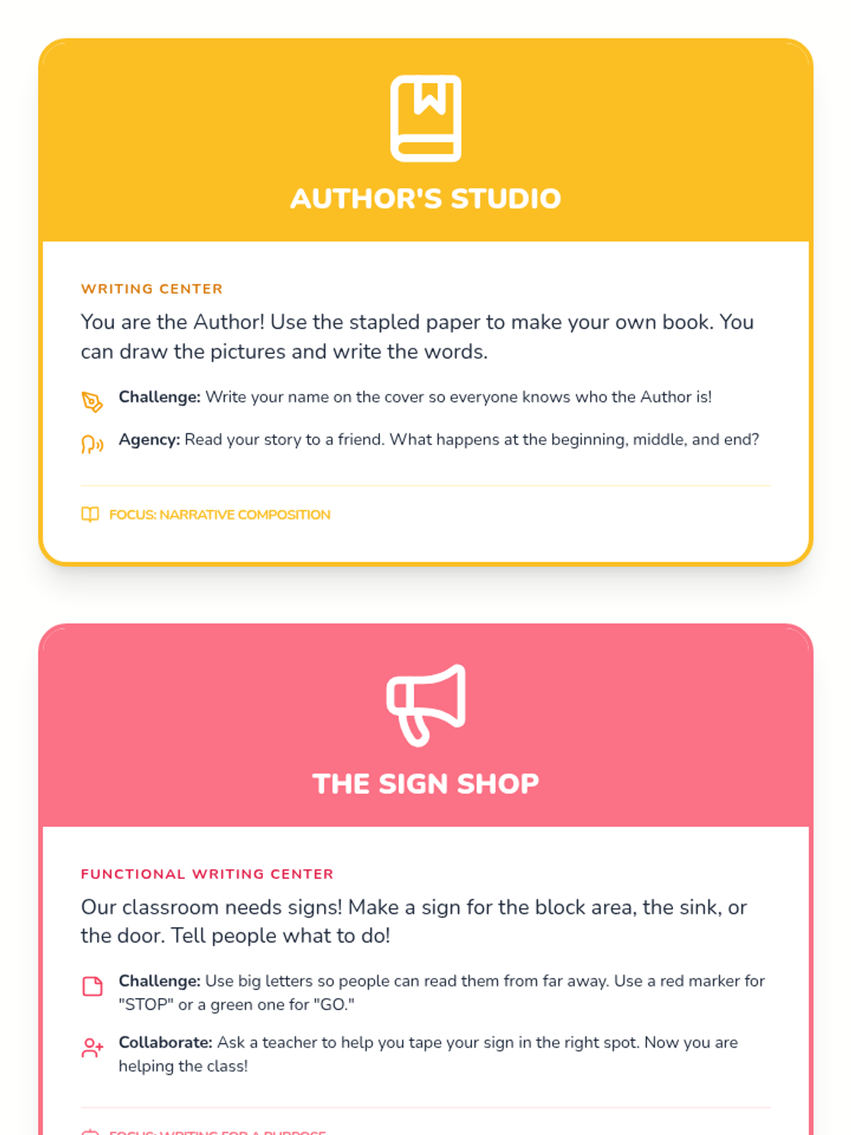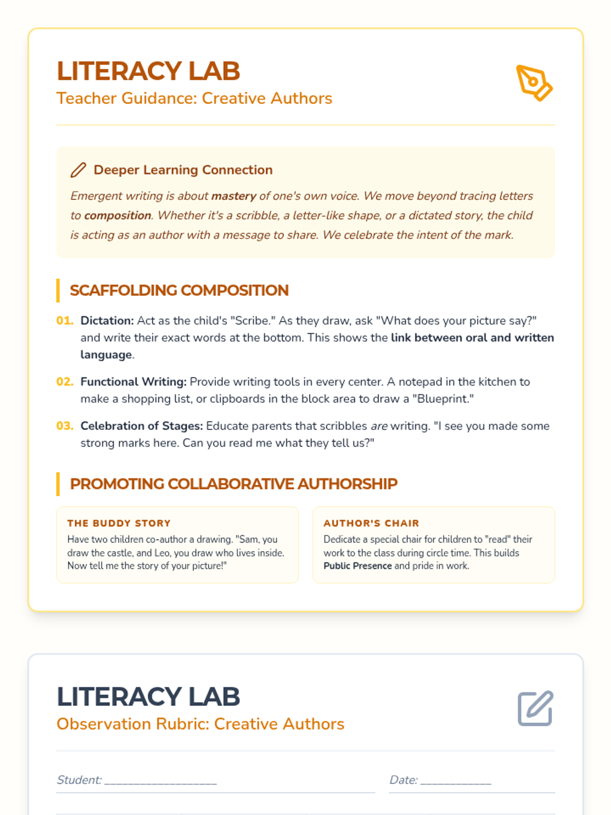 Focuses on emergent writing and composition through play-based storytelling and symbolic representation. Children discover that their marks on paper can communicate thoughts, emotions, and stories to others.