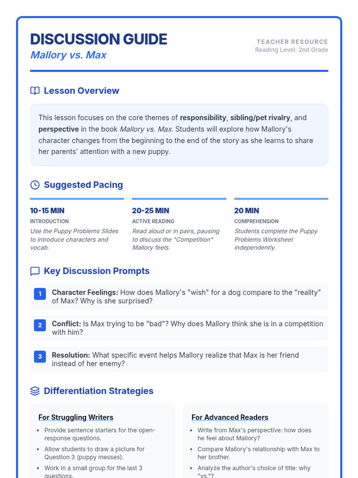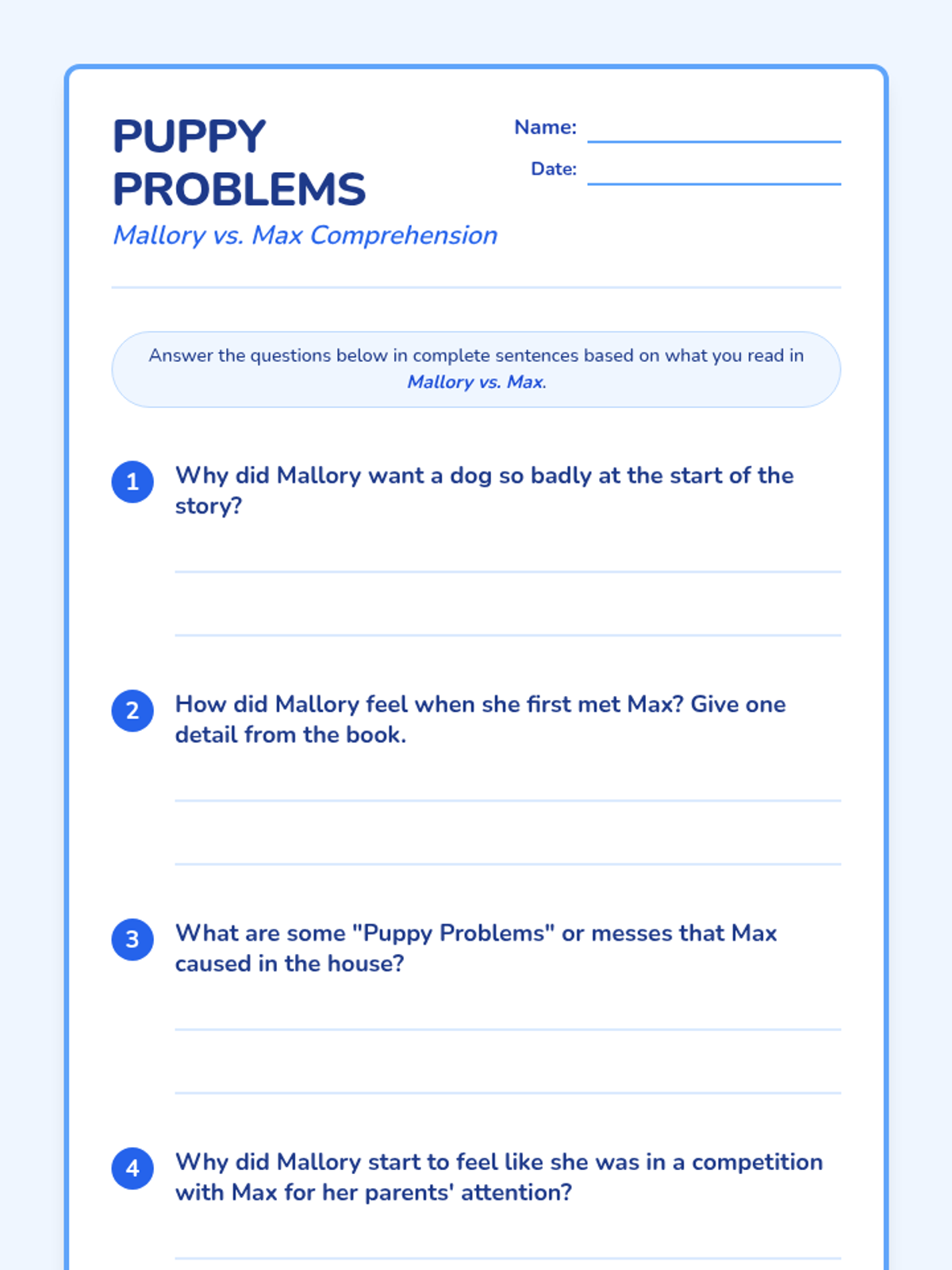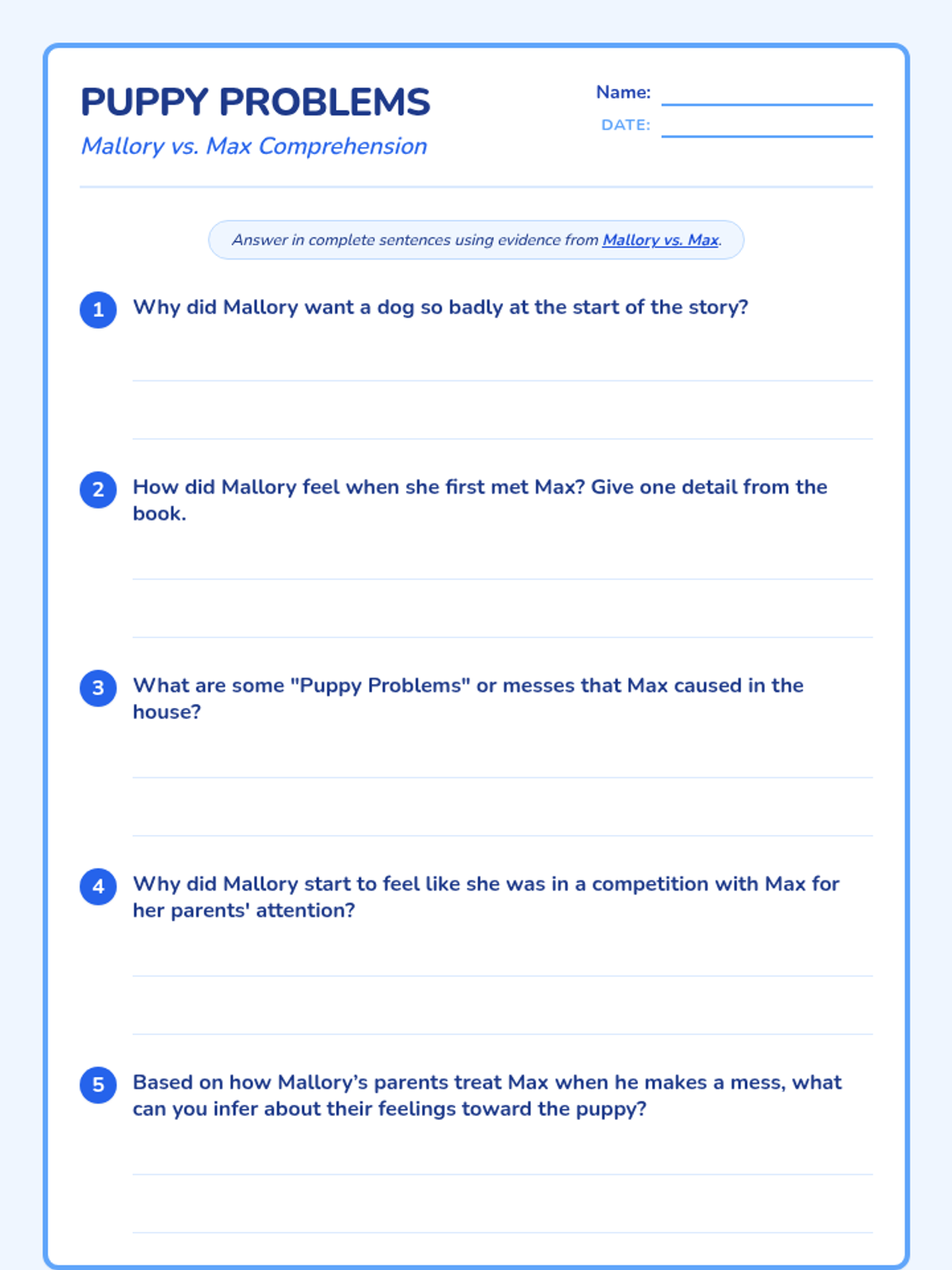 A collection of comprehension resources for the book 'Mallory vs. Max', focusing on character development and plot events for second-grade readers.