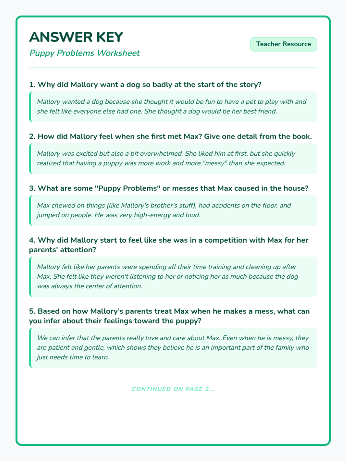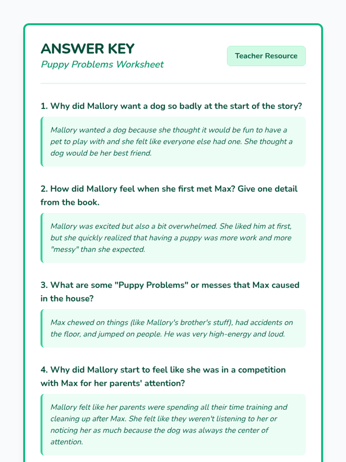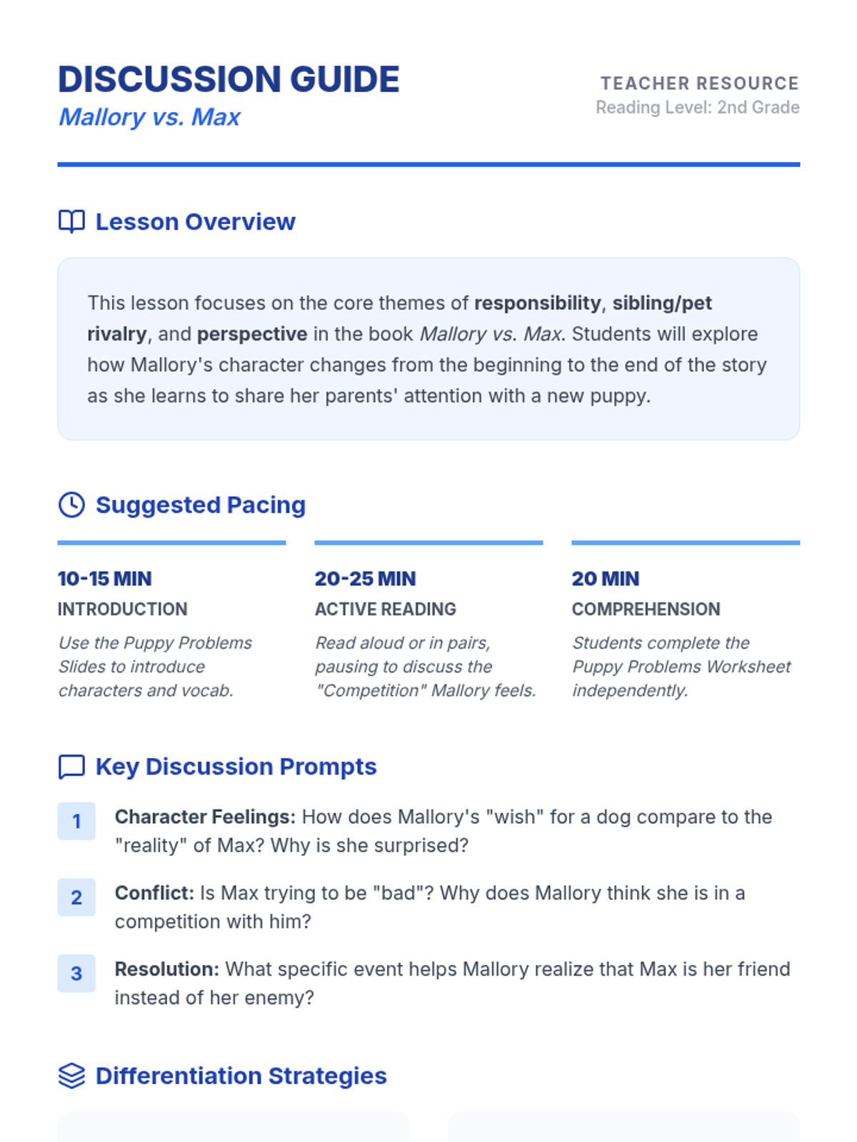 A collection of comprehension resources for the book 'Mallory vs. Max', focusing on character development and plot events for second-grade readers.