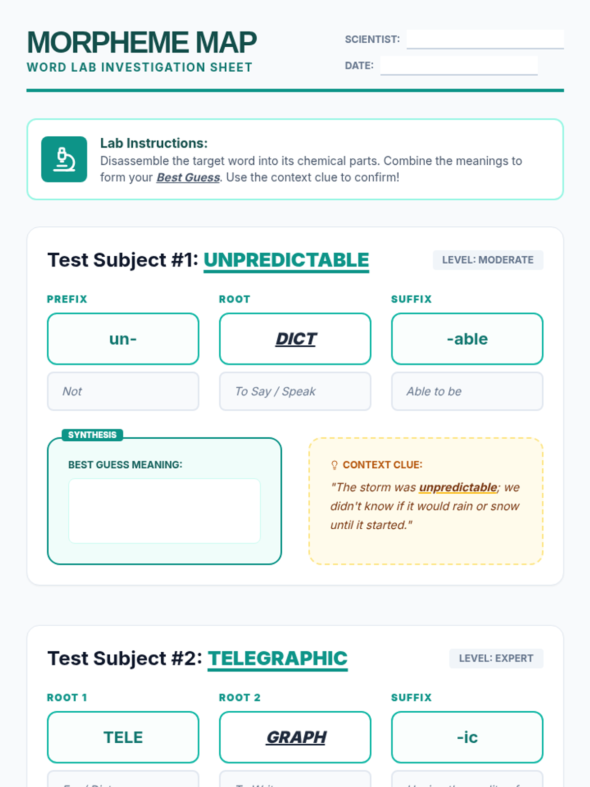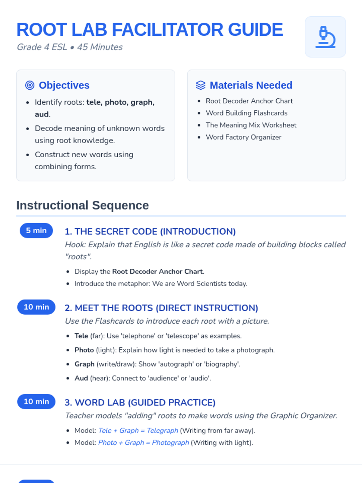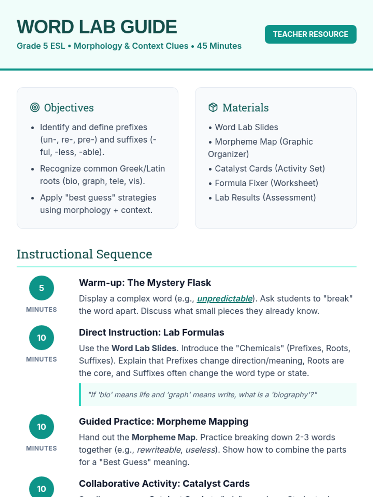 A 45-minute ESL lesson for 5th grade focusing on decoding word meanings using common prefixes, suffixes, and Greek/Latin roots. Students act as 'Word Scientists' in a lab to disassemble and rebuild complex vocabulary.