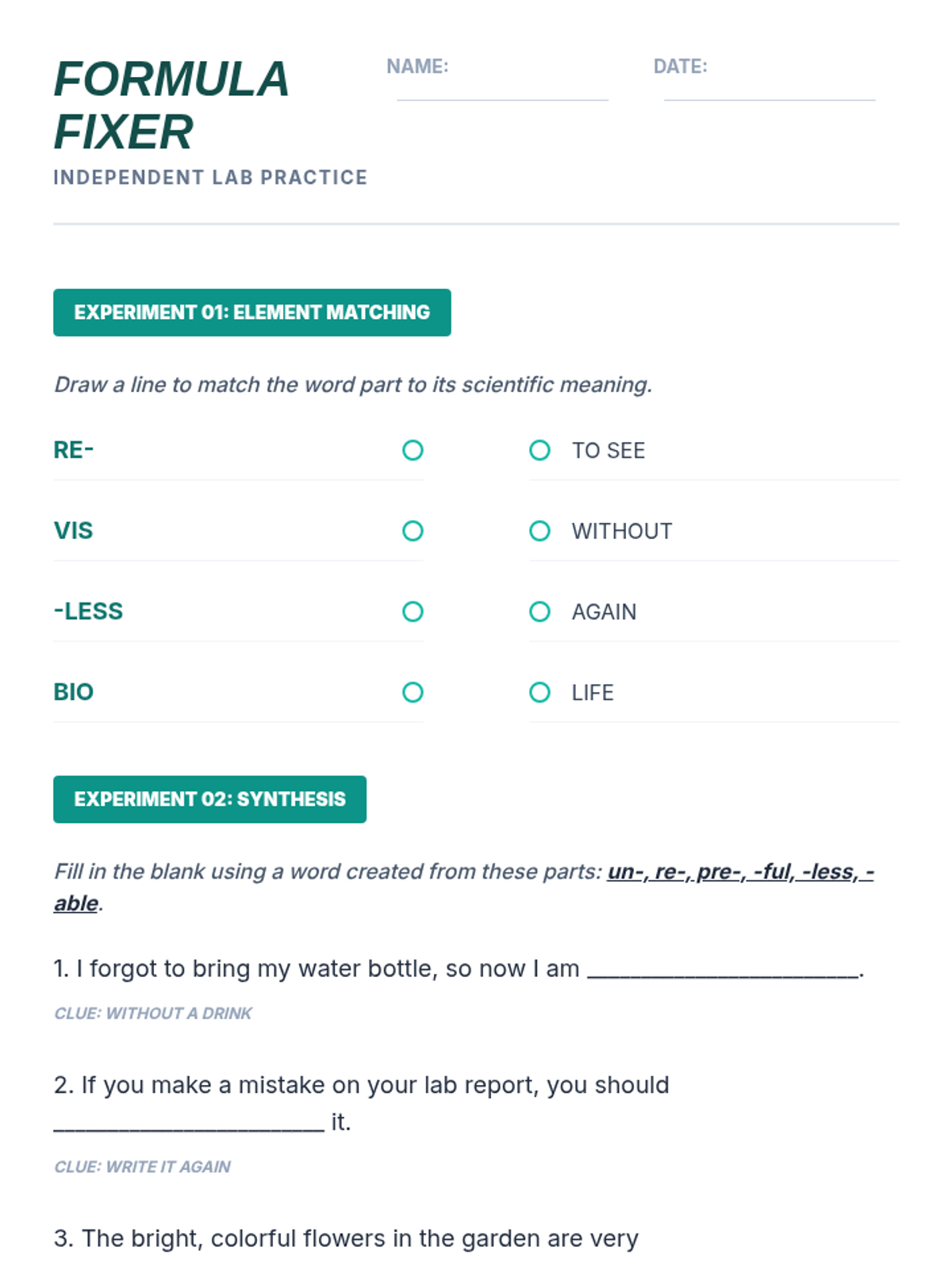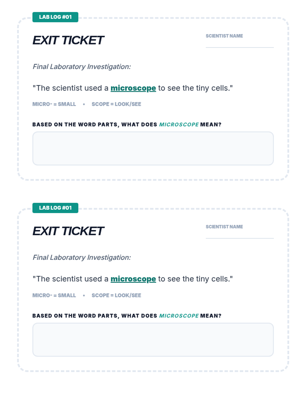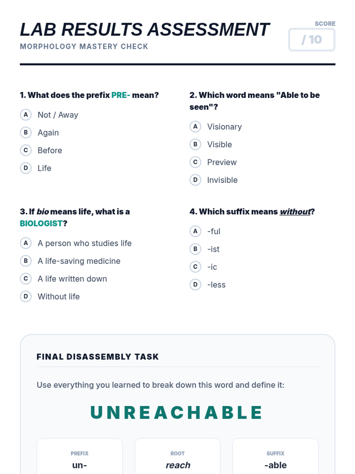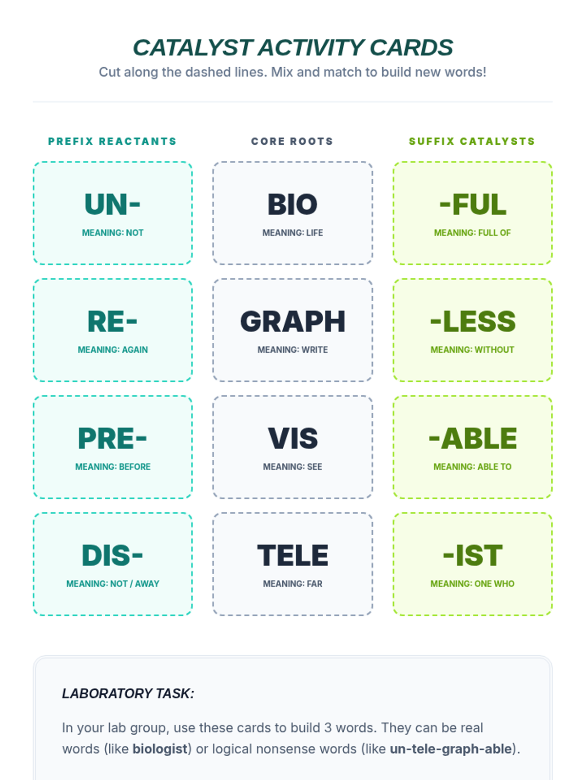 A 45-minute ESL lesson for 5th grade focusing on decoding word meanings using common prefixes, suffixes, and Greek/Latin roots. Students act as 'Word Scientists' in a lab to disassemble and rebuild complex vocabulary.