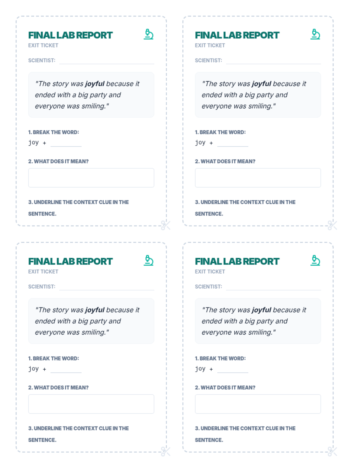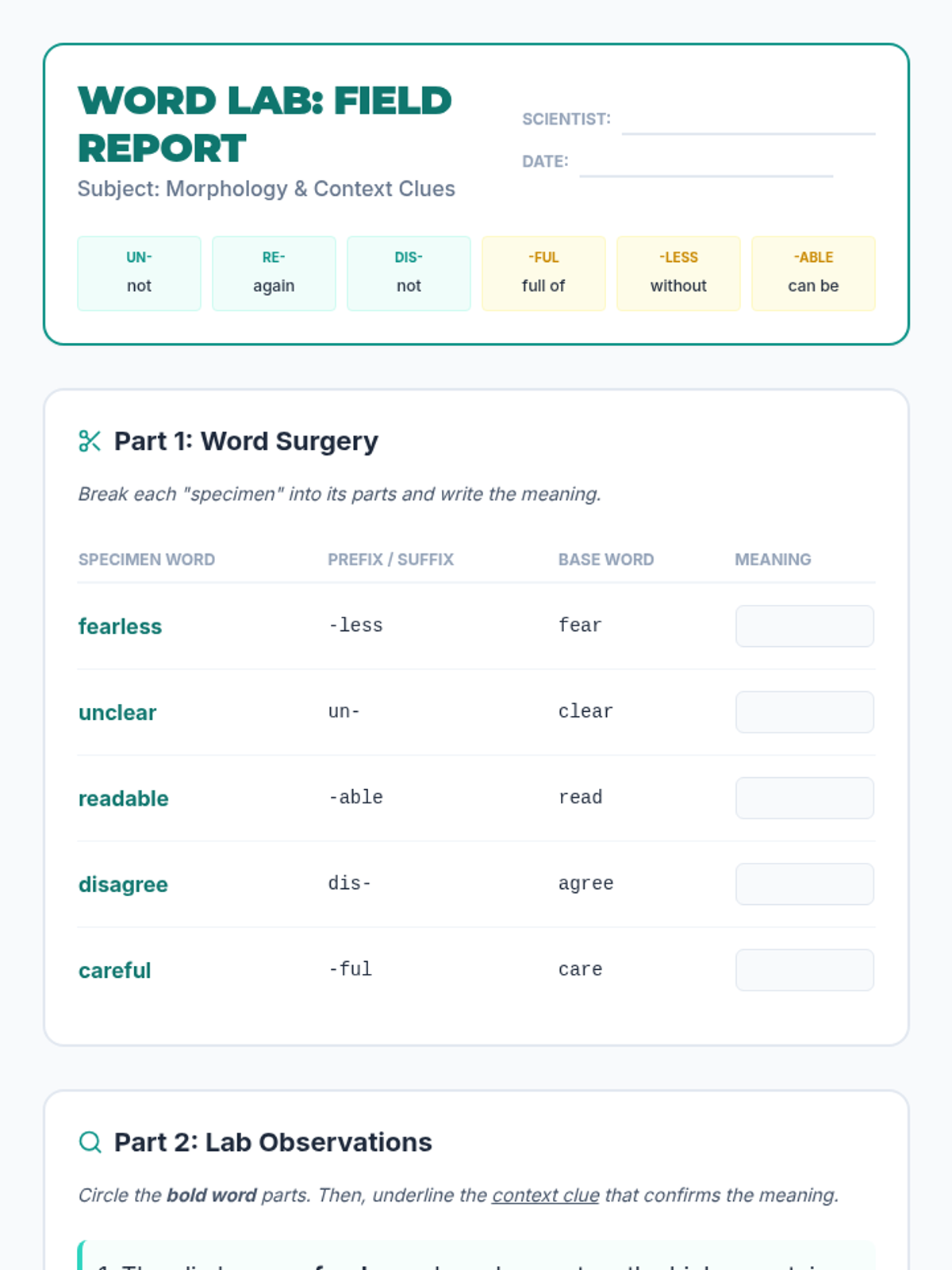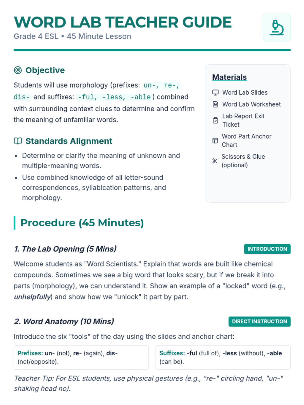 A 45-minute Grade 4 ESL lesson focused on decoding unfamiliar words using morphology (un-, re-, dis-, -ful, -less, -able) and context clues. Students act as word scientists to break down and build words within sentences.