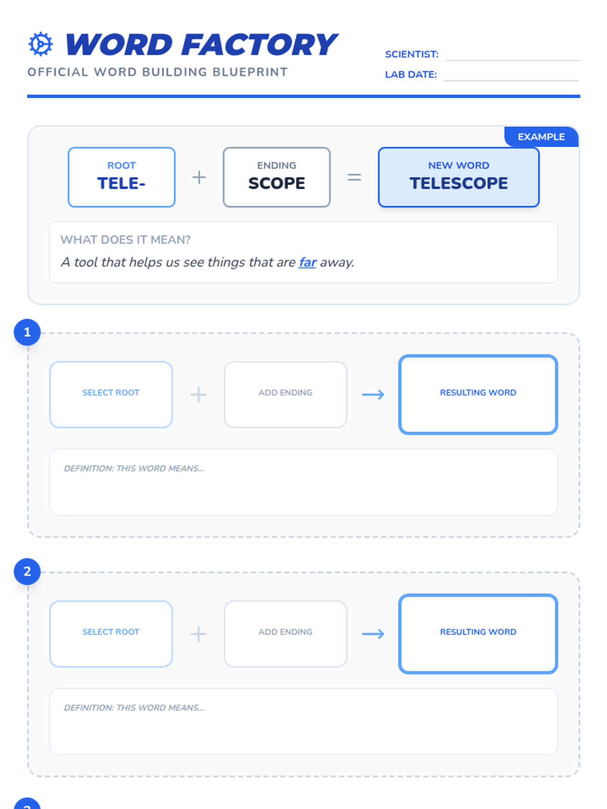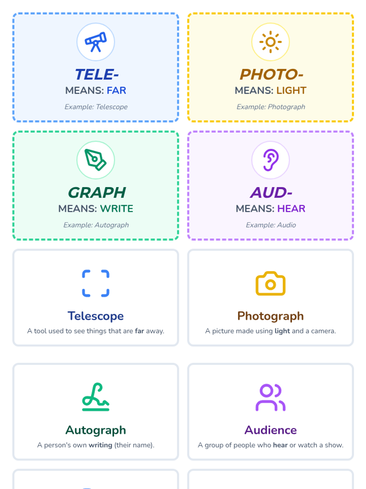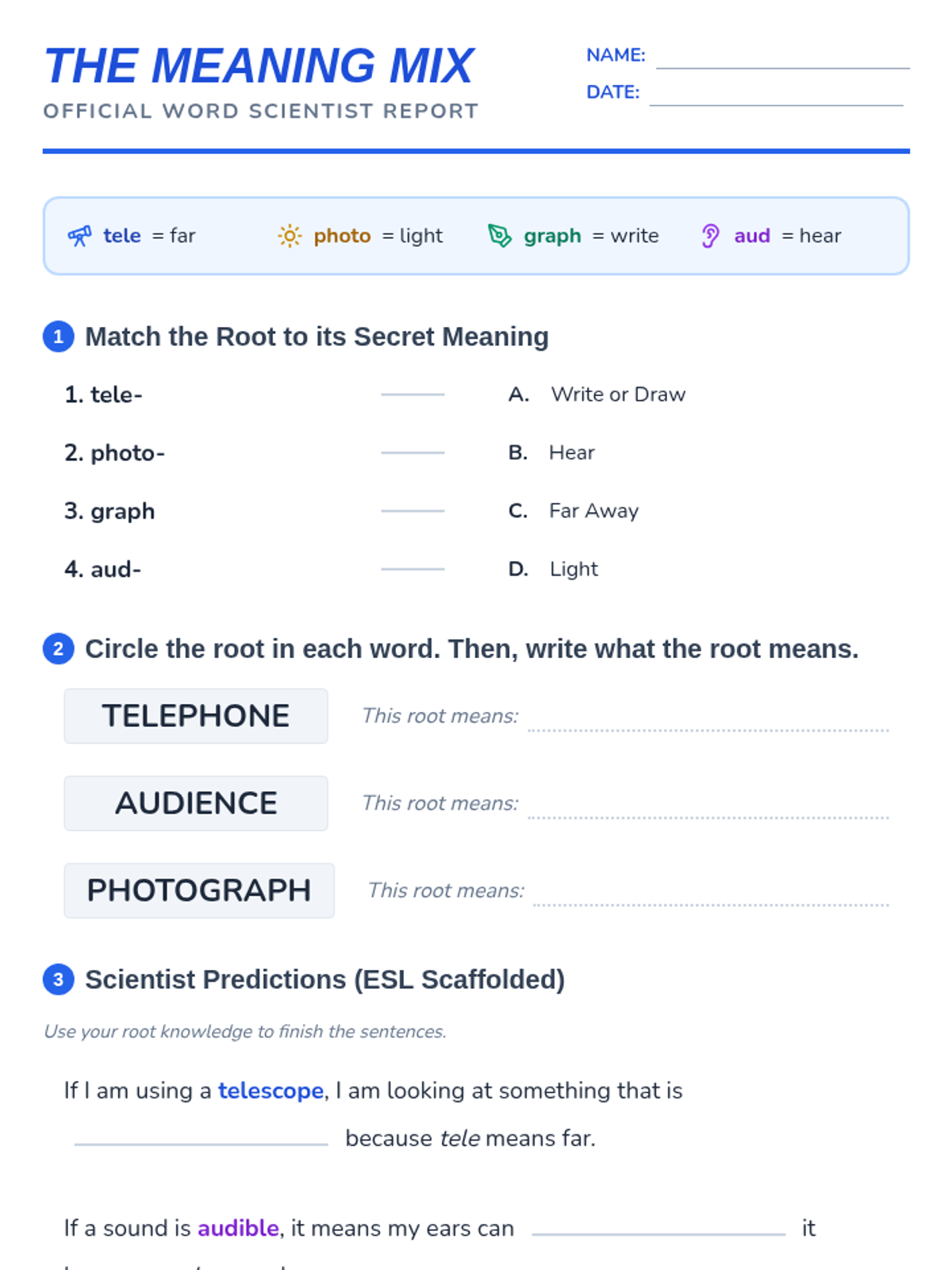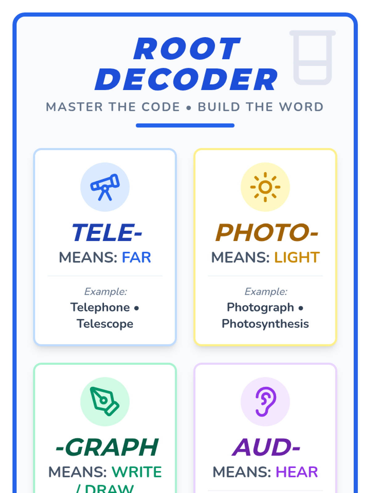 A 45-minute ESL lesson for 4th graders to decode and build words using the roots tele, photo, graph, and aud. students will act as 'Word Scientists' in a laboratory-themed environment.