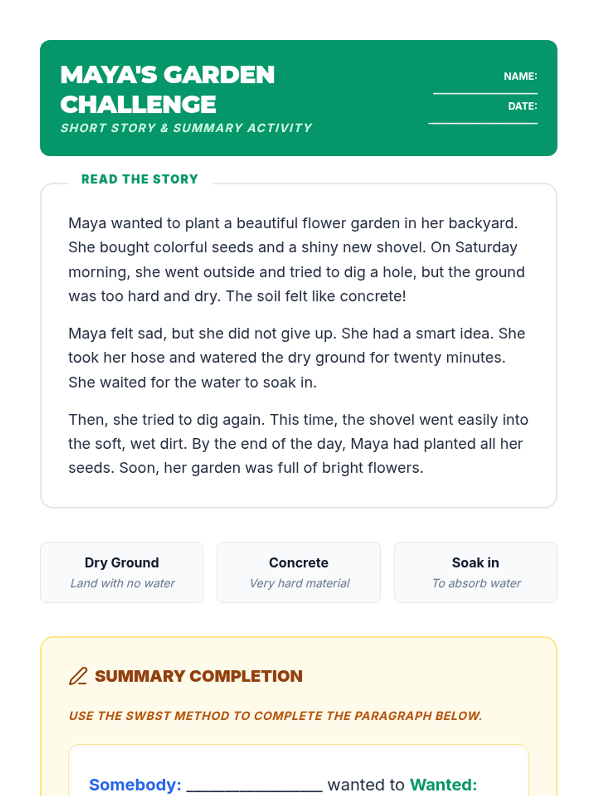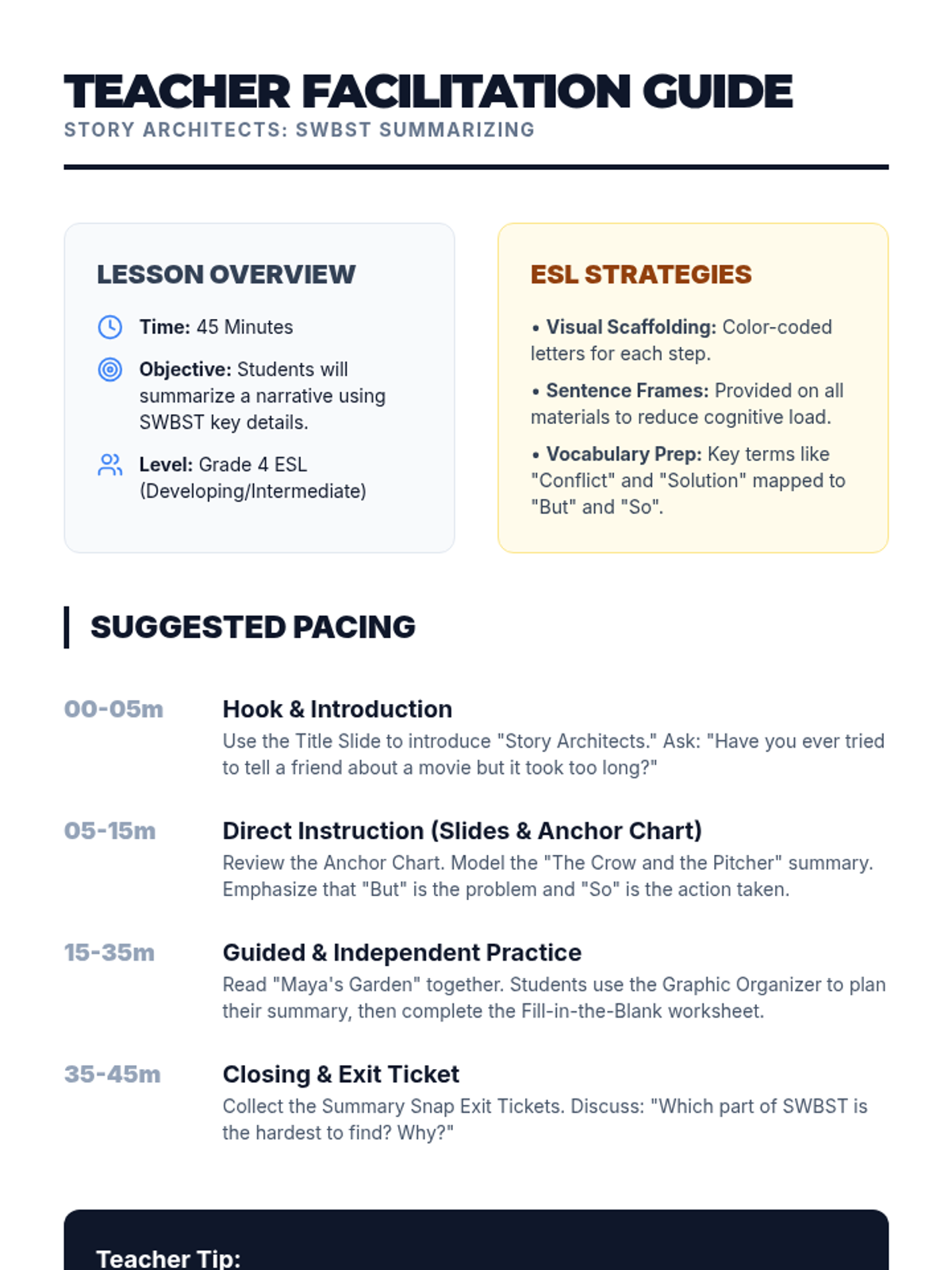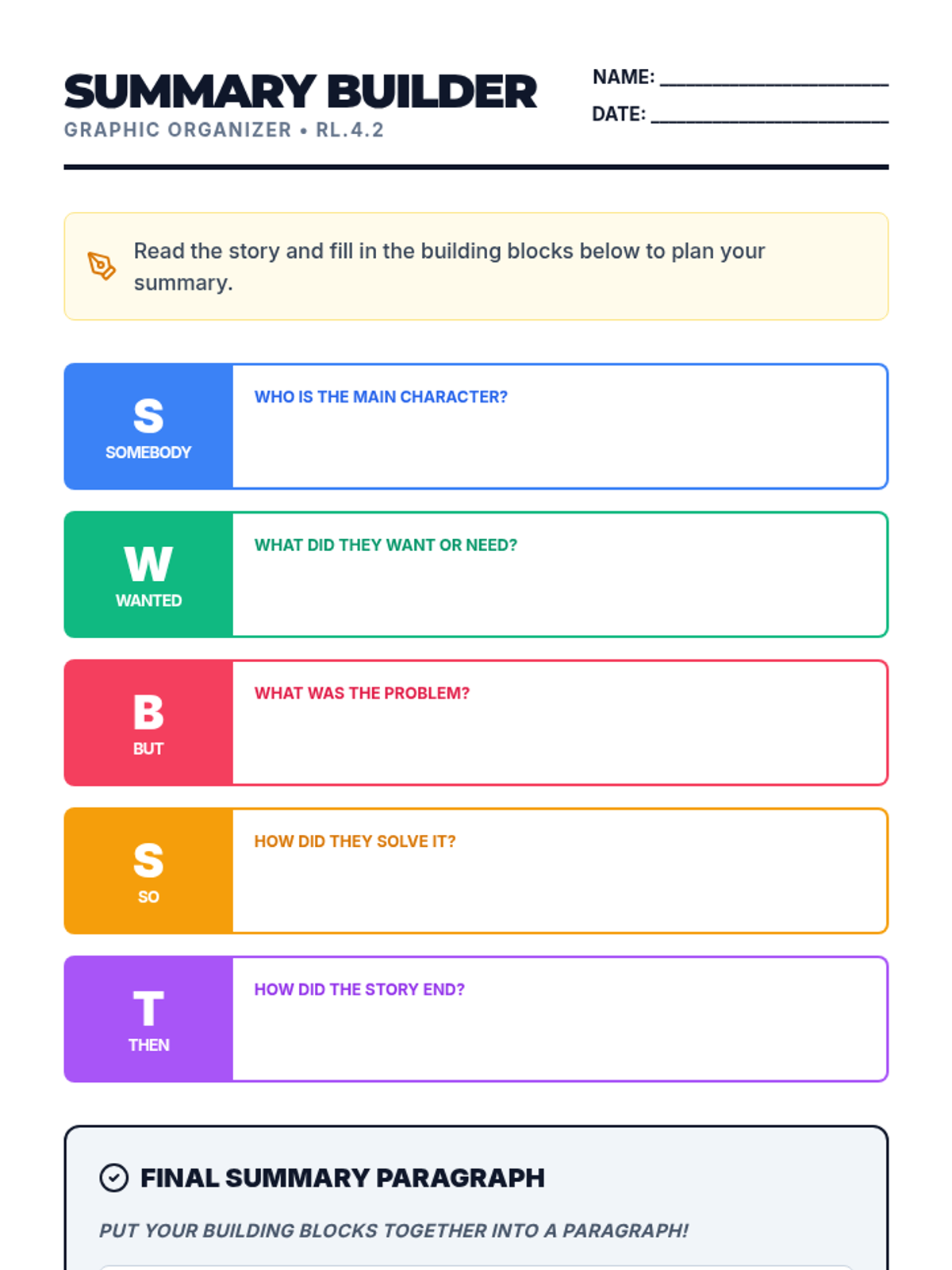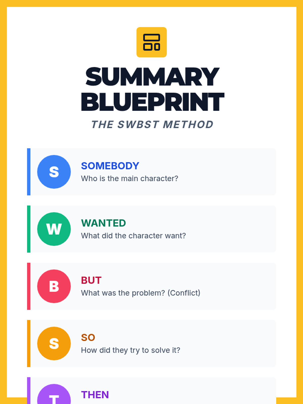 Students will learn to summarize narrative texts using the 'Somebody Wanted But So Then' (SWBST) framework. This lesson is designed for Grade 4 ESL students at the developing/intermediate level, focusing on identifying key plot elements and synthesizing them into a concise summary.