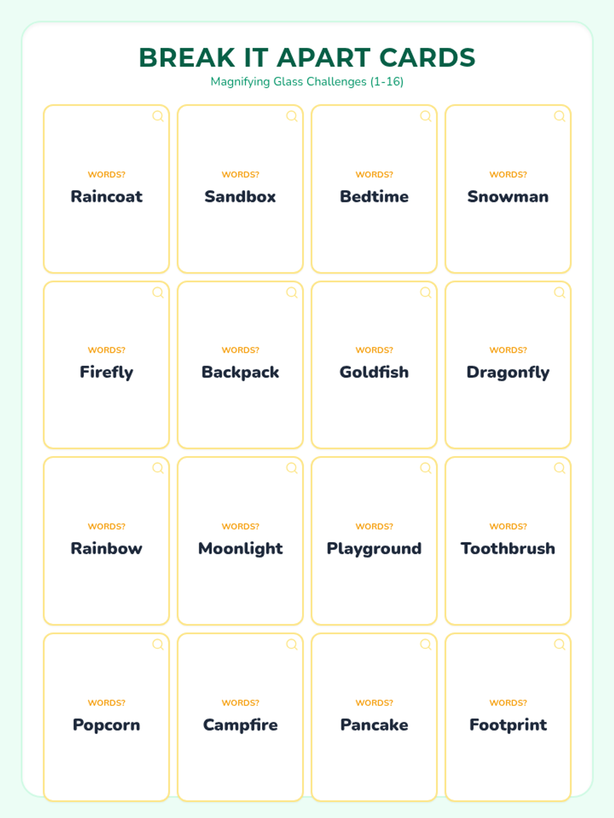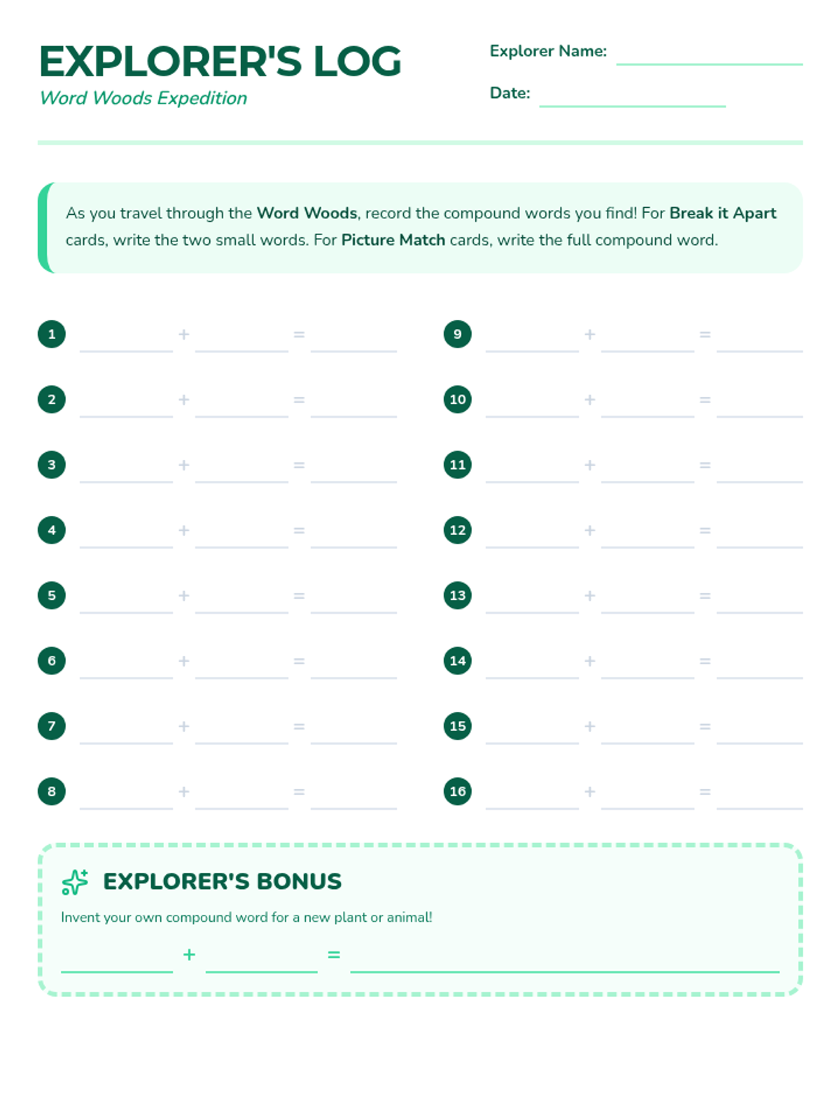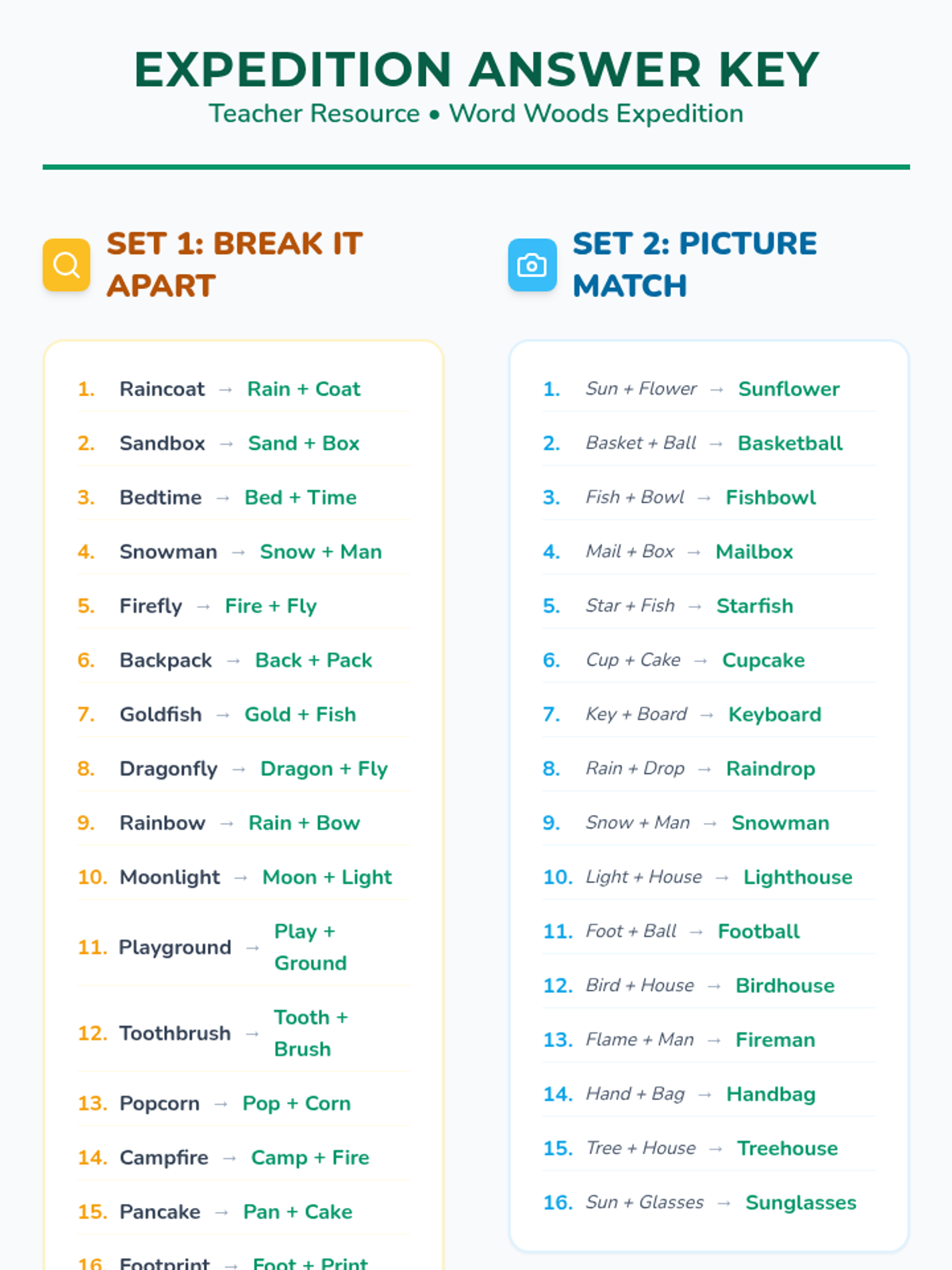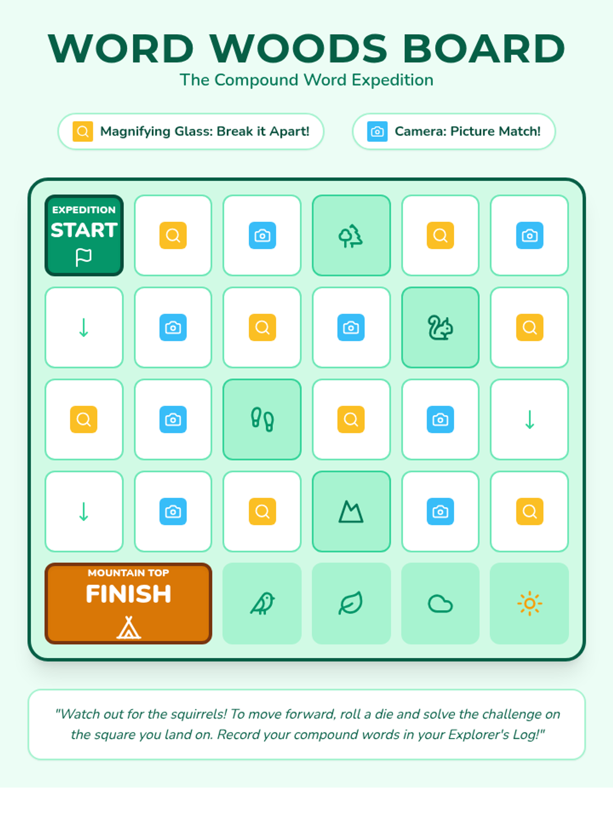 A hands-on board game experience where students explore the forest of compound words, practicing how to decompose words and match visual parts to create new ones.
