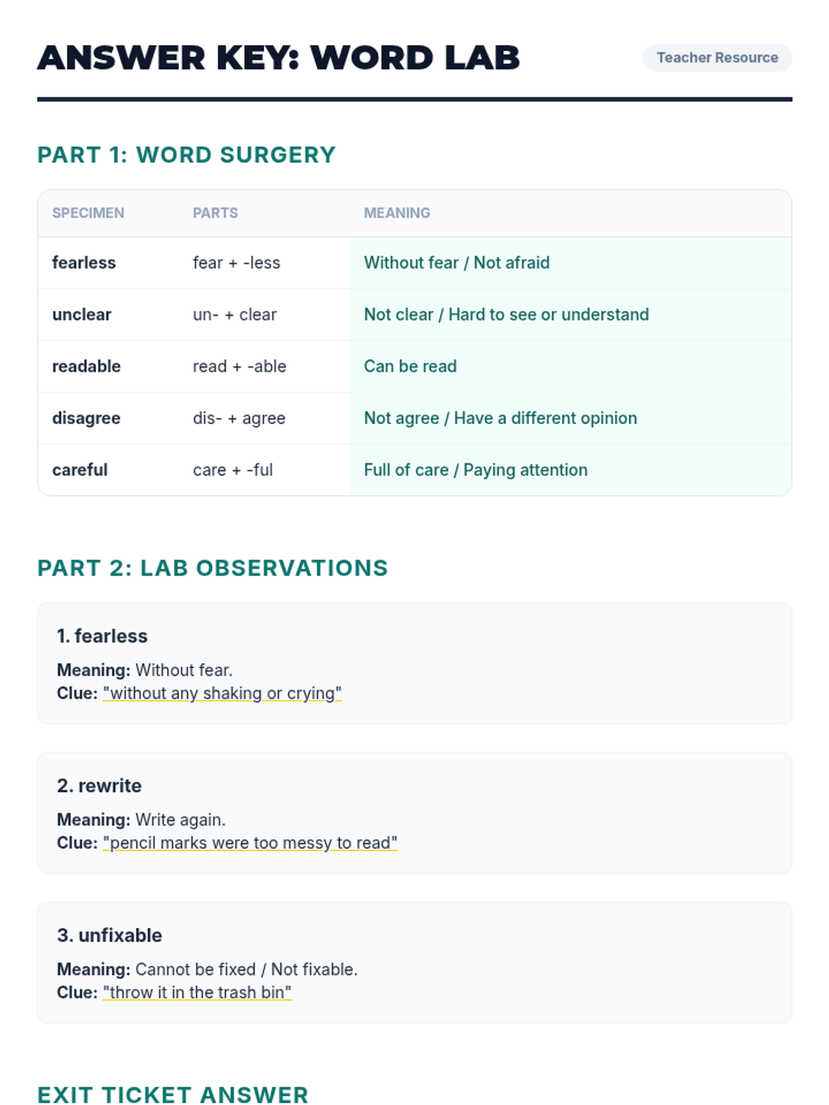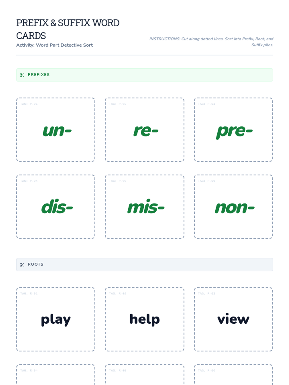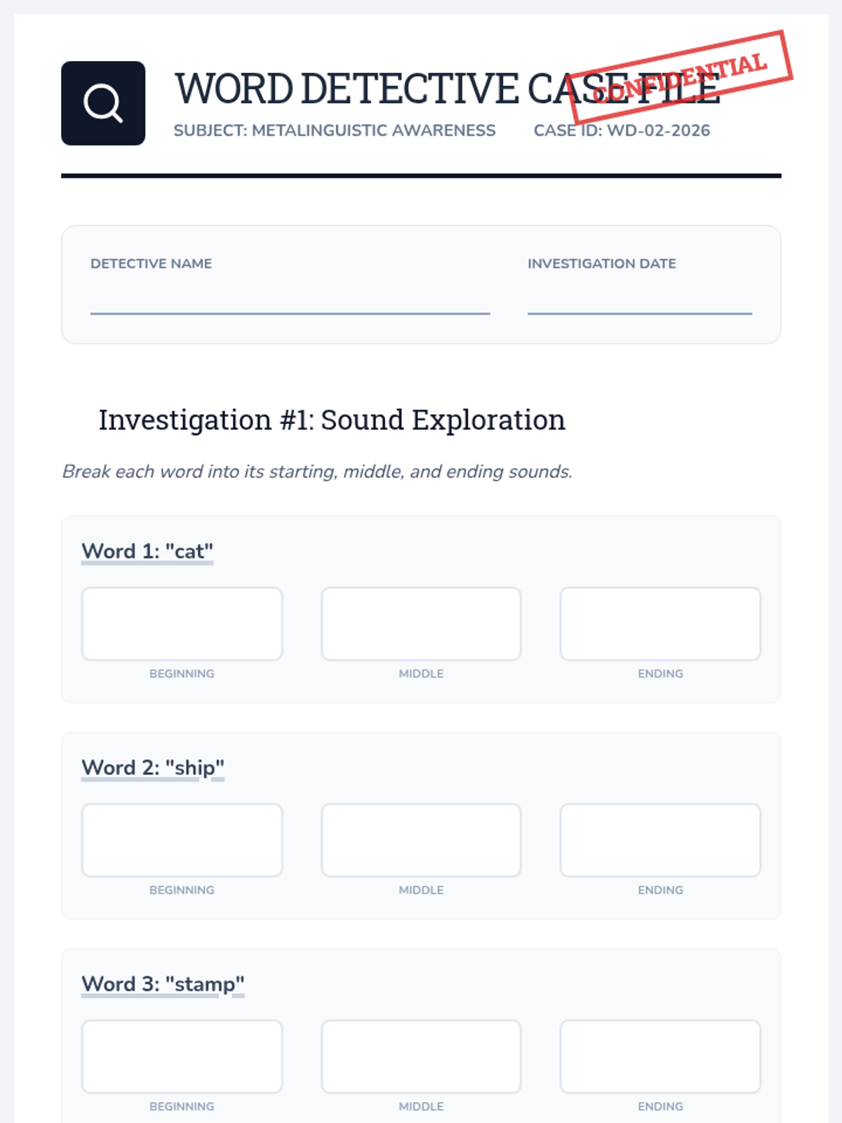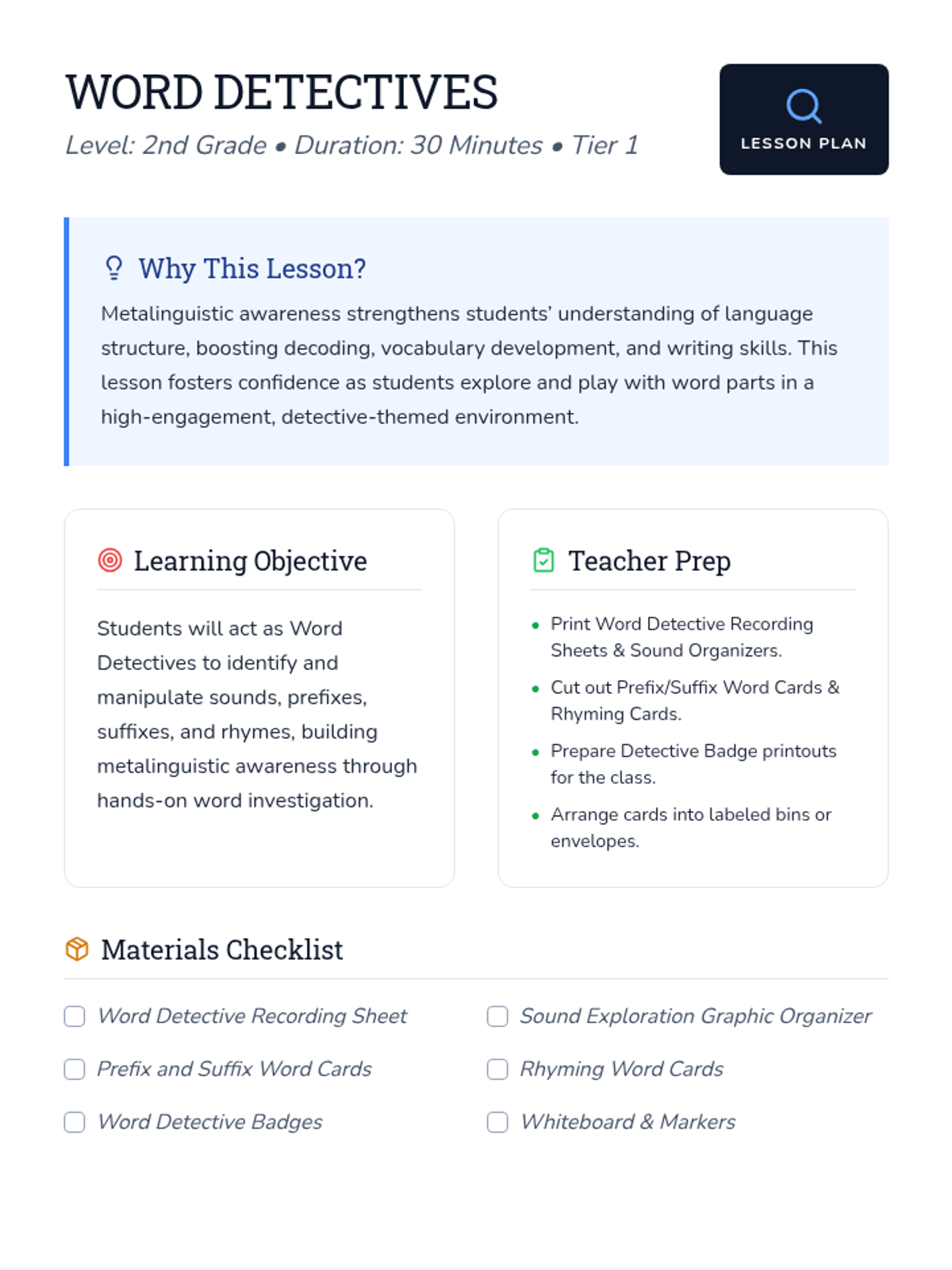 A high-energy 2nd-grade lesson where students become Word Detectives to investigate language structure through sounds, prefixes, suffixes, and rhymes. This lesson builds metalinguistic awareness through interactive sorting and discovery.