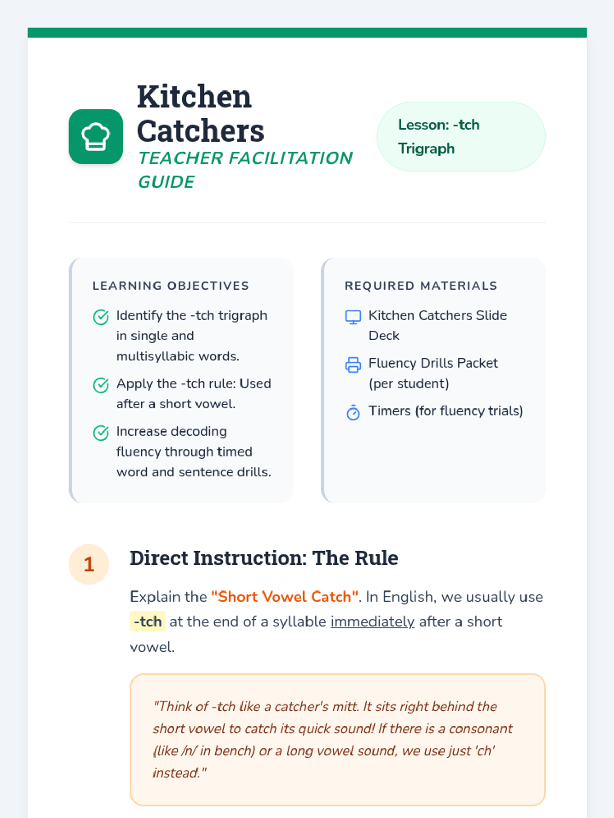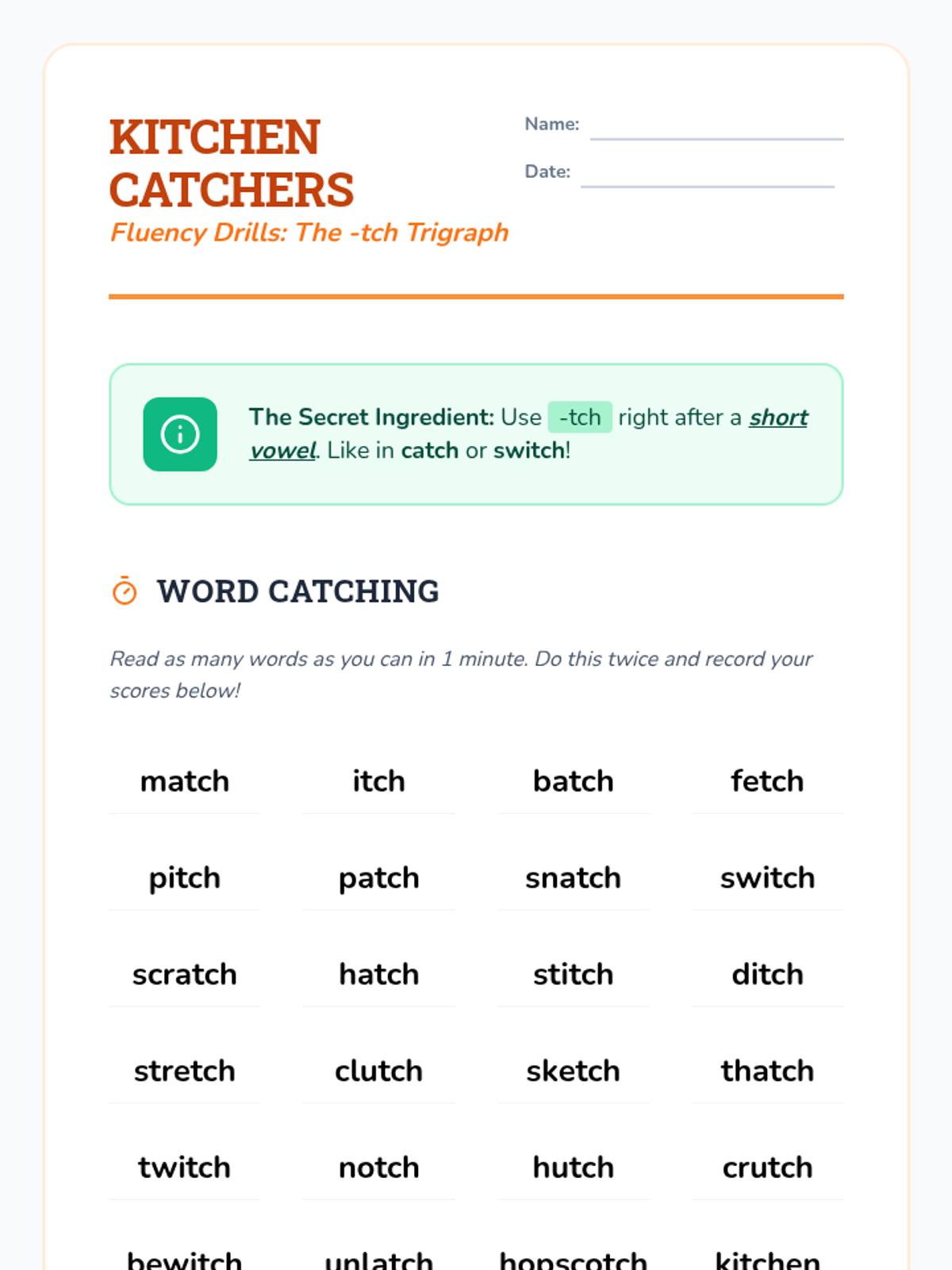 A focused lesson on decoding and blending words with the -tch trigraph, using a kitchen-themed approach to engage students in fluency drills.