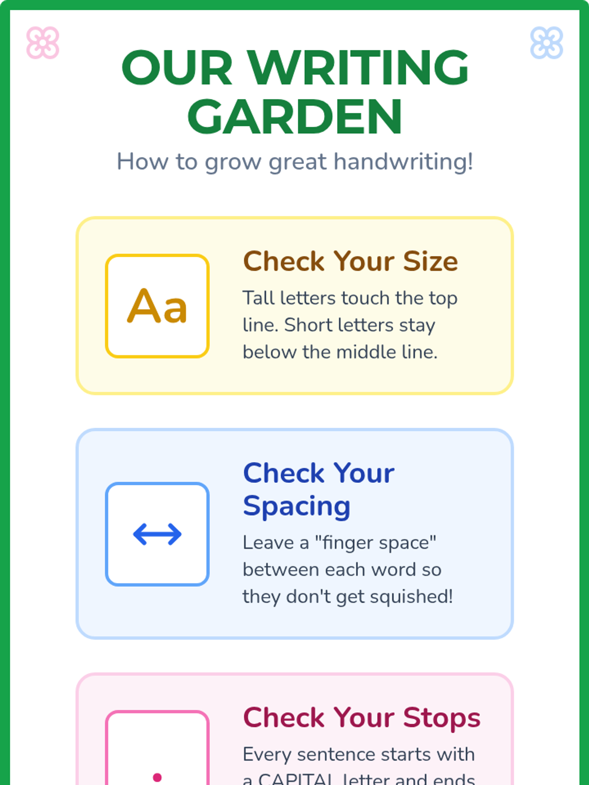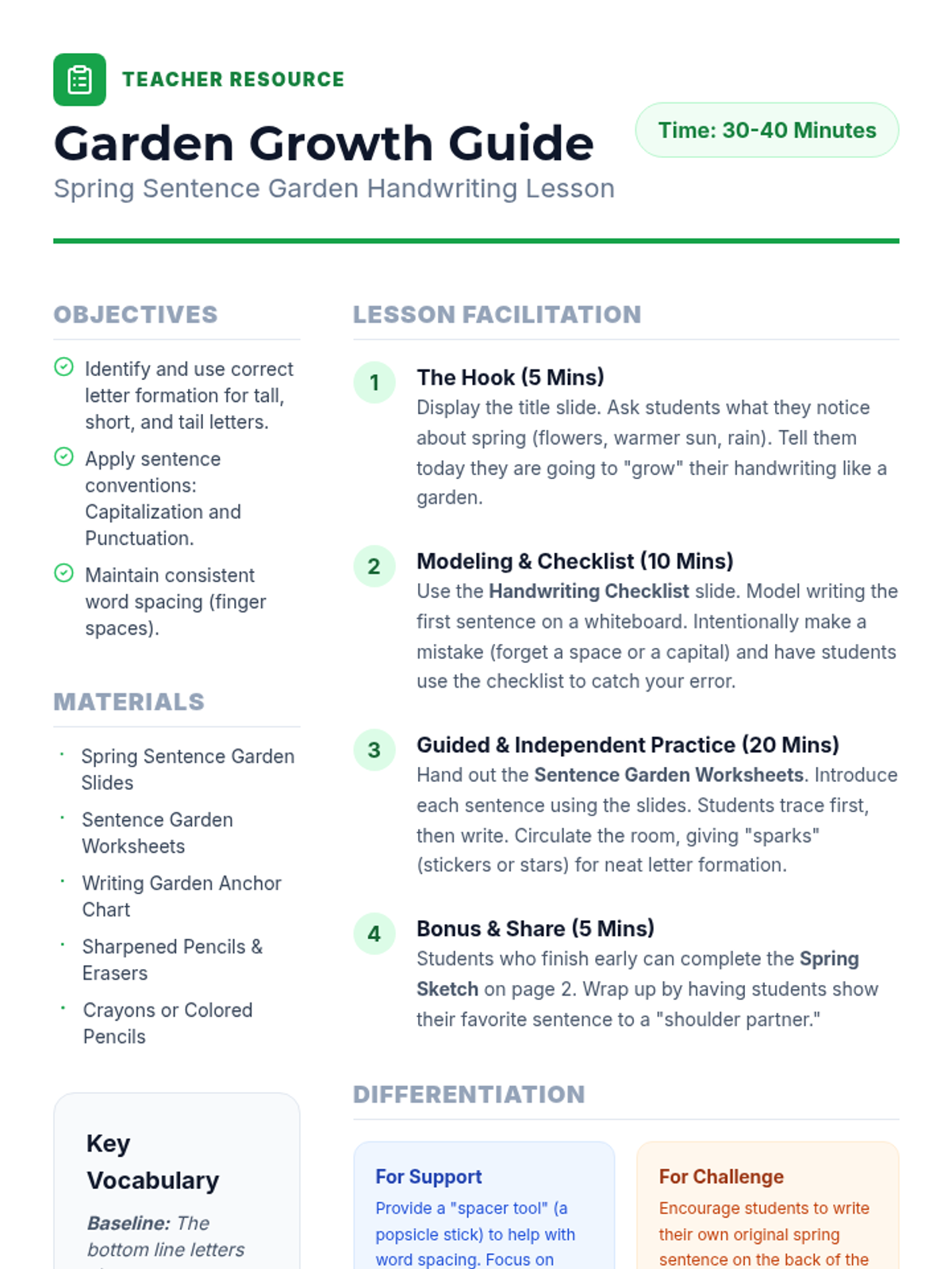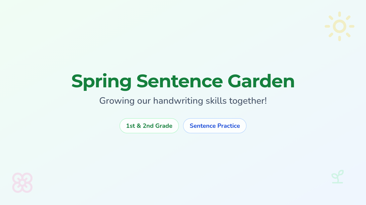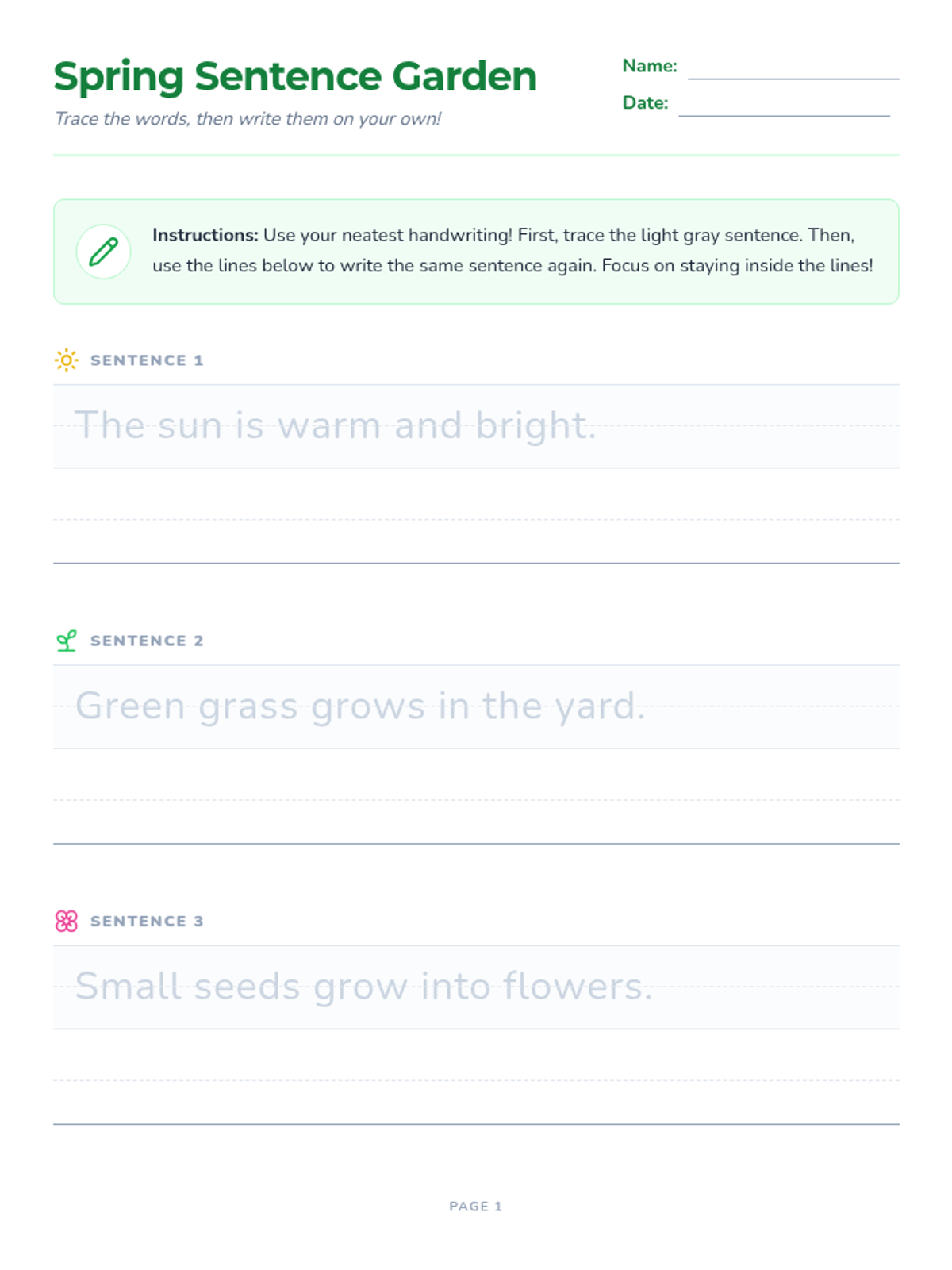 A handwriting practice lesson focused on spring-themed sentences, designed to help 1st and 2nd grade students improve their letter formation and sentence structure while celebrating the season.