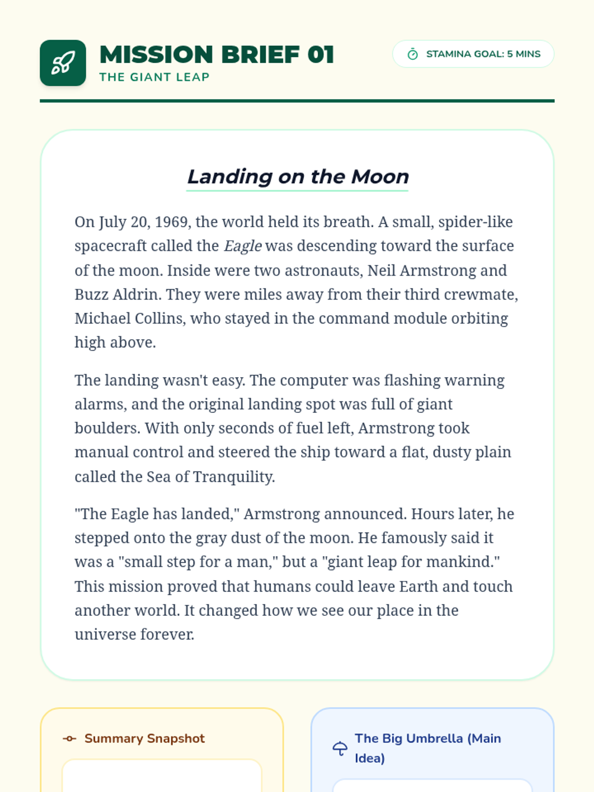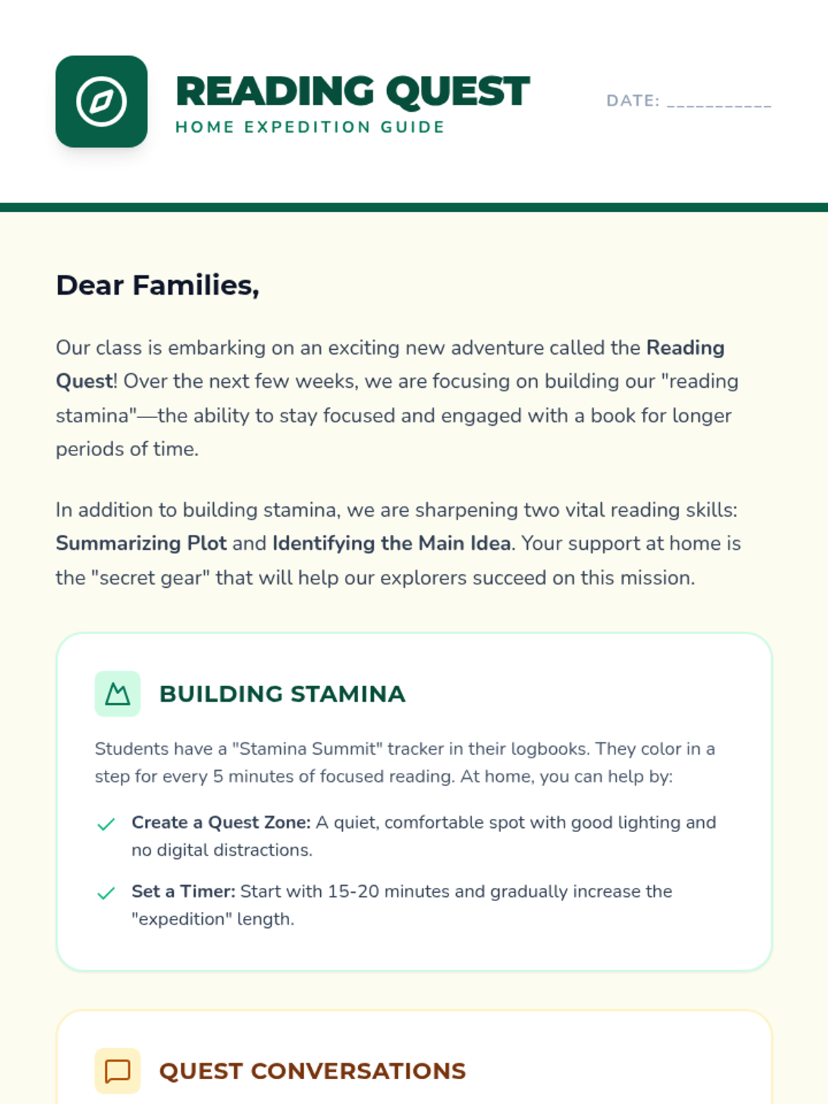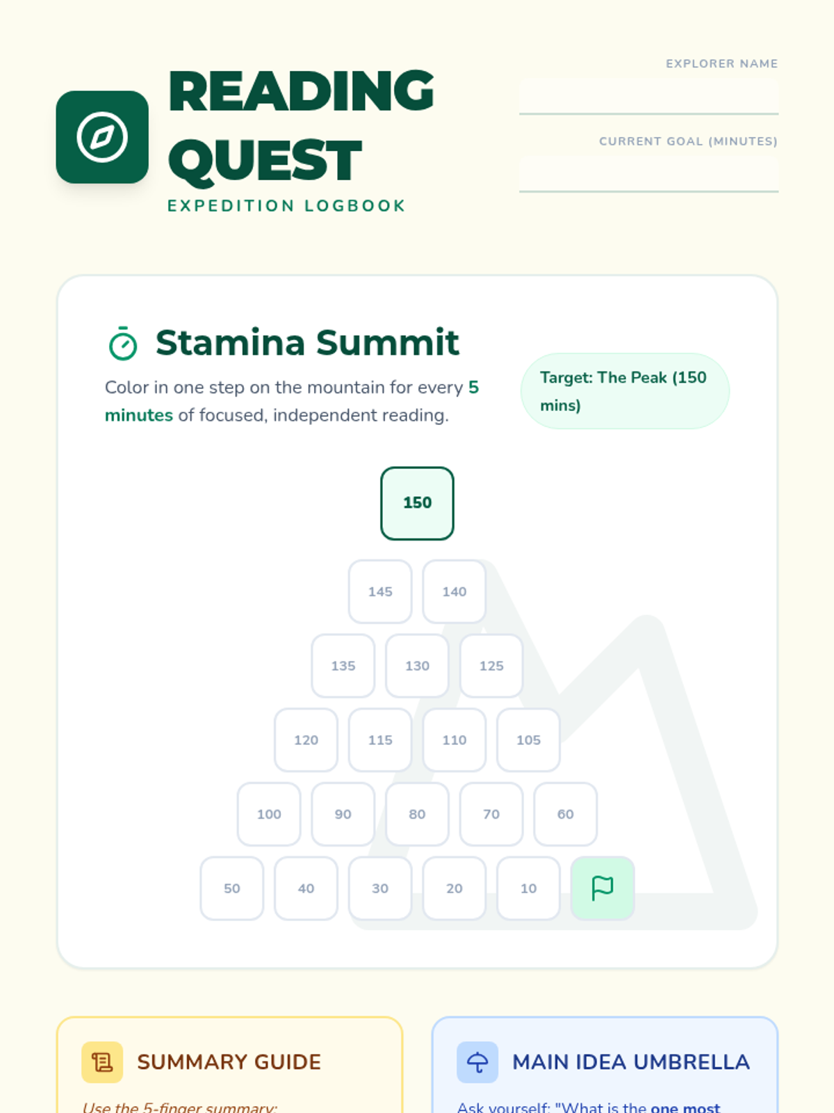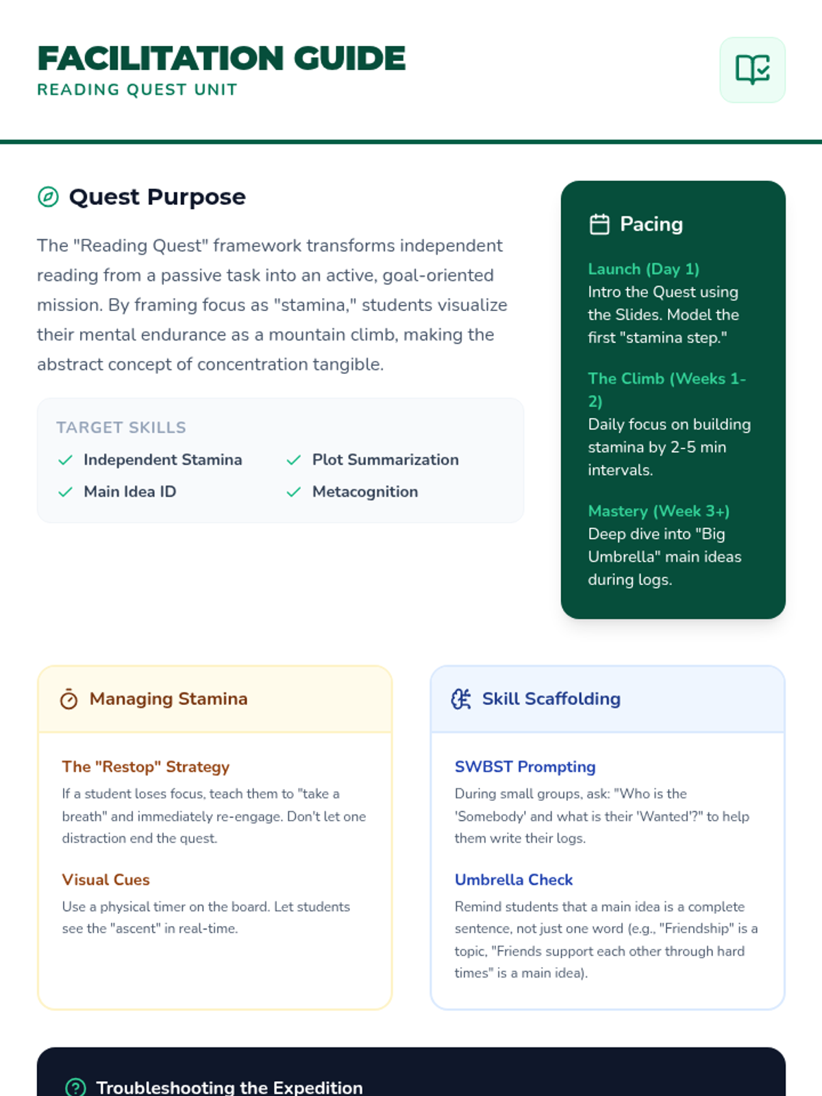 A comprehensive reading unit focused on building independent reading stamina while reinforcing plot summarization and main idea identification. This lesson provides students with a 'quest' framework to make focused reading more engaging.
