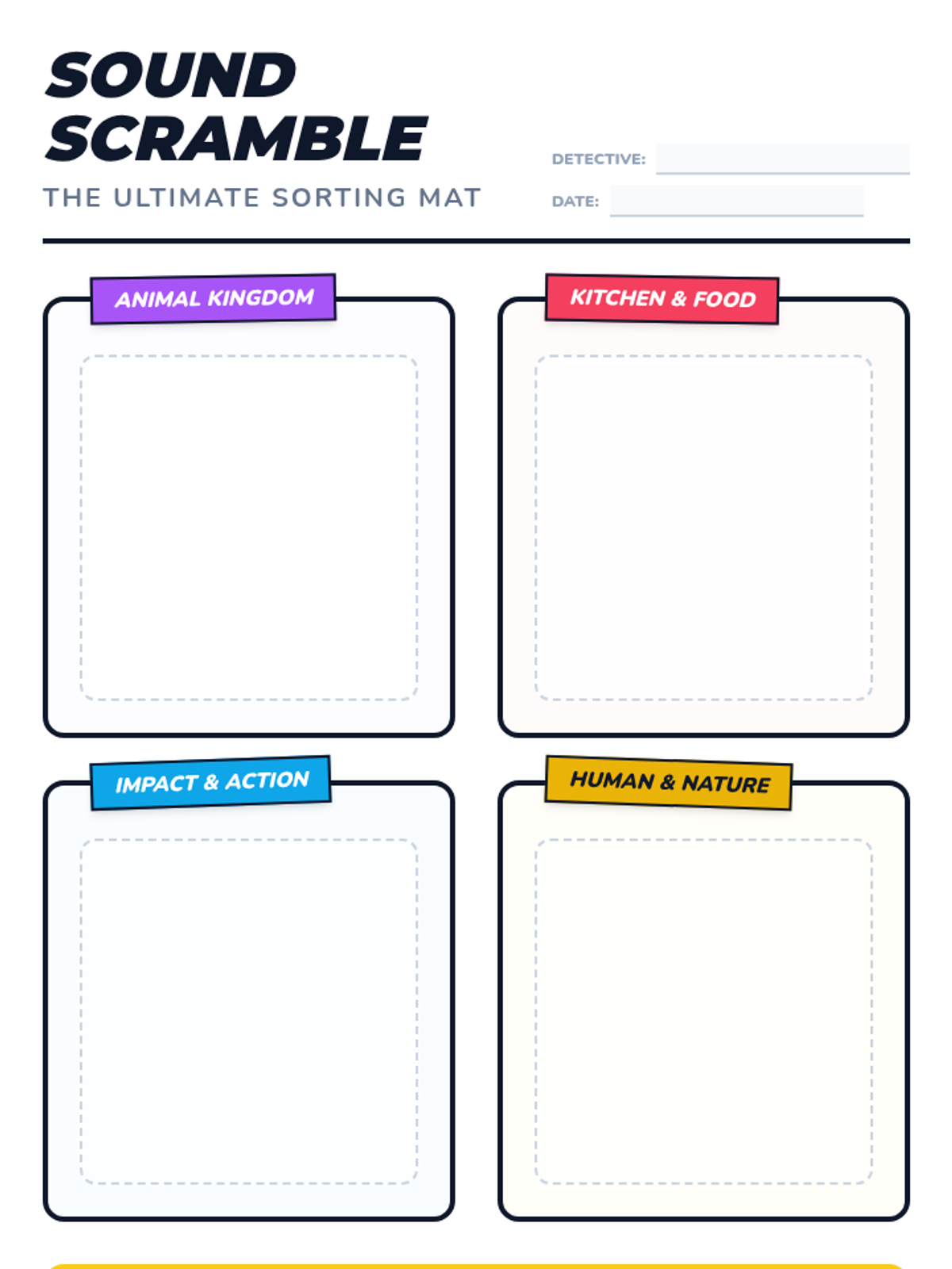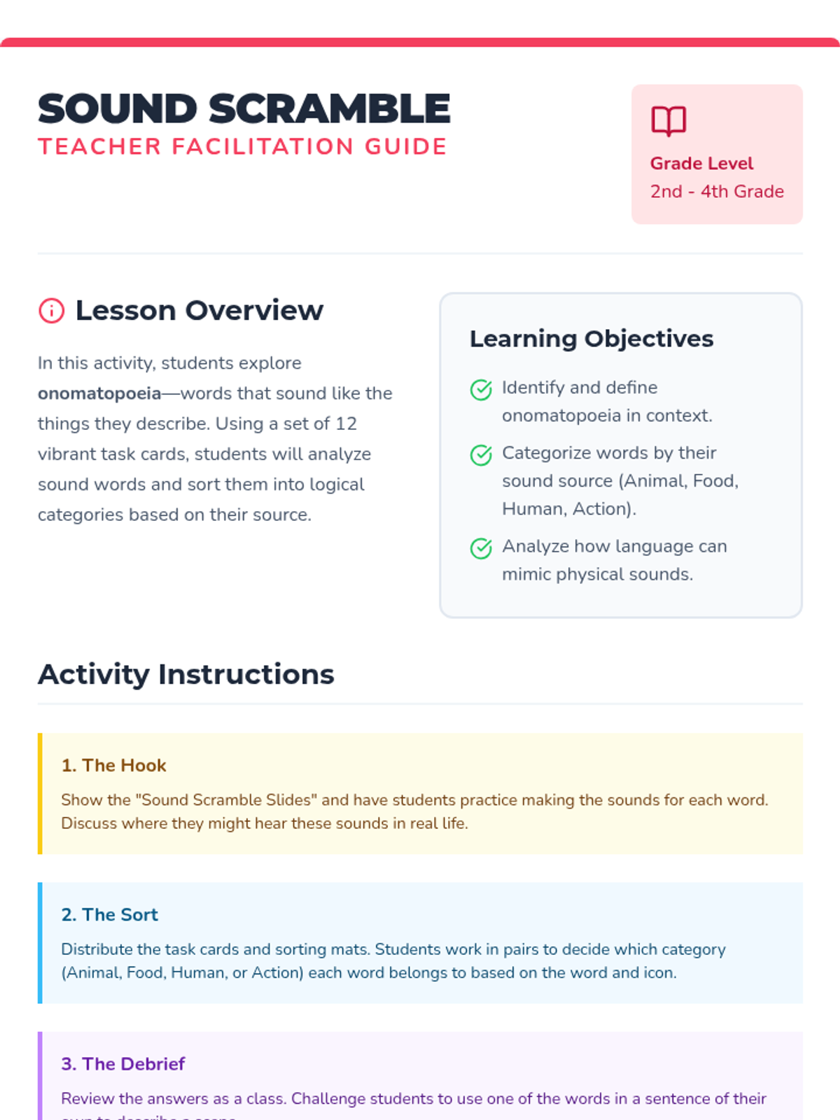 A high-energy introduction to onomatopoeia where students categorize sound-effect words using comic-book styled task cards. Students will explore how language can mimic sounds from animals, nature, and the kitchen.