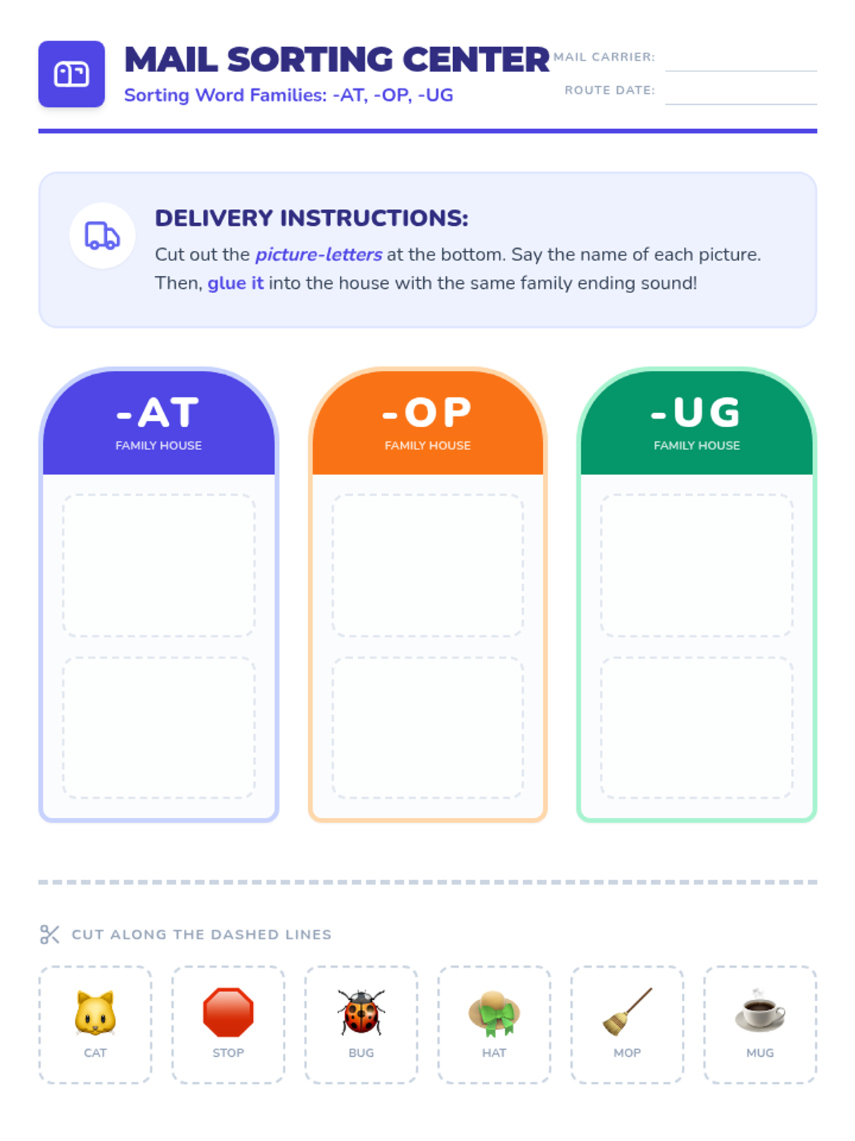 Categorizes words into specific word families (-at, -op, -ug) using a mail delivery simulation.
