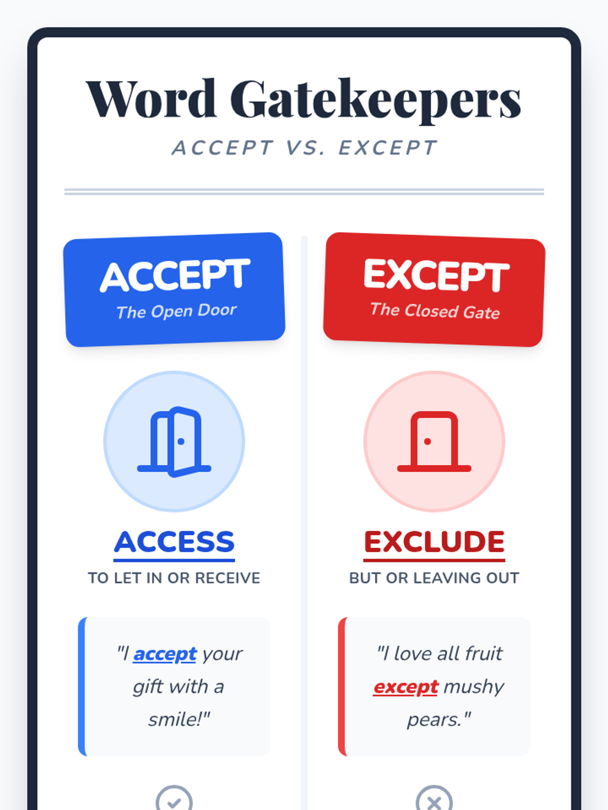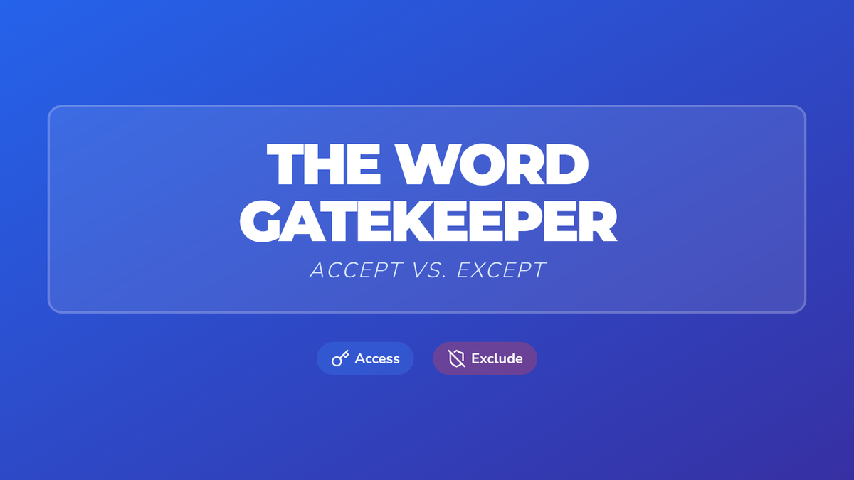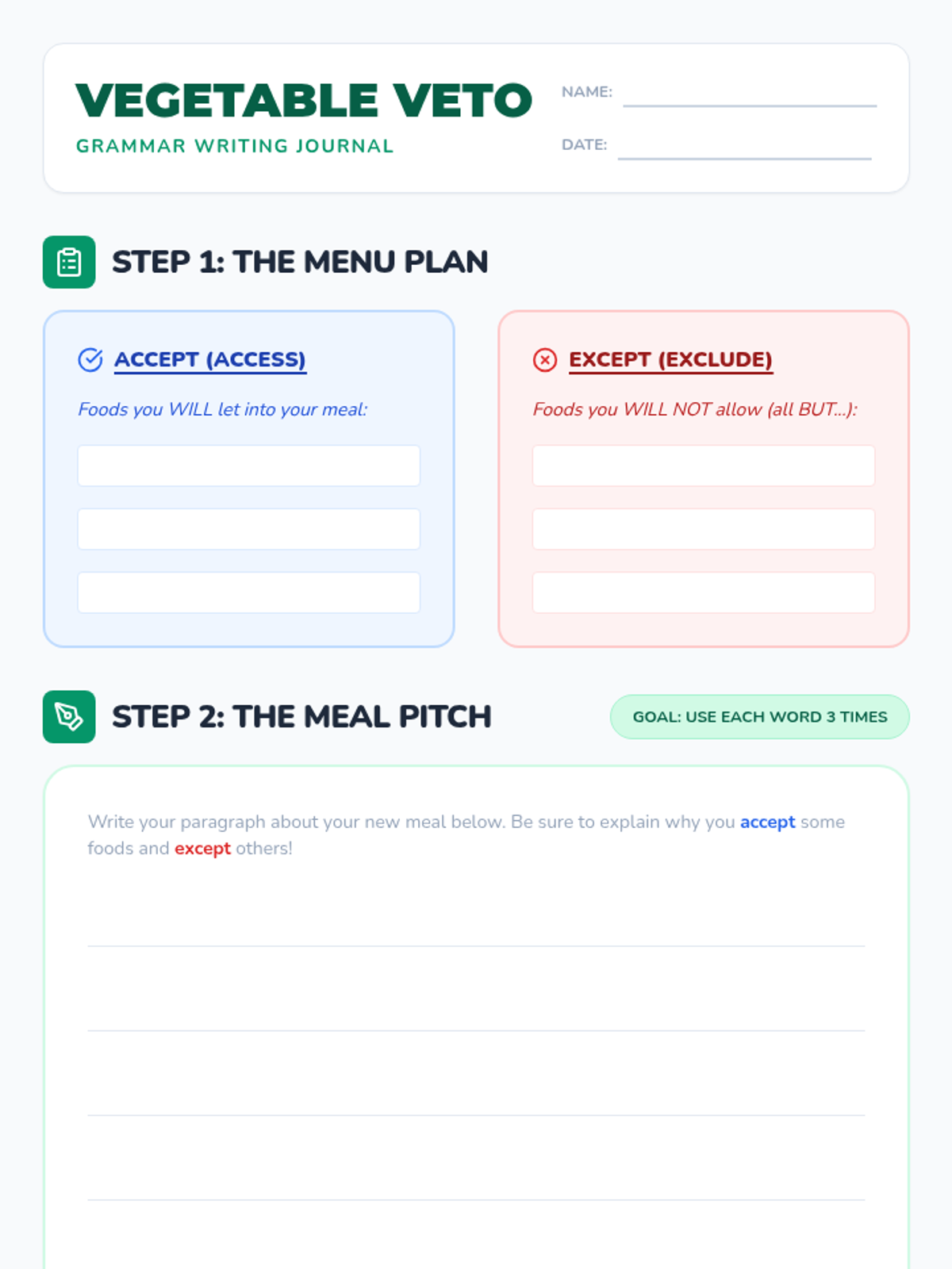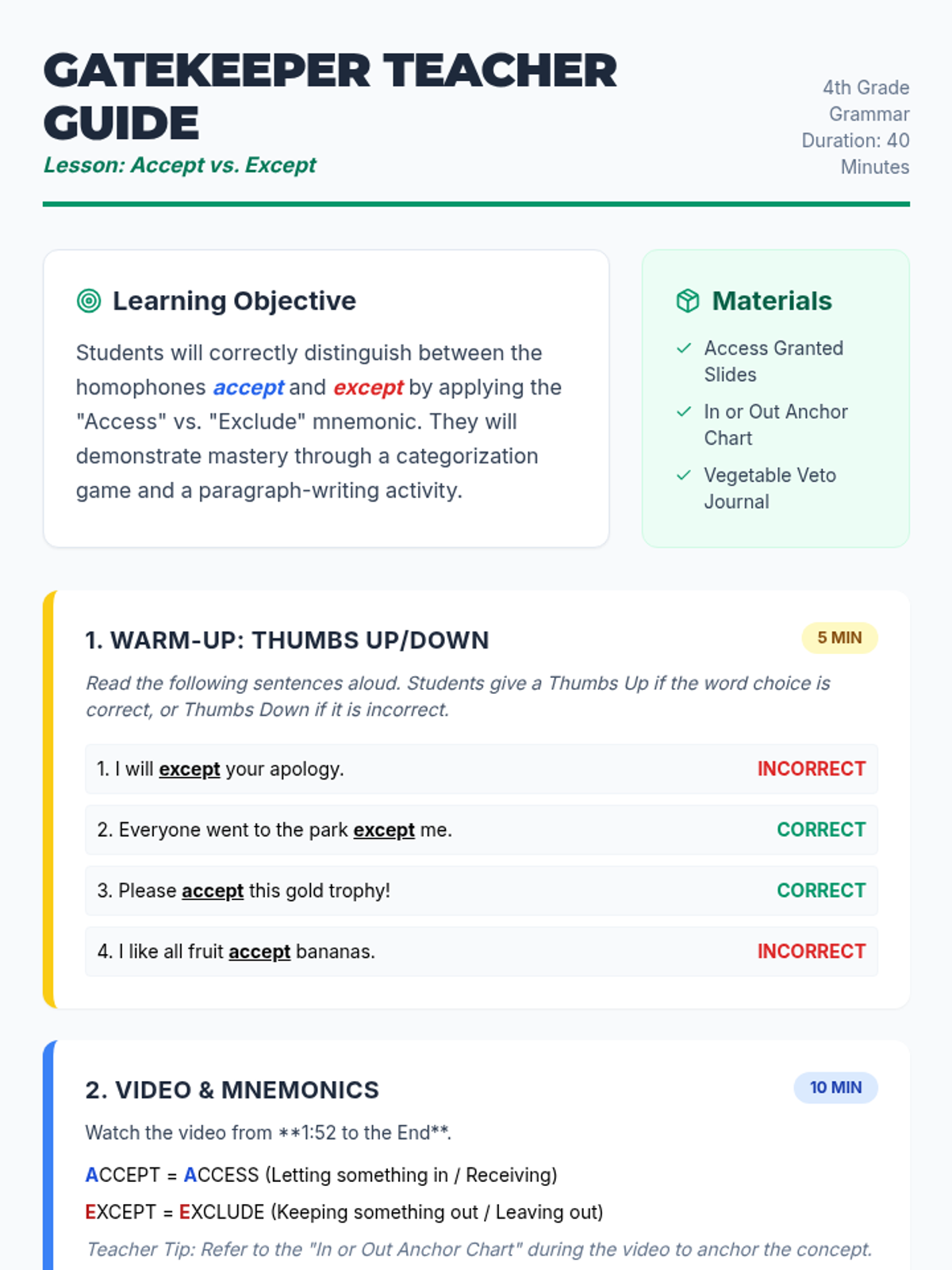 A 4th-grade grammar lesson focused on distinguishing between 'accept' and 'except' using mnemonics and a creative writing activity called 'The Vegetable Veto'. Students learn to associate 'accept' with 'access' and 'except' with 'exclude'.