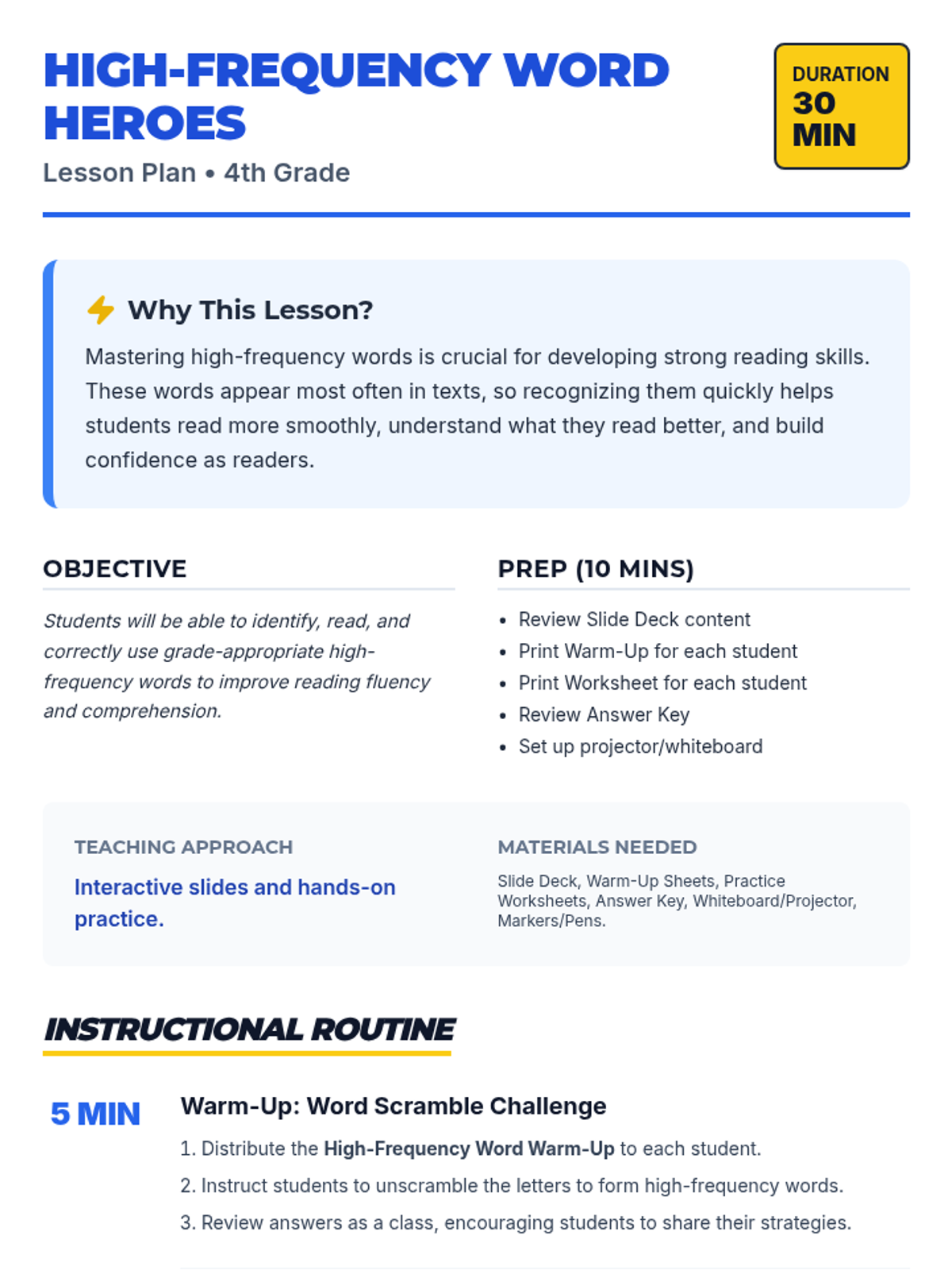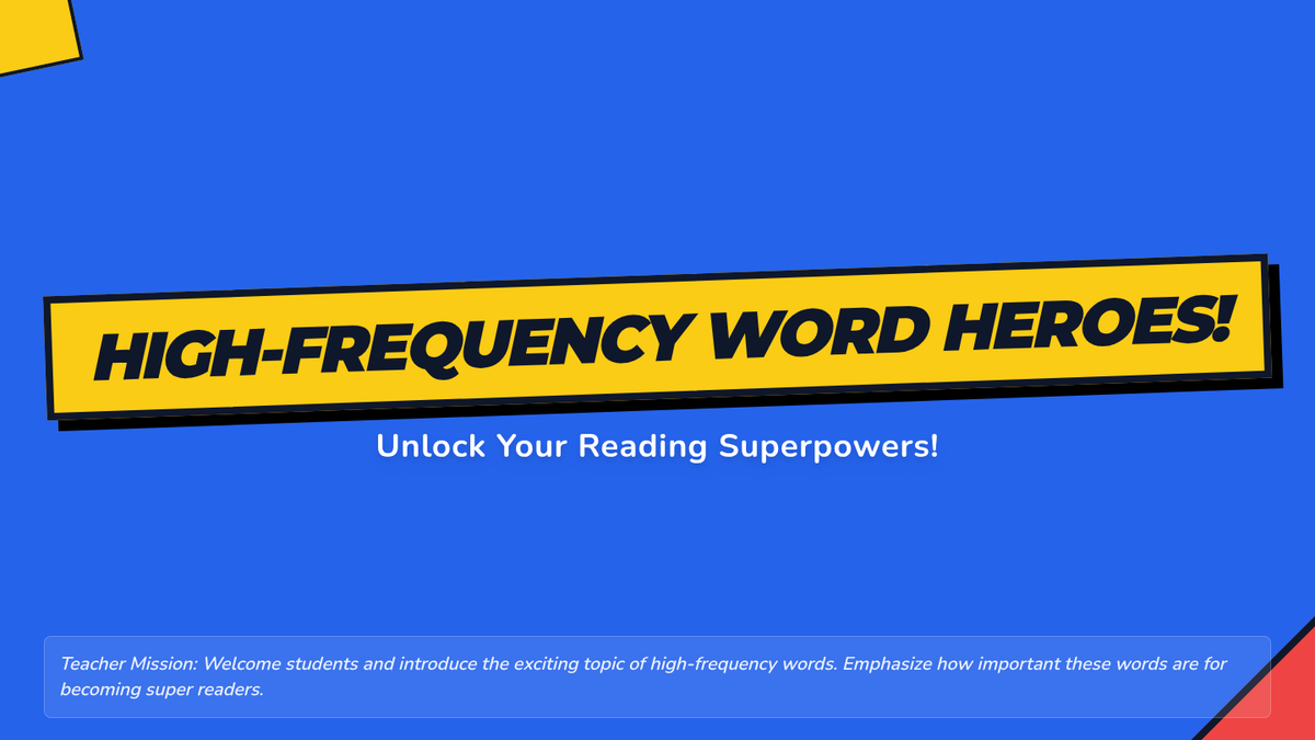 A 30-minute lesson for 4th graders to master high-frequency words through a comic-book-inspired 'hero' theme, featuring interactive slides and hands-on practice.