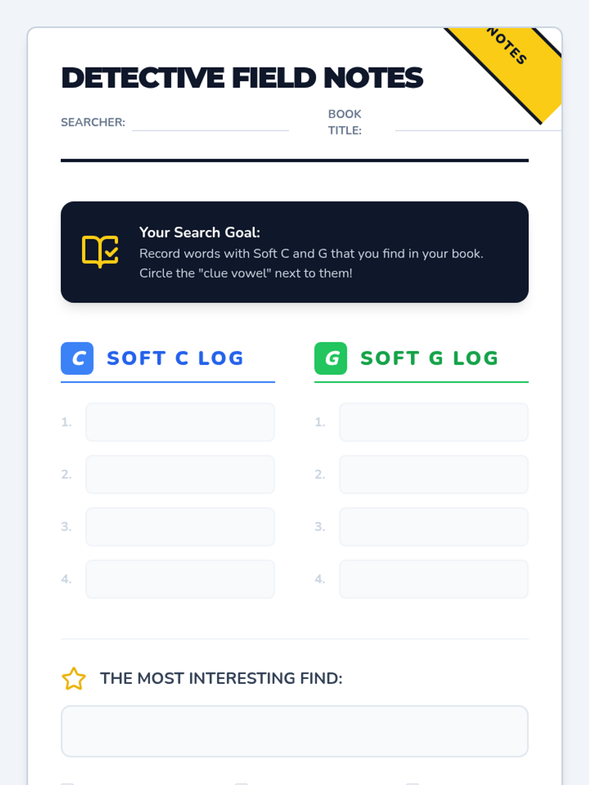 Armed with their rule, students conduct a scavenger hunt in authentic texts to find and categorize words that follow the soft 'c' and 'g' patterns.
