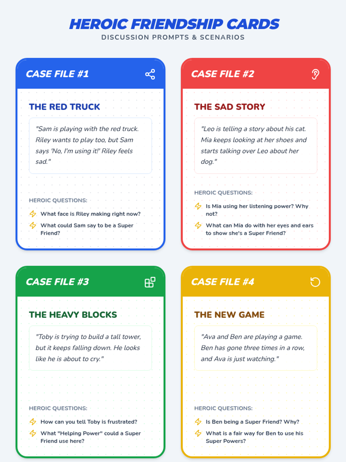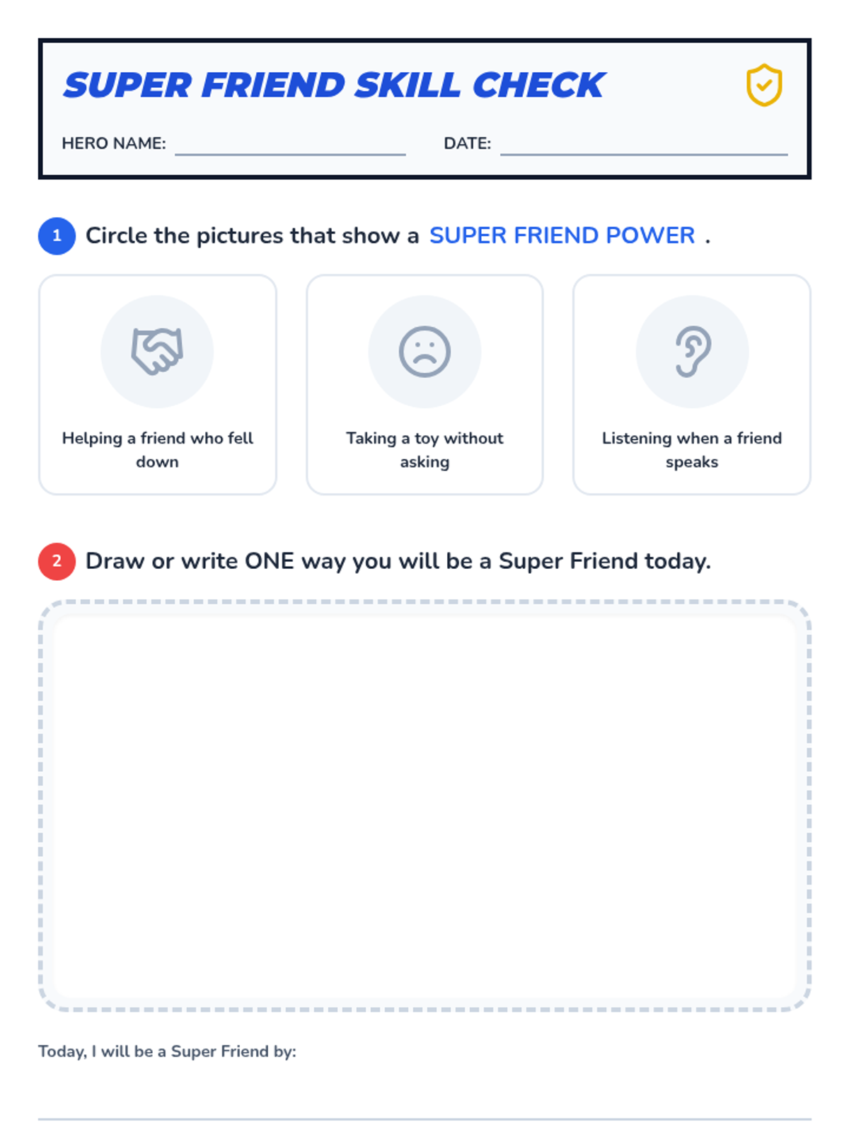 A 30-minute social-emotional learning lesson for 1st grade focusing on positive friendship behaviors like sharing and active listening through a superhero lens.