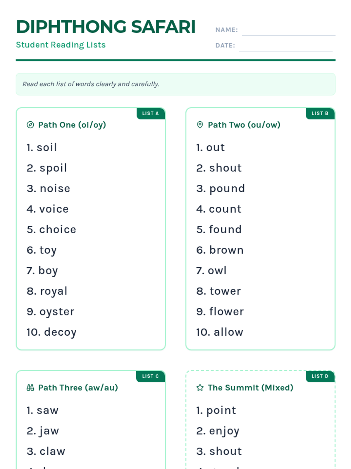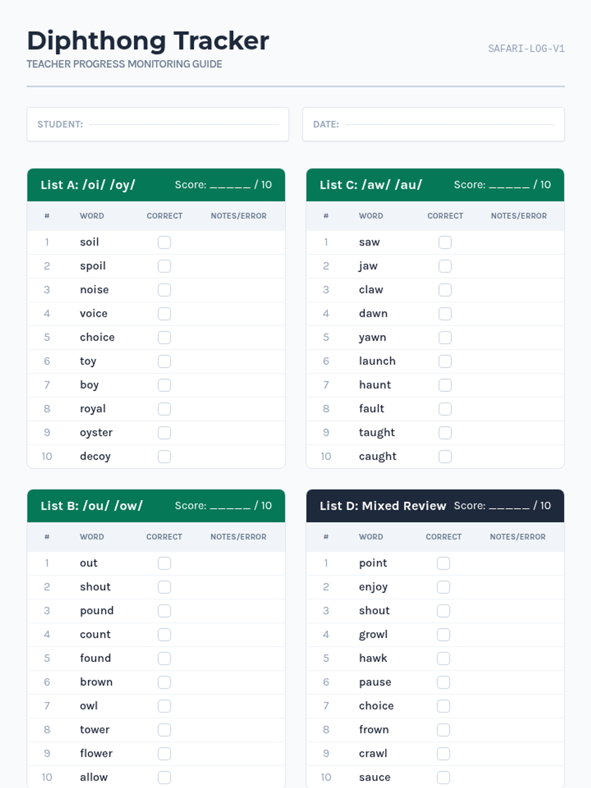 A progress monitoring lesson focused on assessing student mastery of common diphthongs (oi, oy, ou, ow, aw, au). Includes student reading lists and a teacher tracking sheet for data collection.