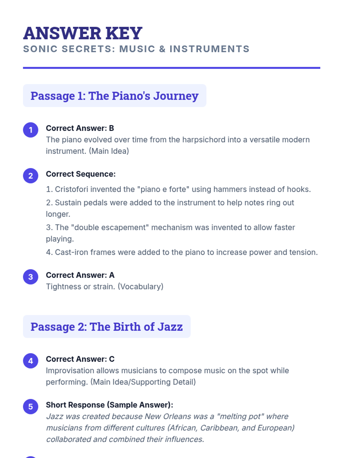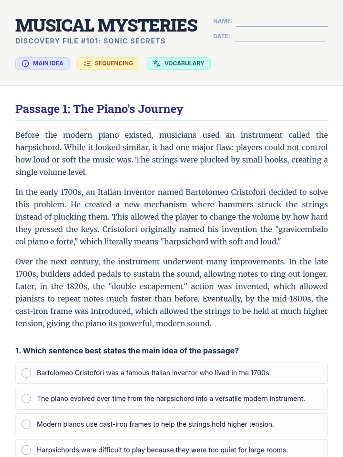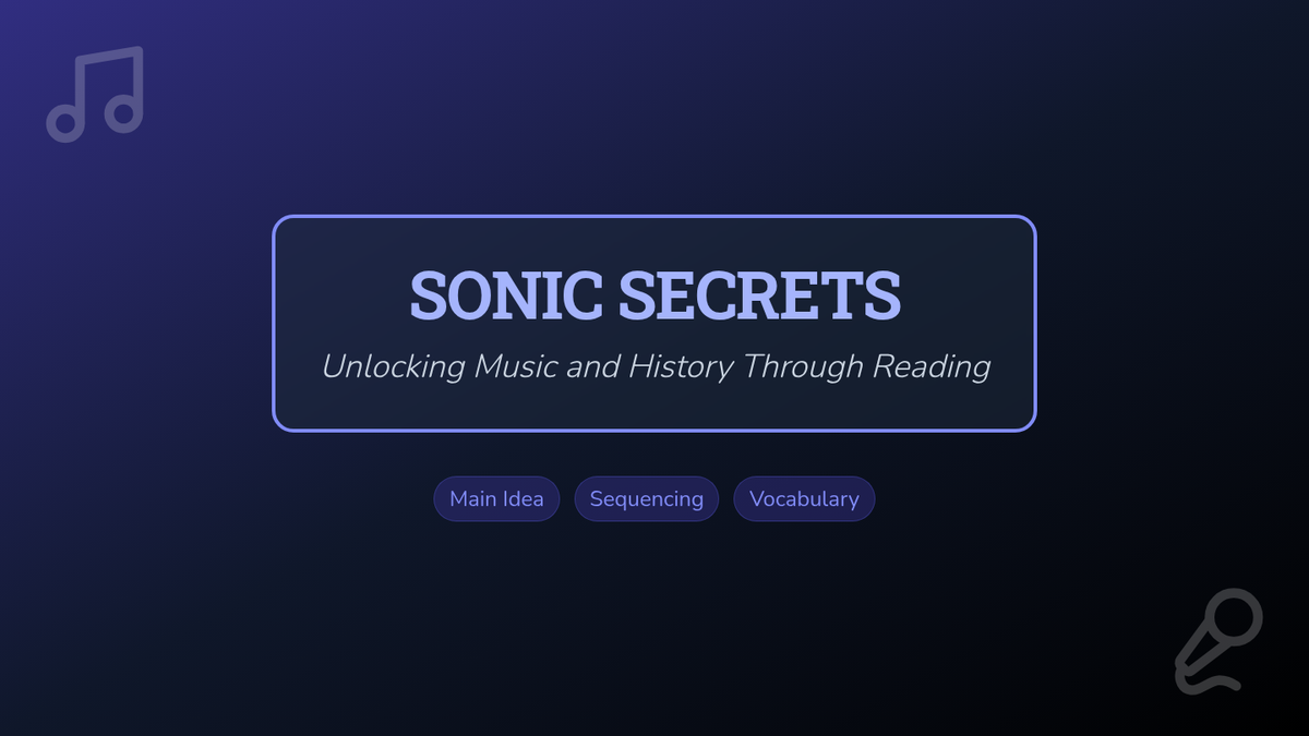 Focuses on informational texts about the history of instruments and the evolution of musical genres. Students practice identifying main ideas, sequencing historical developments, and defining domain-specific vocabulary.