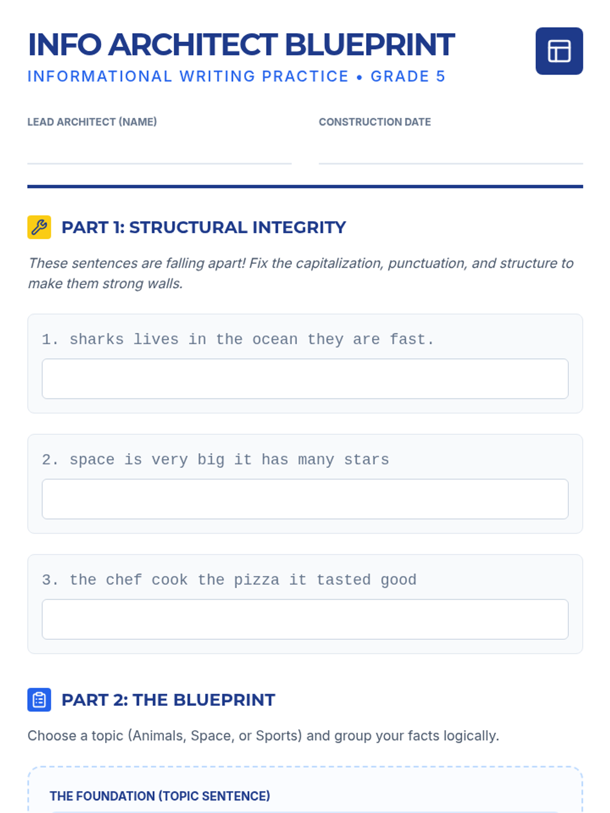 A 30-45 minute ESL lesson for 5th grade focused on informational writing foundations, sentence structure, and logical grouping of ideas. Students learn to act as 'Info Architects' to build solid paragraphs with clear topic sentences and organized details.