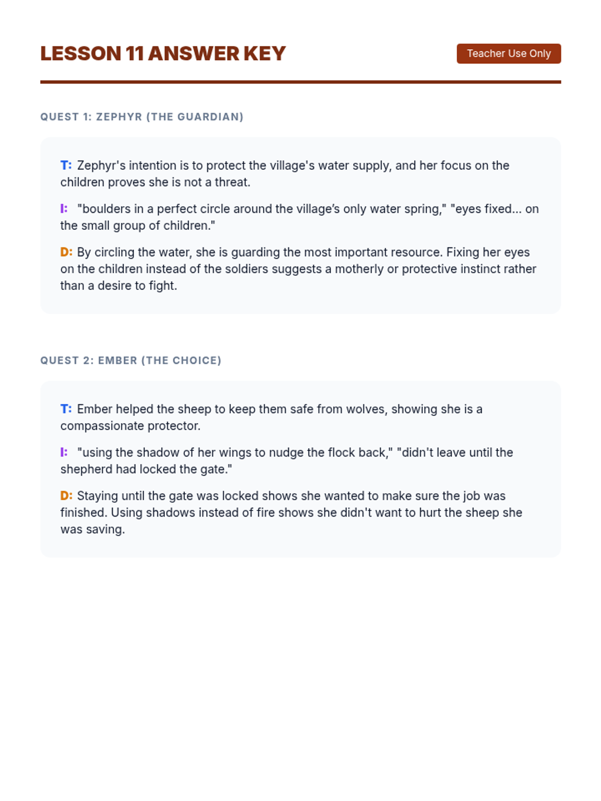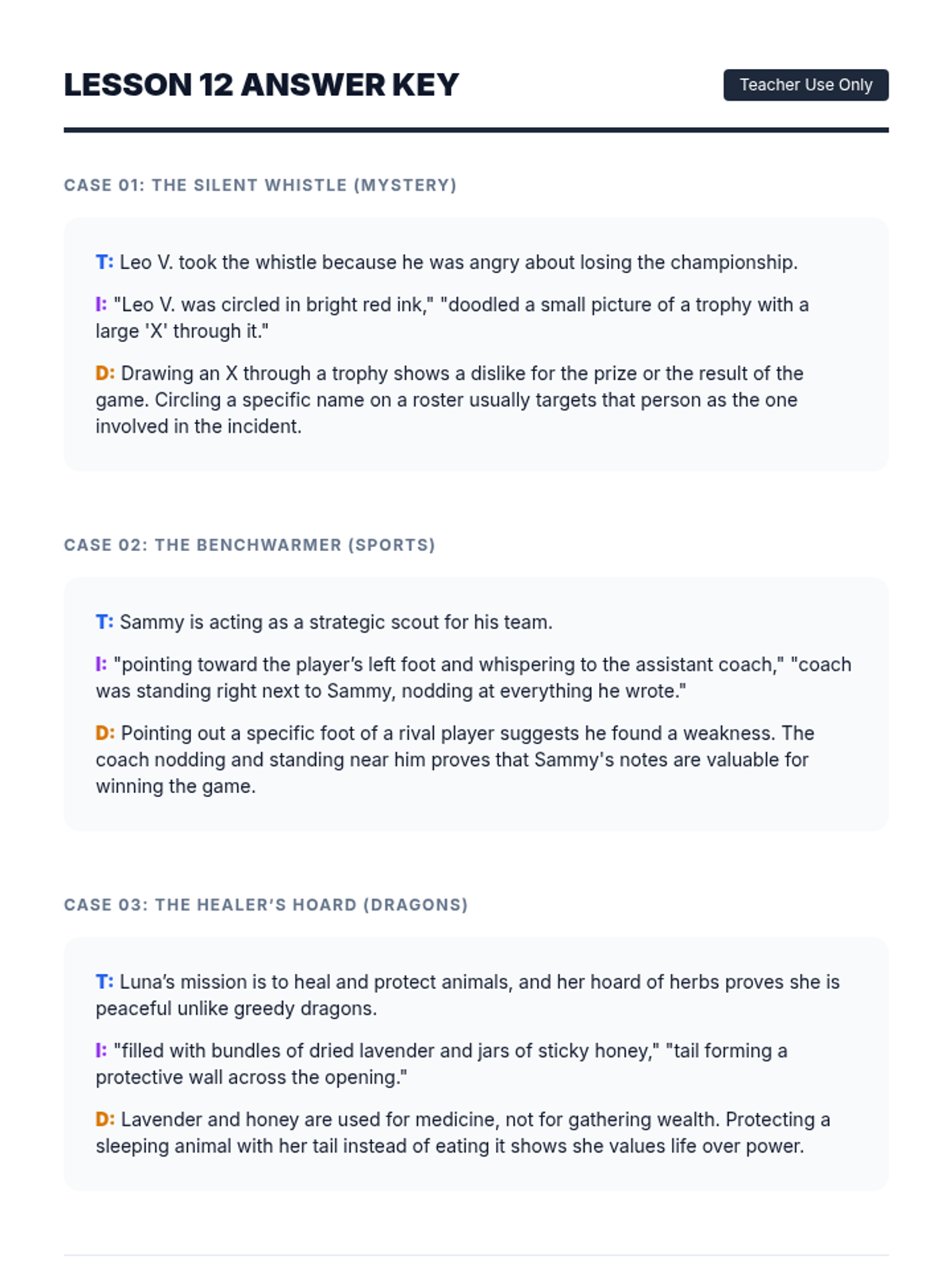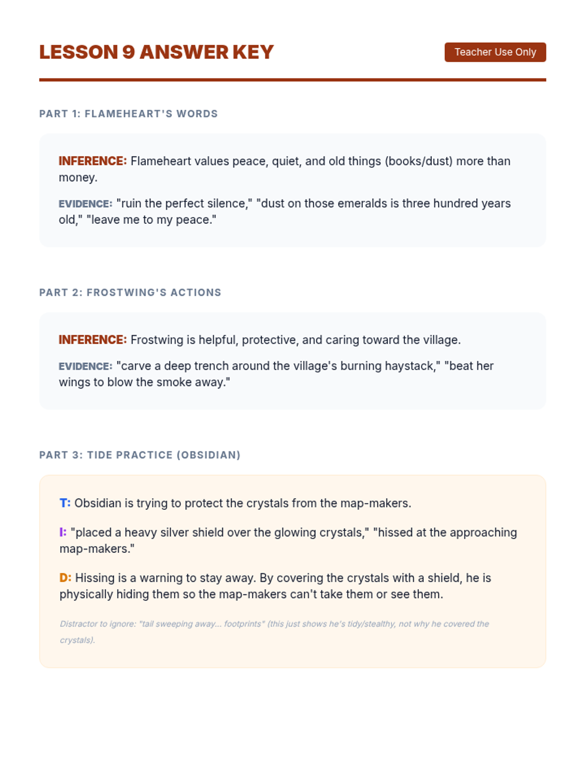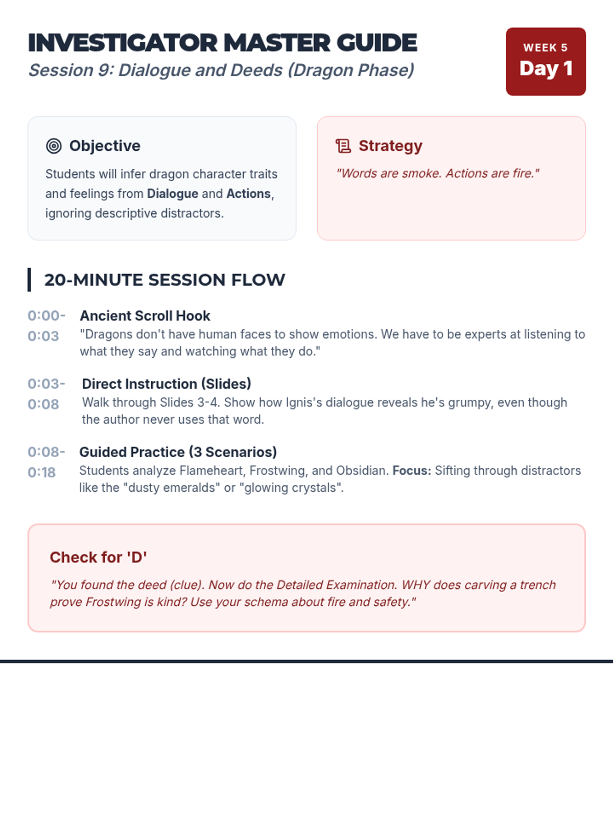 Using dragon-themed fantasy texts, students infer character traits and feelings from dialogue and actions rather than direct statements.