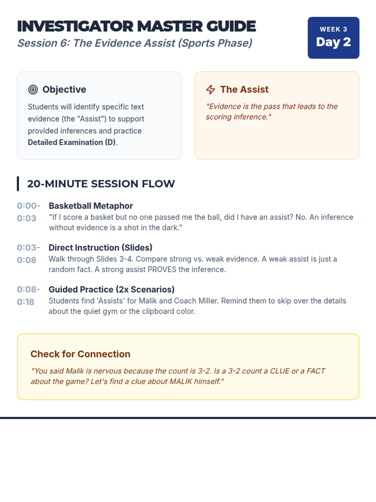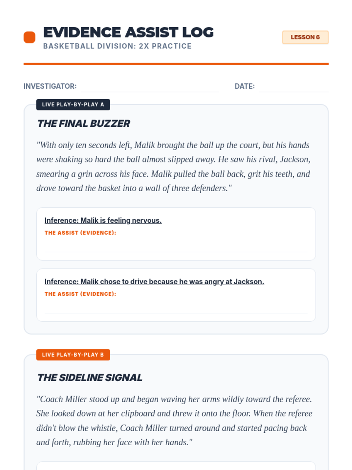 Students focus on how specific evidence "assists" an inference, using basketball play-by-play descriptions.