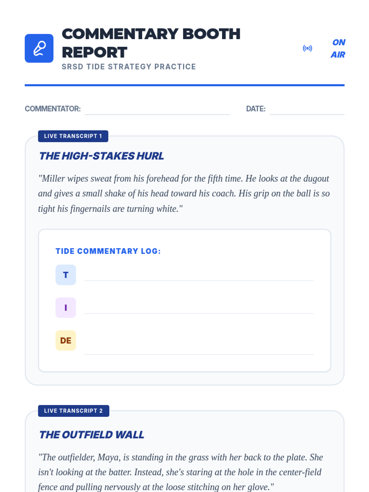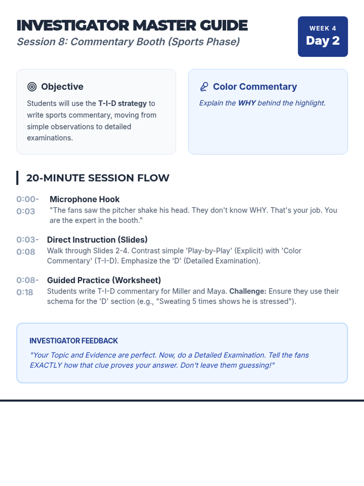 Students use the ICE method (Identify, Cite, Explain) to write a sports commentary response based on text evidence.