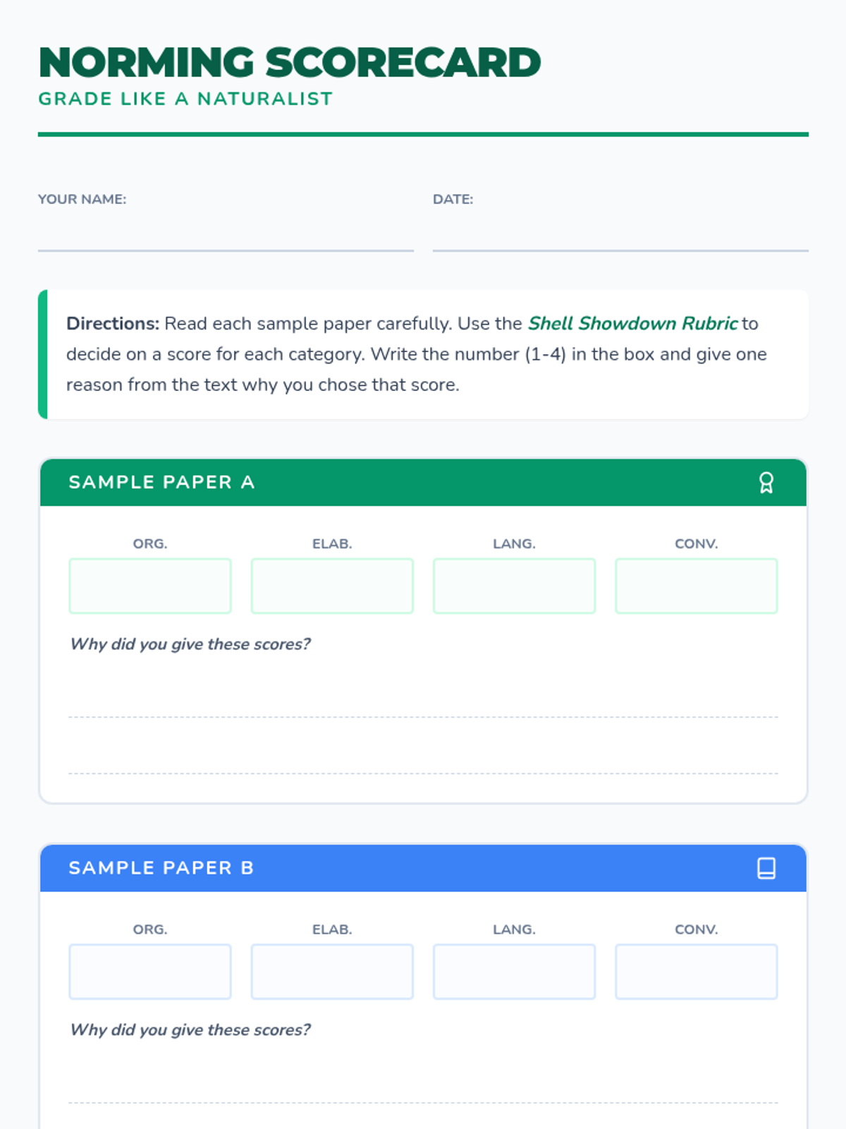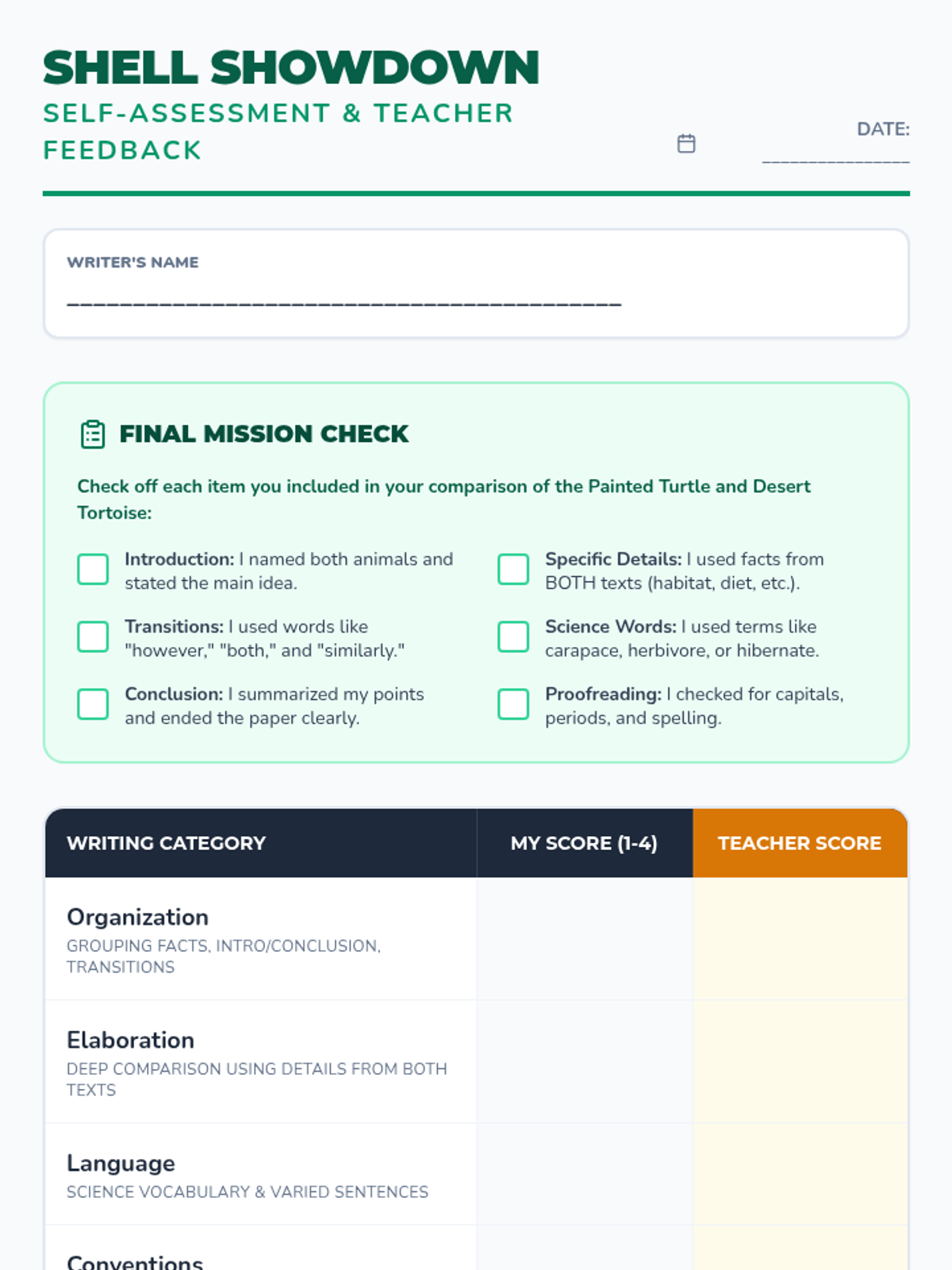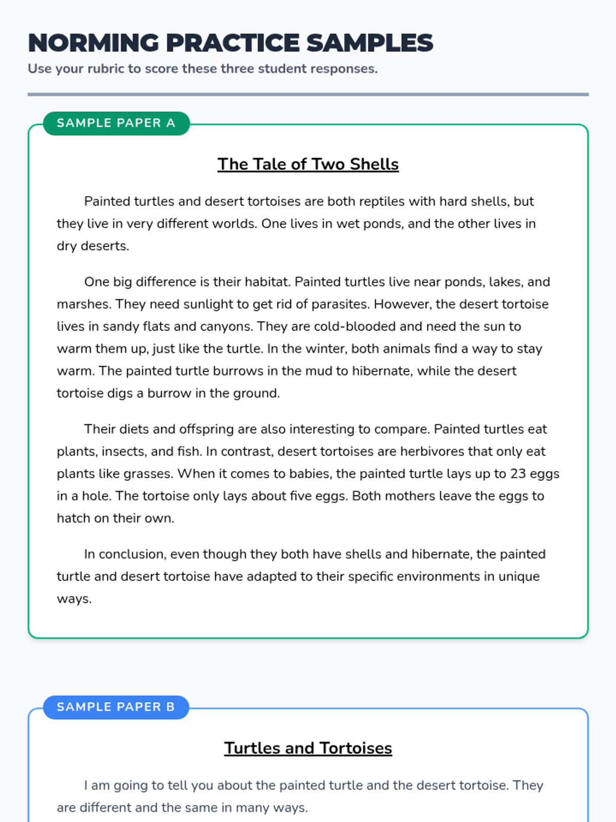 A norming exercise to help 5th-grade students evaluate compare-and-contrast writing about Painted Turtles and Desert Tortoises using a standard rubric.