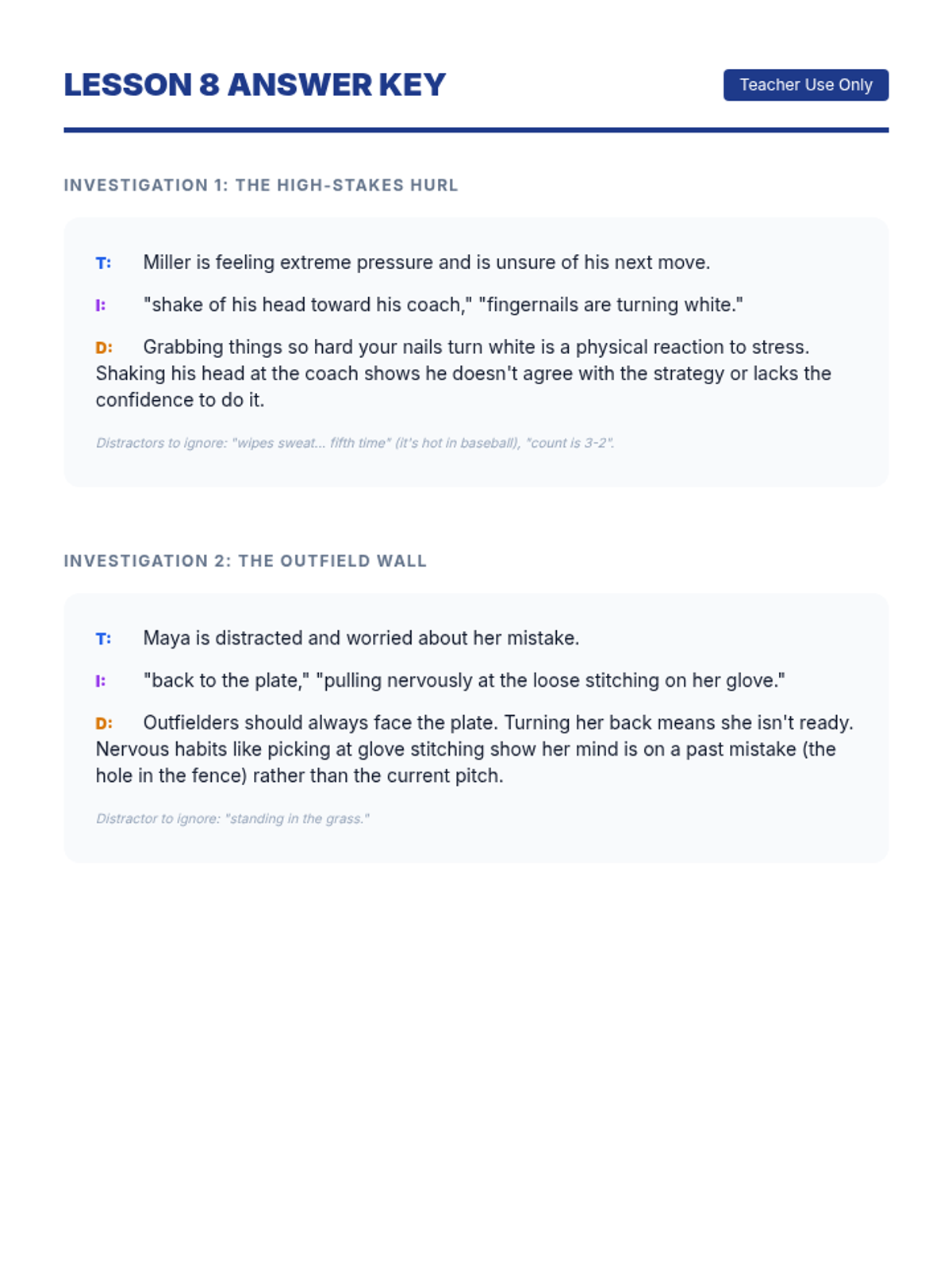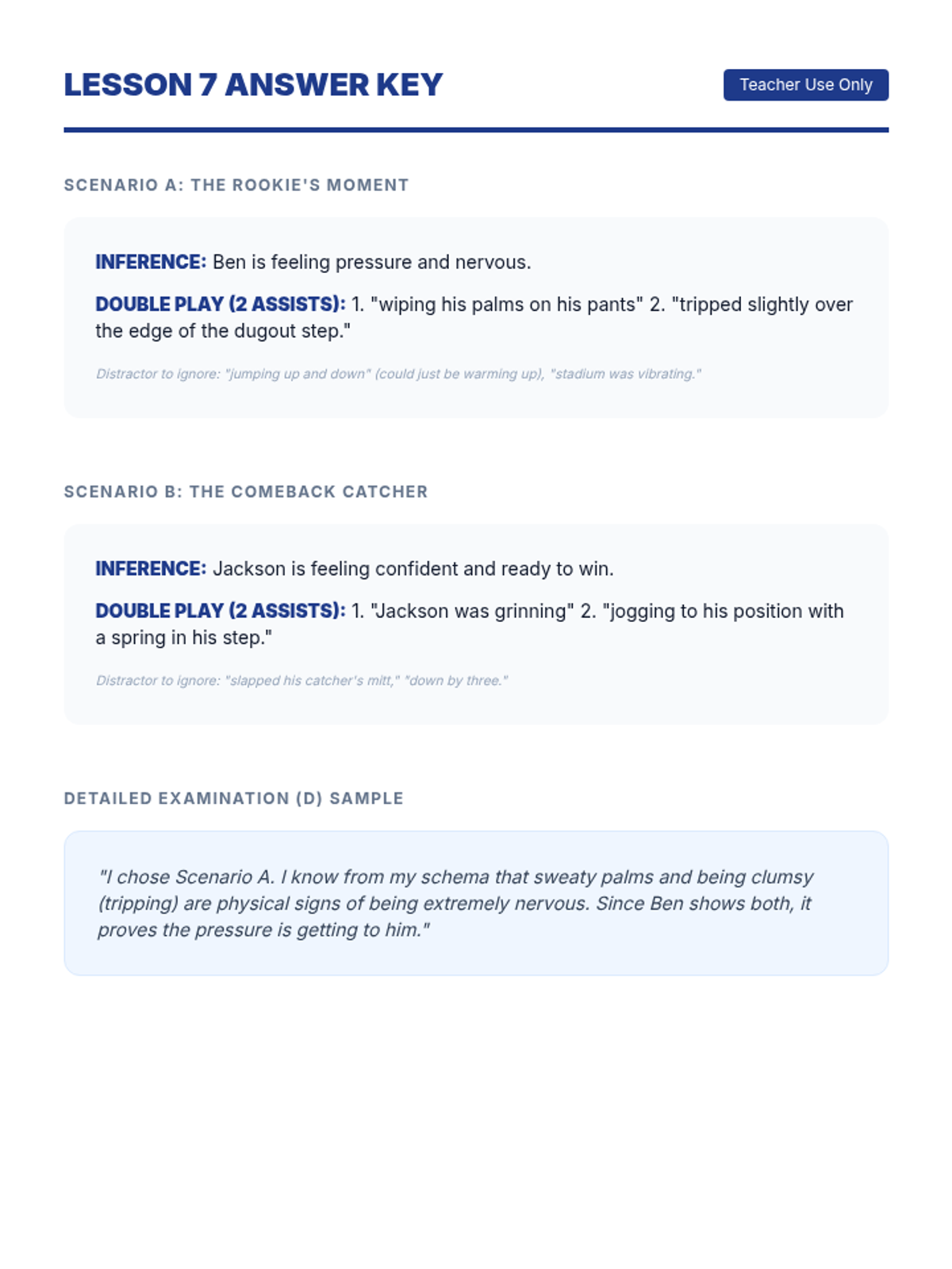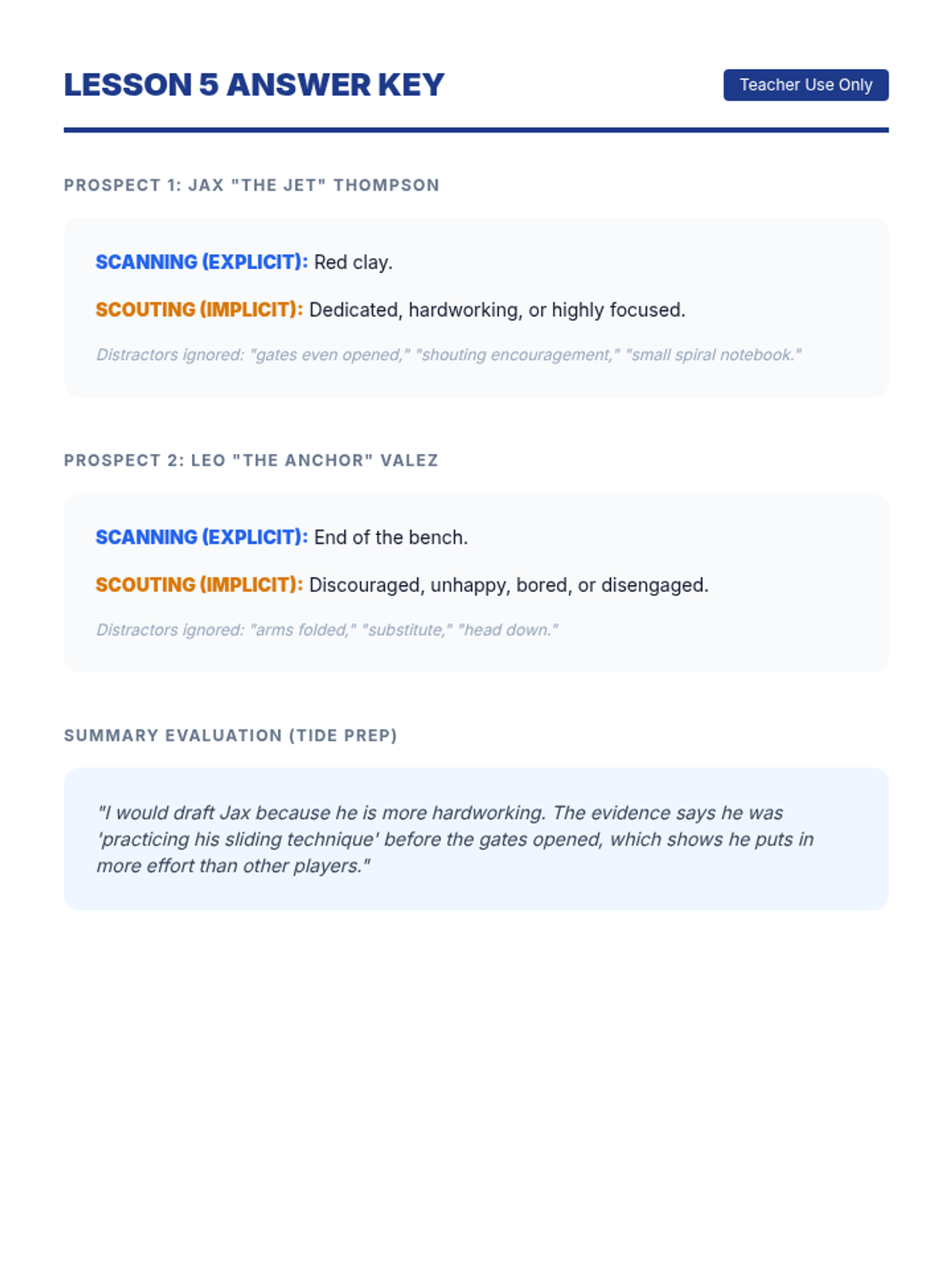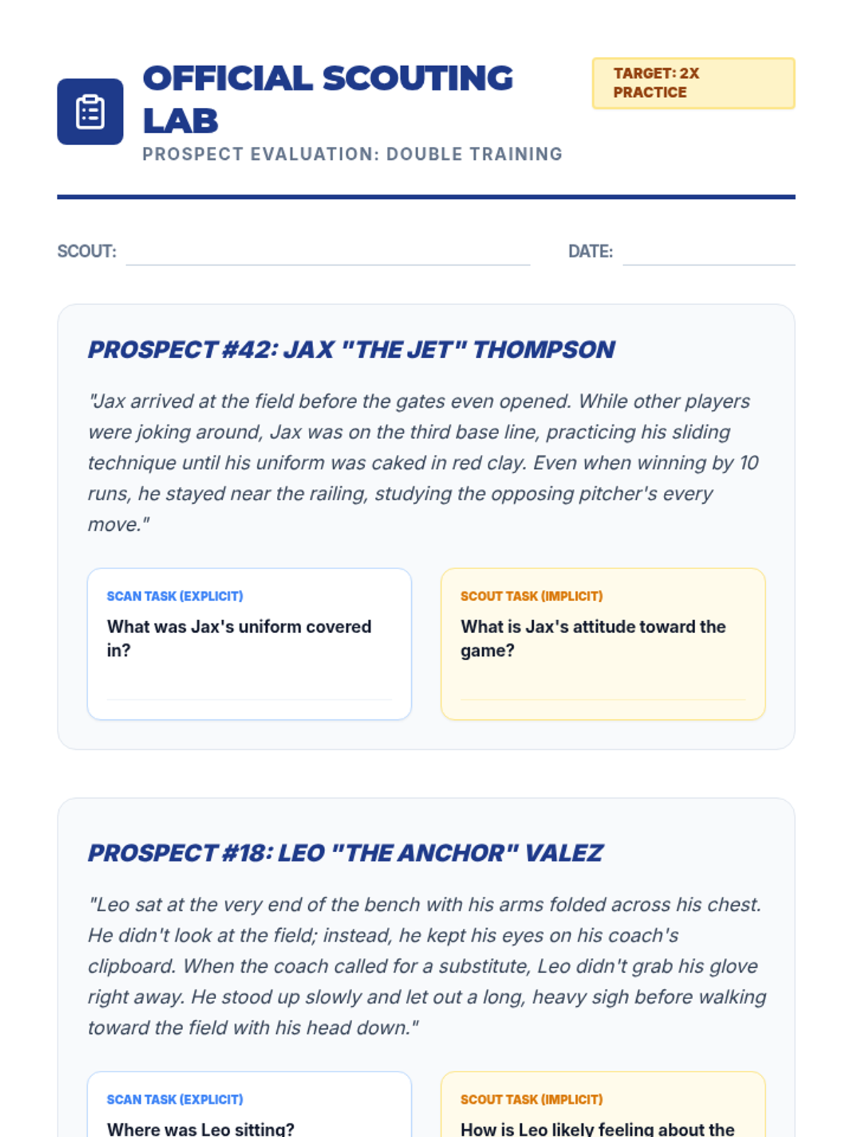 Transitioning to sports themes, students practice scanning for specific details versus inferring meaning from a baseball scouting report.