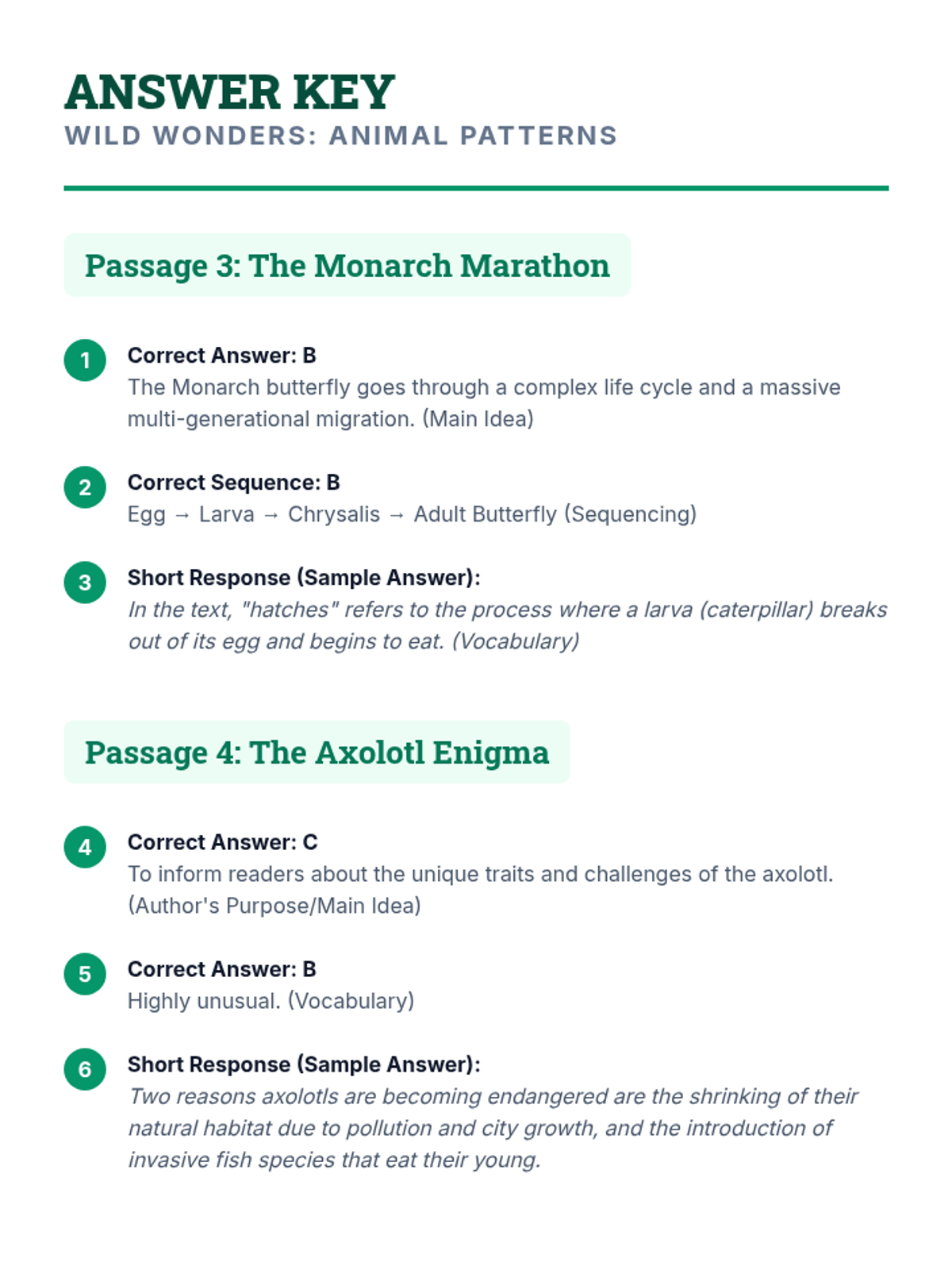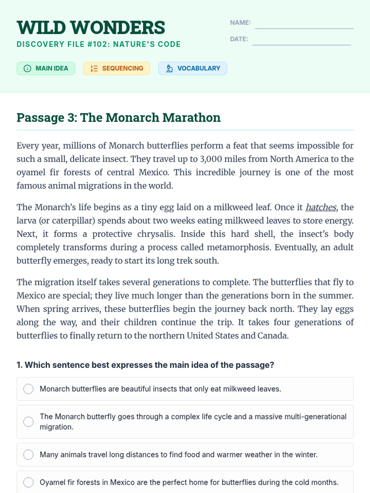 Focuses on informational texts about animal behavior, adaptations, and life cycles. Students apply reading strategies to understand the natural world while reinforcing main idea, sequencing, and vocabulary skills.