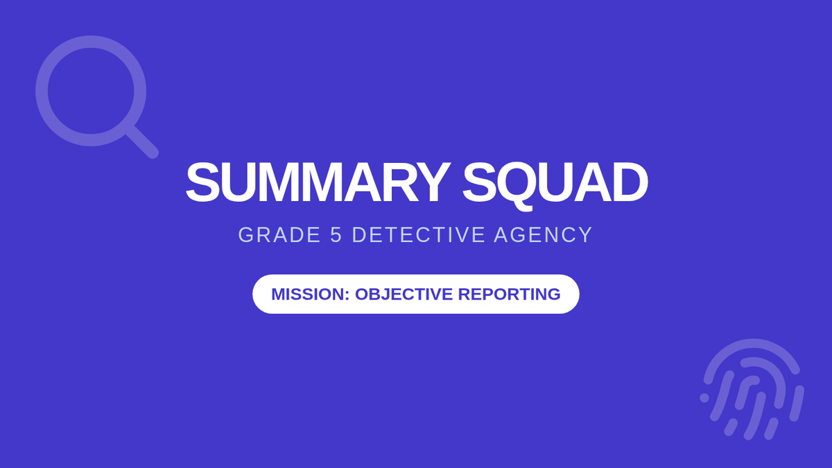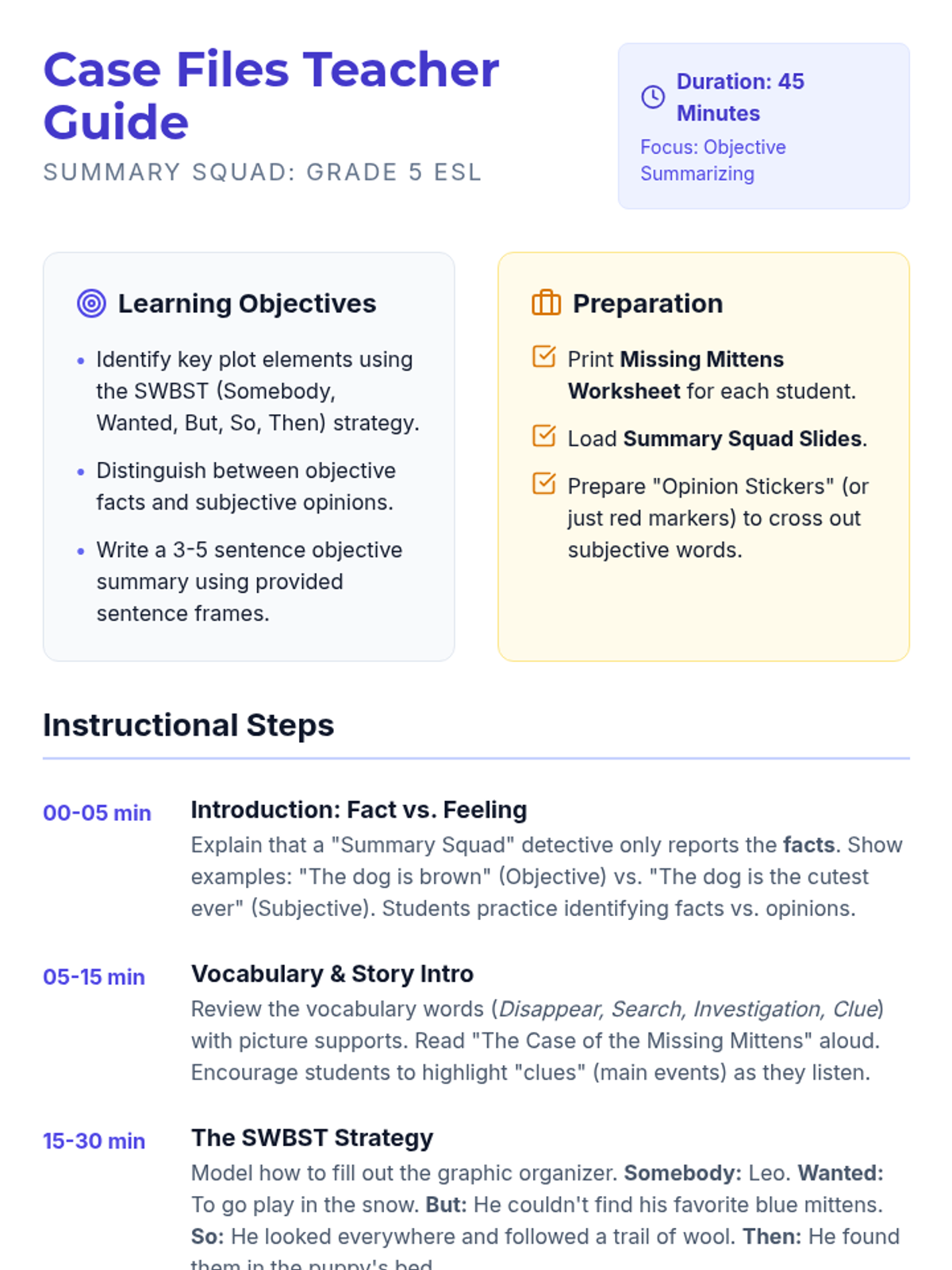 A 30-45 minute ESL lesson for Grade 5 focused on writing objective summaries of a narrative text using the SWBST strategy and detective-themed scaffolds.