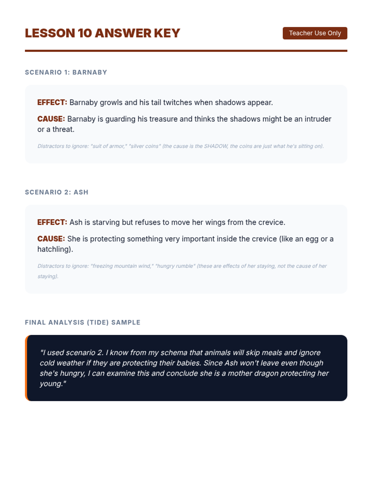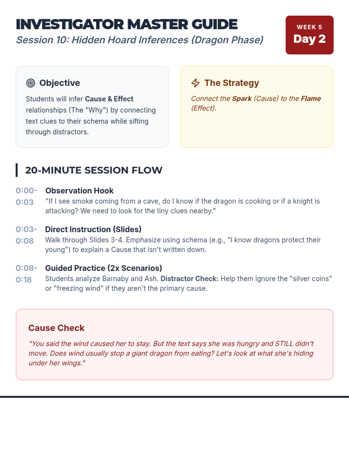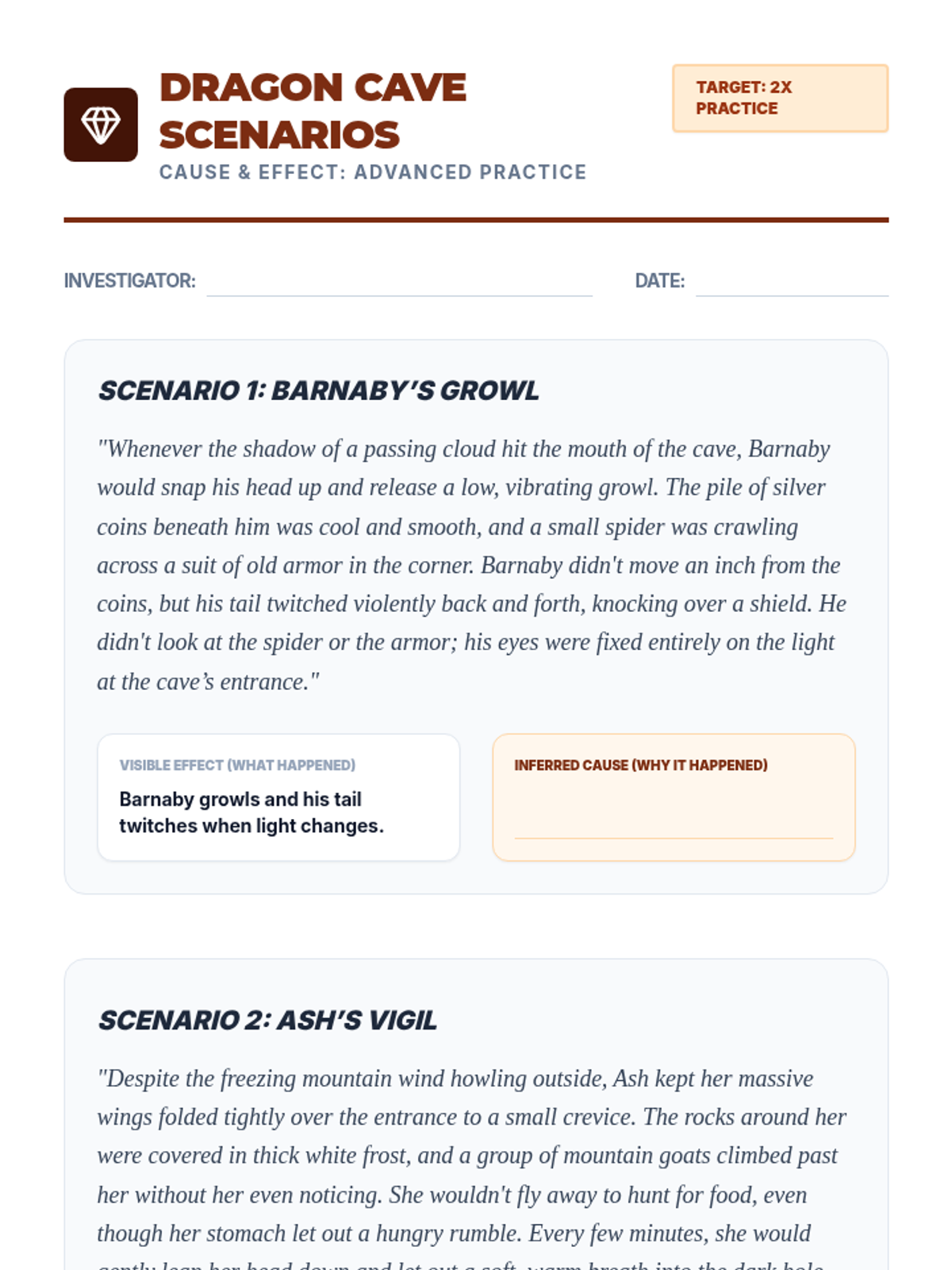 Students infer cause and effect relationships within a complex fantasy setting, focusing on the "why" behind dragon behaviors.