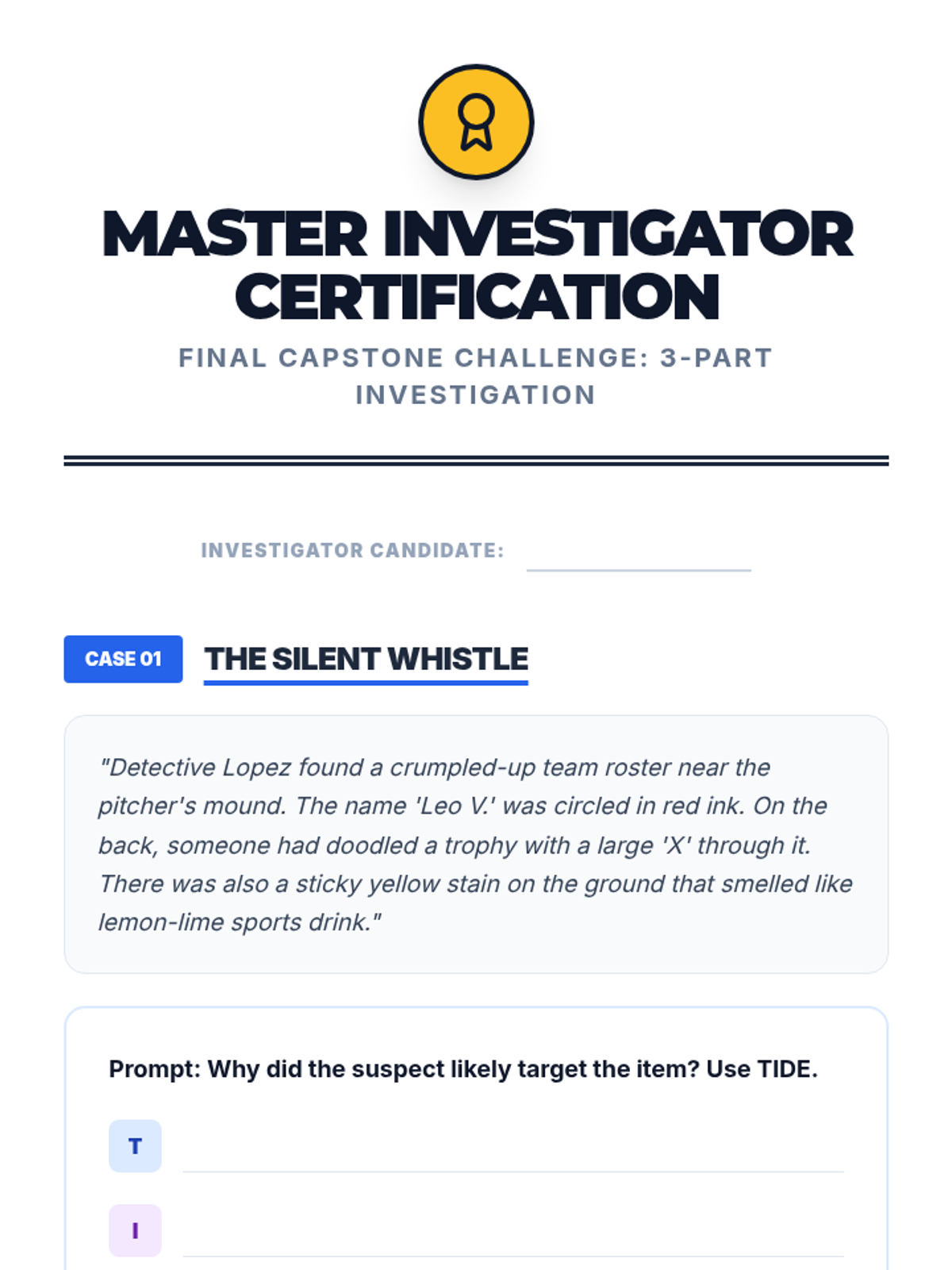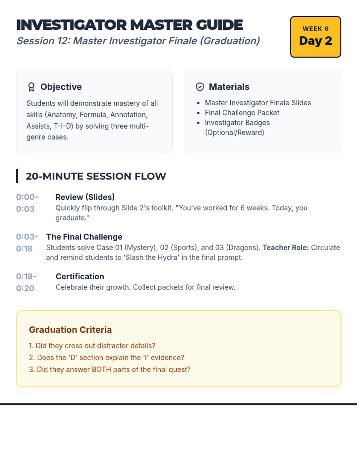 A final capstone session where students apply all skills to a "Master Investigator" mystery challenge involving all previous themes.