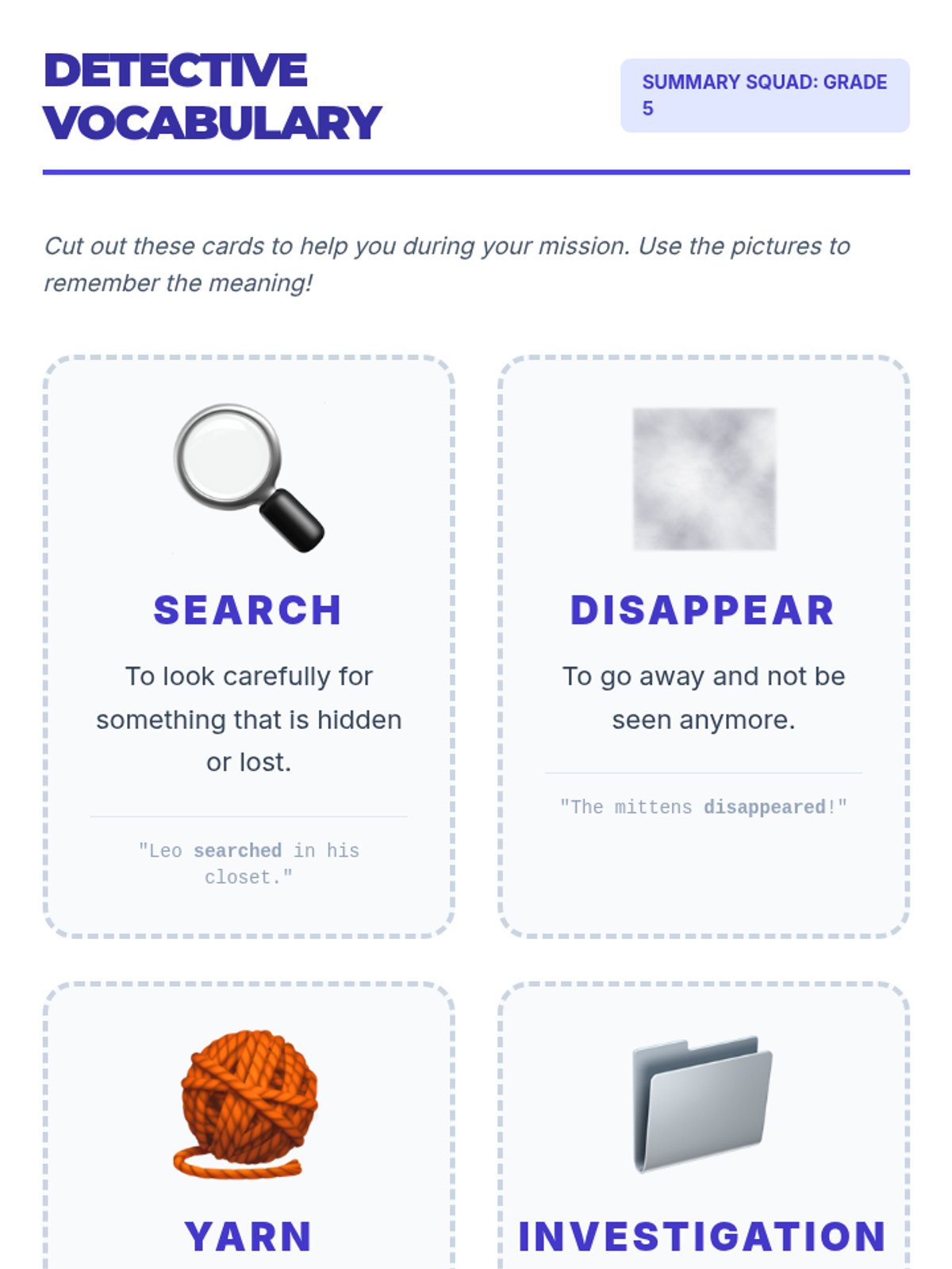 A focused vocabulary lesson targeting ten specific words through definitions, examples, and contextual practice. The lesson includes a comprehensive review sheet and an accompanying answer key to prepare students for a summative quiz.